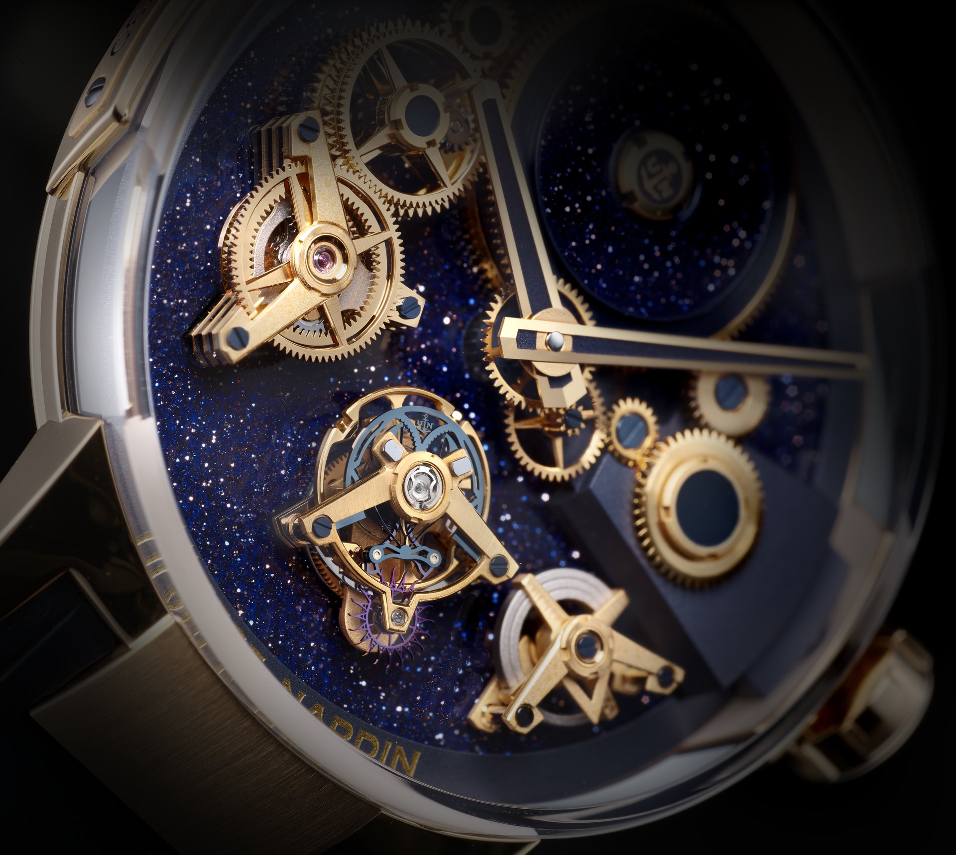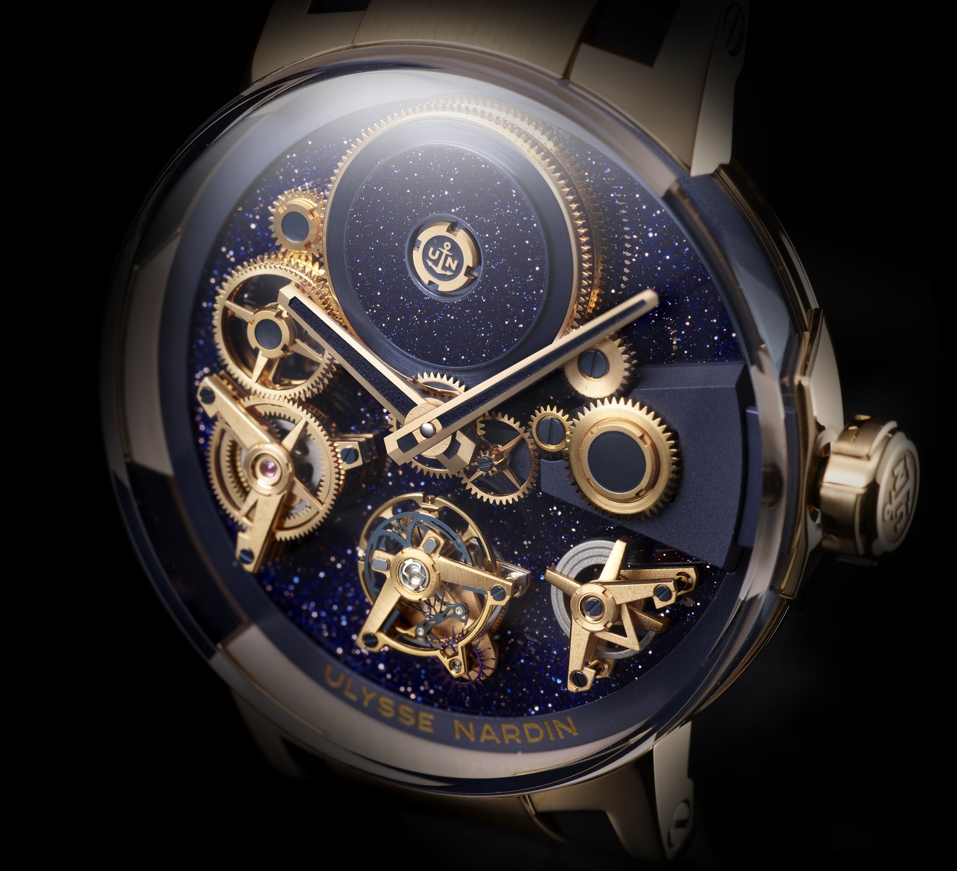 The deep blue aventurine dial is reminiscent of the starry night sky glittering with reflections of the stars. A form of translucent quartz, the name “aventurine” derives from the Italian a ventura, which can mean “by chance” or simply “let the adventure begin”. Also used in the Ulysse Nardin men’s Blue Aventurine Genghis Khan 789-80, this mineral’s aventurescence provides a shimmering effect often seen by sailors contemplating the ocean’s surface in the dark of night.