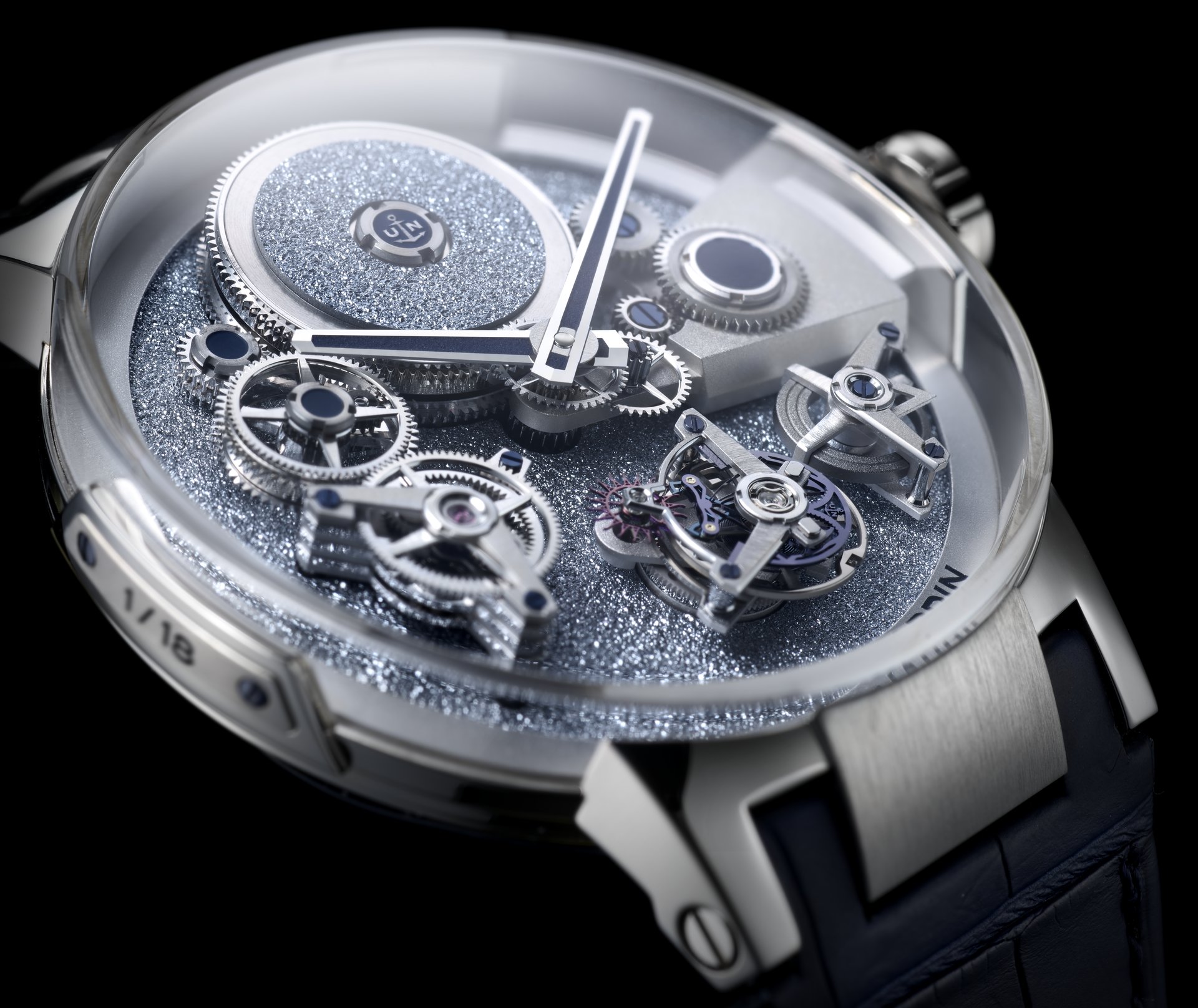 With a dial made from osmium – which is not only the world’s heaviest metal but also the rarest and densest, most stable element – this version of the Free Wheel has a white gold case which frames the diamond-like osmium crystals. Osmium, atomic number 76 in the Periodic Table of the Elements, is a trace element found in alloys mostly in the platinum group and used by manufacturers when extreme hardness is required. Incandescent, it is a siren song of engineering and aesthetics.