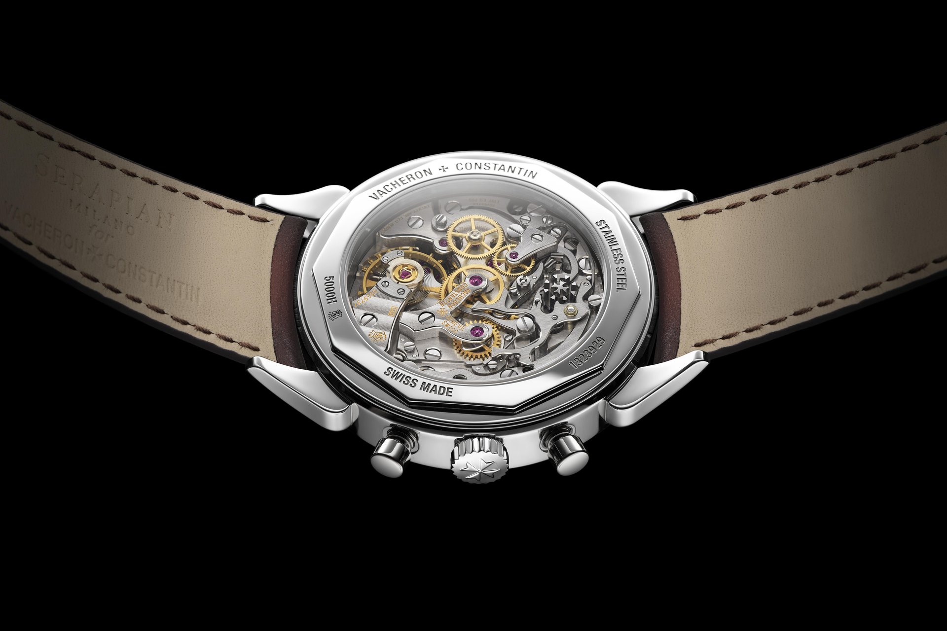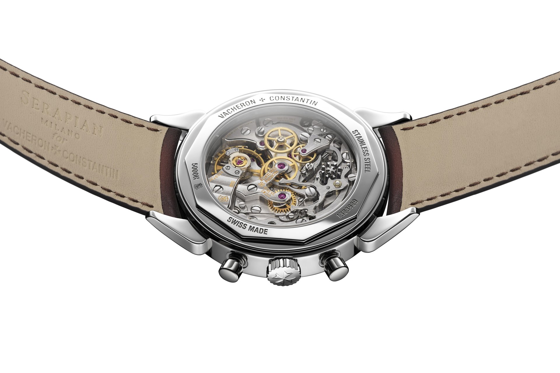 As part of its Historiques collection, Vacheron Constantin presents a steel version of its emblematic “Cornes de vache” model, the Maison’s first water-resistant chronograph launched in 1955. Immediately recognisable by its distinctive cow horn-like lugs, this model is now one of the most sought-after among collectors. This reissue, aesthetically faithful to the original, is adapted to current watchmaking standards. The diameter of the case, which is water-resistant to 30 metres, has been increased to 38.5 mm. It now houses manual-winding chronograph Calibre 1142, beating at 21,600 vibrations per hour and endowed with a 48-hour power reserve. This movement powers timekeeping functions including small seconds as well as chronograph functions with a central seconds hand and minutes counter appearing on a grey velvet-finish opaline dial, embellished with two snailed counters and a white counter. The crafting of the strap in patinated dark brown calf leather was entrusted to the traditional Milanese leather goods Maison Serapian, founded in 1928, which has thus undertaken its first collaborative endeavour with Vacheron Constantin.