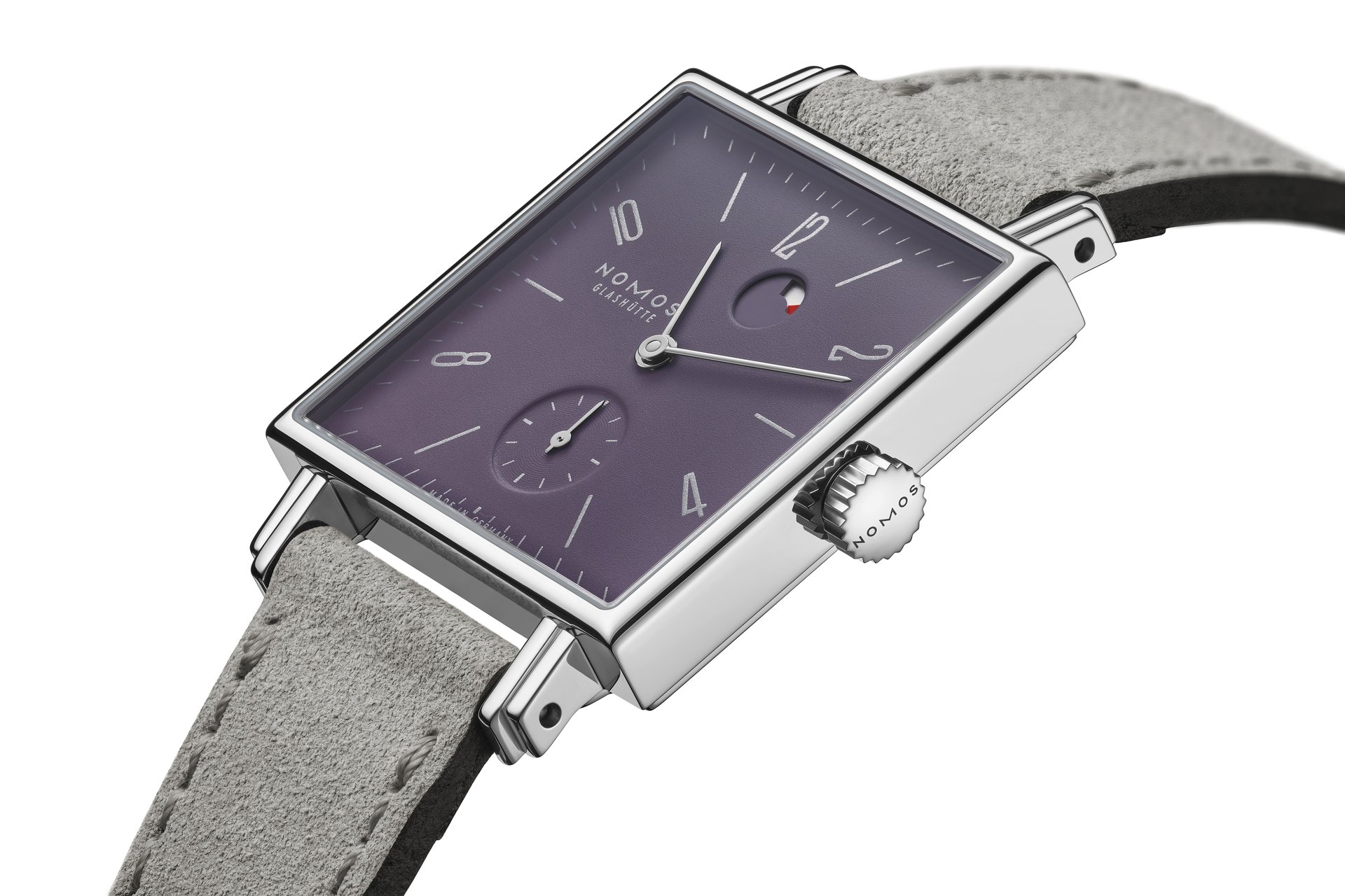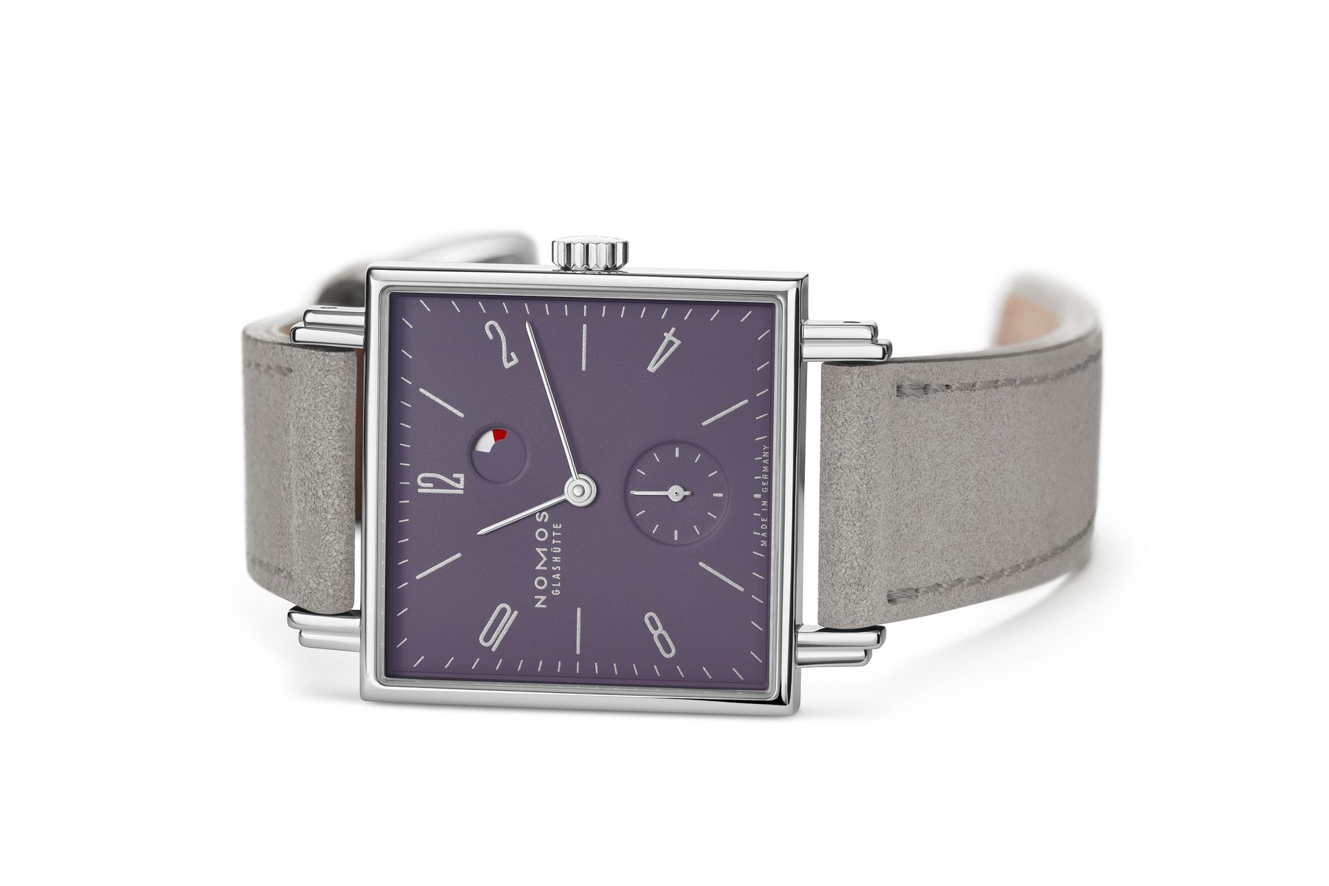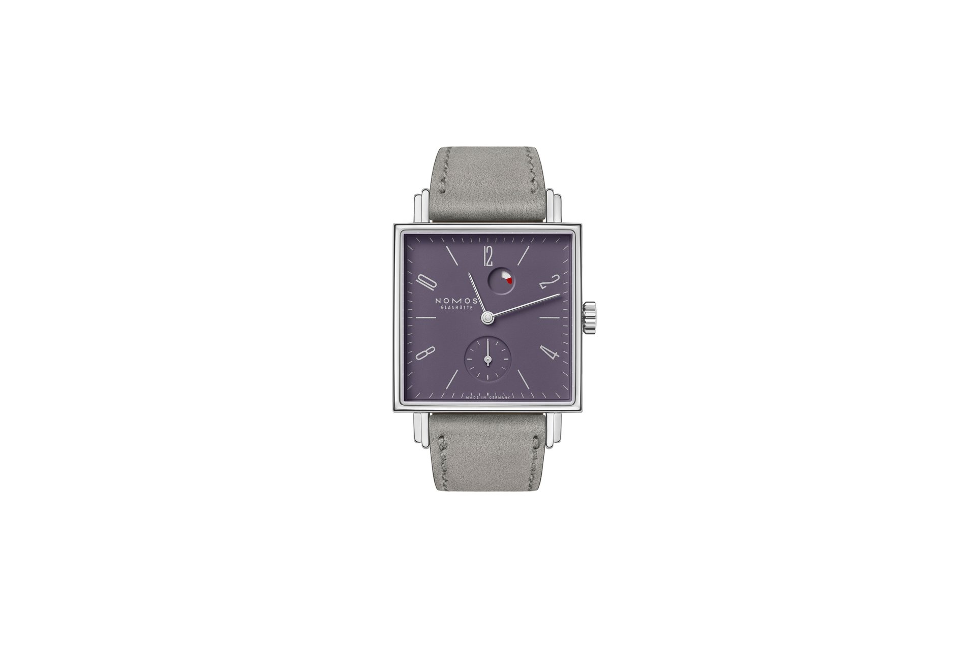 Measuring 29.5 by 29.5 millimeters, Tetra plum has a character all of its own—and additional functionality. The eye-catching complication between twelve and one o’clock is a power reserve indicator, reminding the wearer when it is time to wind the watch. Tetra plum is powered by the hand-wound NOMOS calibre DUW 4301, which also features the NOMOS swing system—itself a fruit of many years of labour. This proprietary escapement is designed and developed in-house, which is an exceptional achievement in the watchmaking world. Having this technological capability allows NOMOS to ensure the quality of its calibres—and the reliability of its watches.