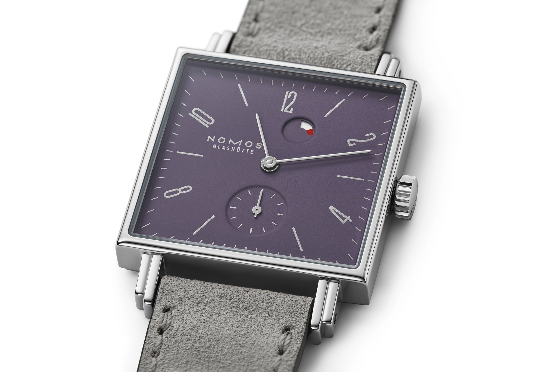 Tetra plum may be brand new, but the Tetra model from NOMOS Glashütte is a classic design. Known for its square case and angular typography, Tetra has been part of the NOMOS collection for over 25 years. It is incredibly thin for a mechanical watch, with lugs that are almost delicate—which is why they are doubled. The round sub-seconds dial adds a contrasting touch to the clean-cut corners found elsewhere in Tetra. The overall aesthetic is harmonious and modern, with a timeless elegance that suits a wide range of wrists. Tetra plum will be available at selected retailers from October.