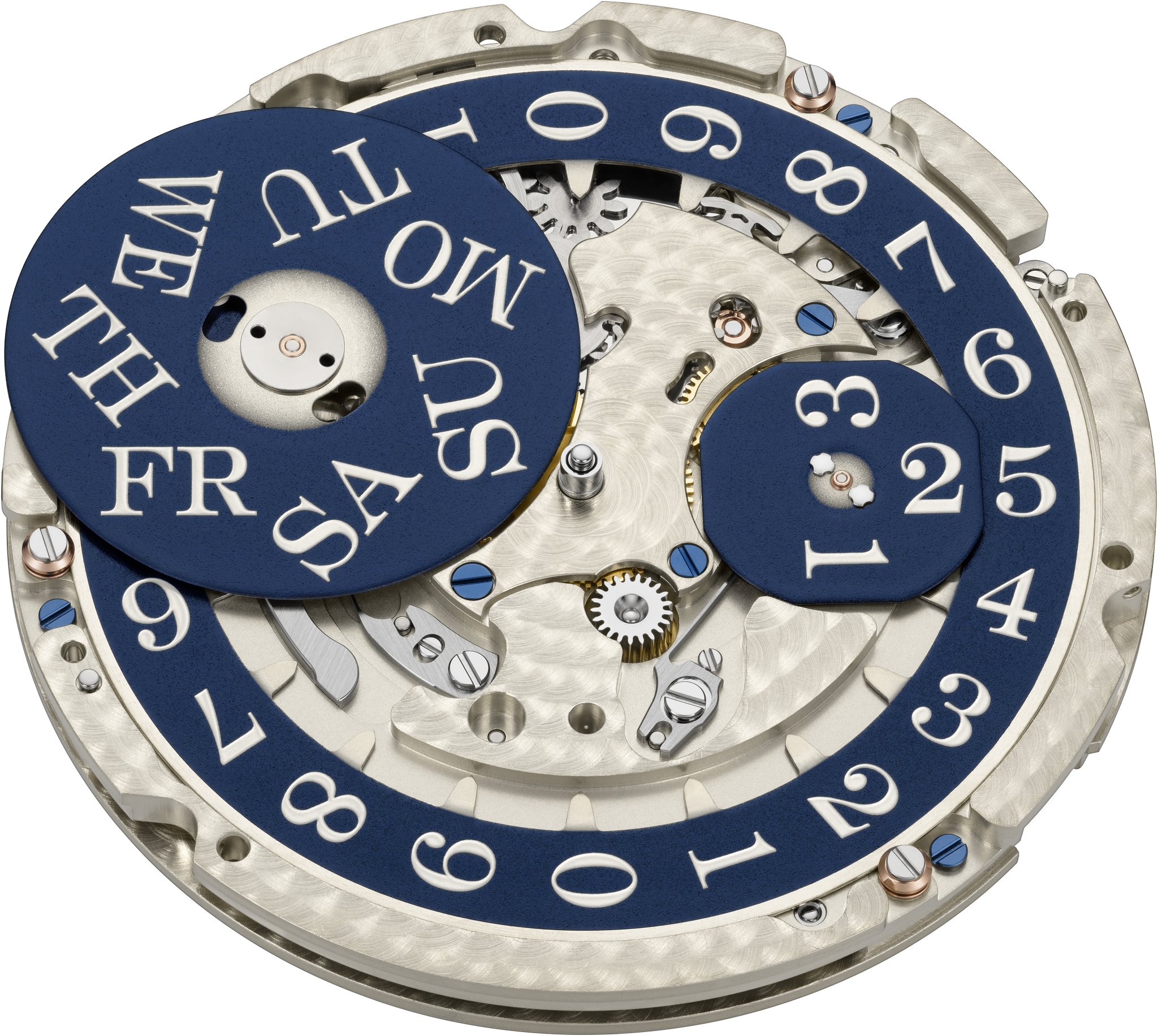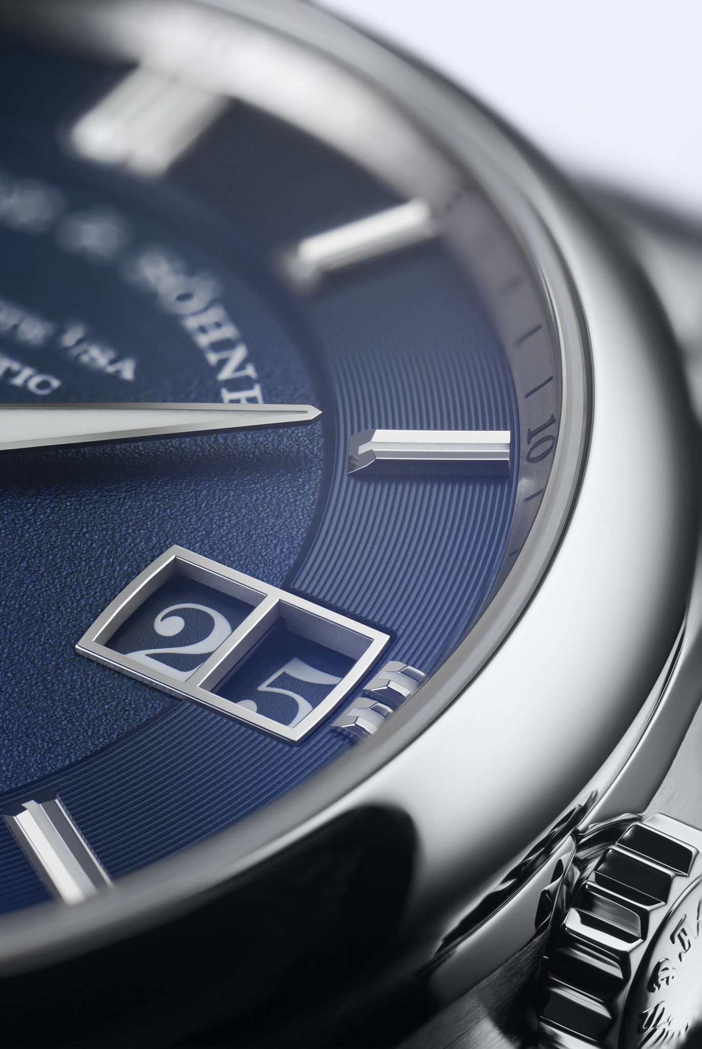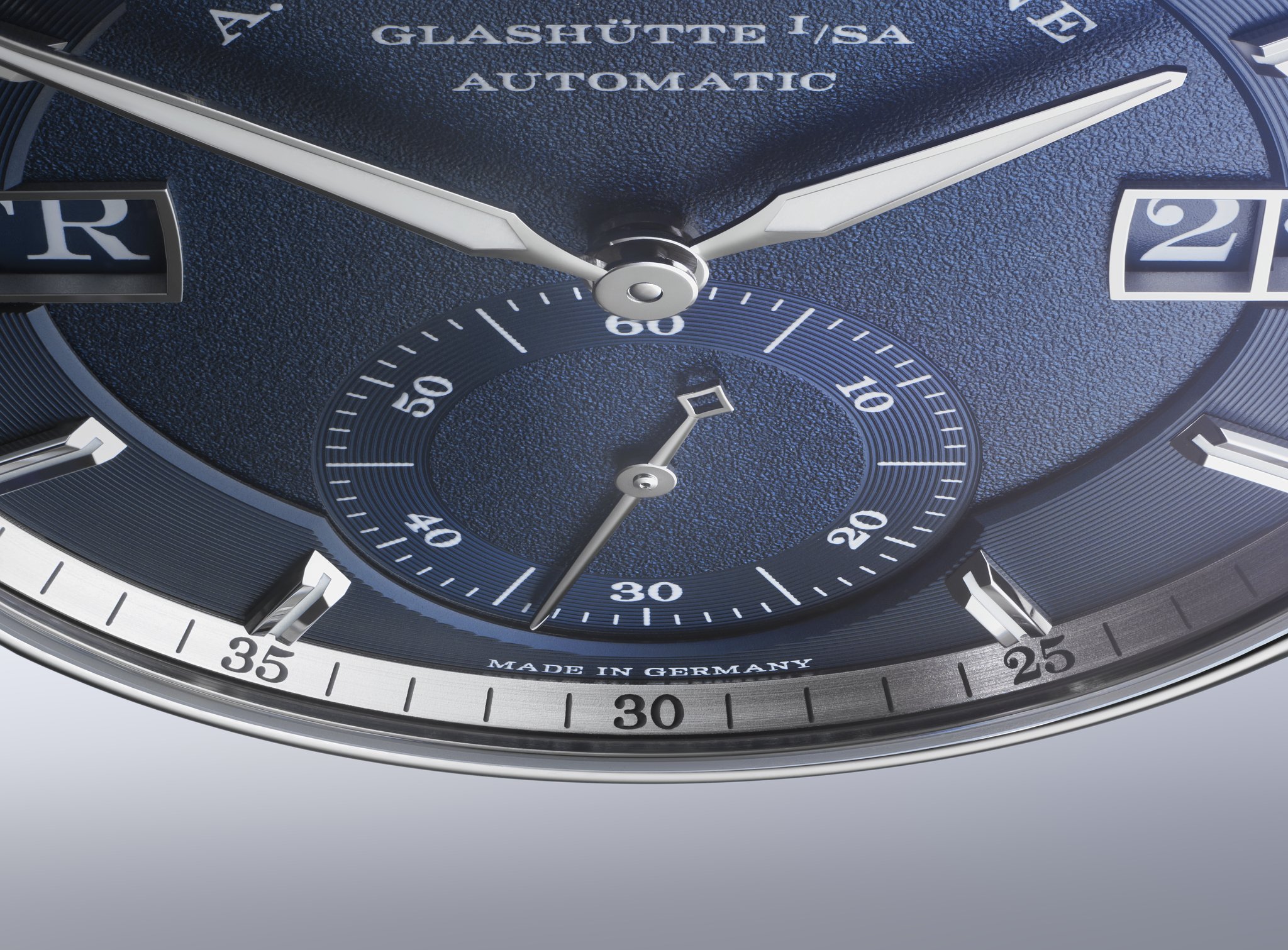 What first meets the eye on the dark-blue dial is the day-of-week and date display. Located on the right, the Lange outsize date in the classic double aperture is complemented with an equally large day-of-week display on the left. The outer verticals of the frames echo the curvature of the bezel. The typical Lange font is used for both displays, though here, the numerals and letters are white against a blue background. The newly developed mechanism consists of 99 individual parts.