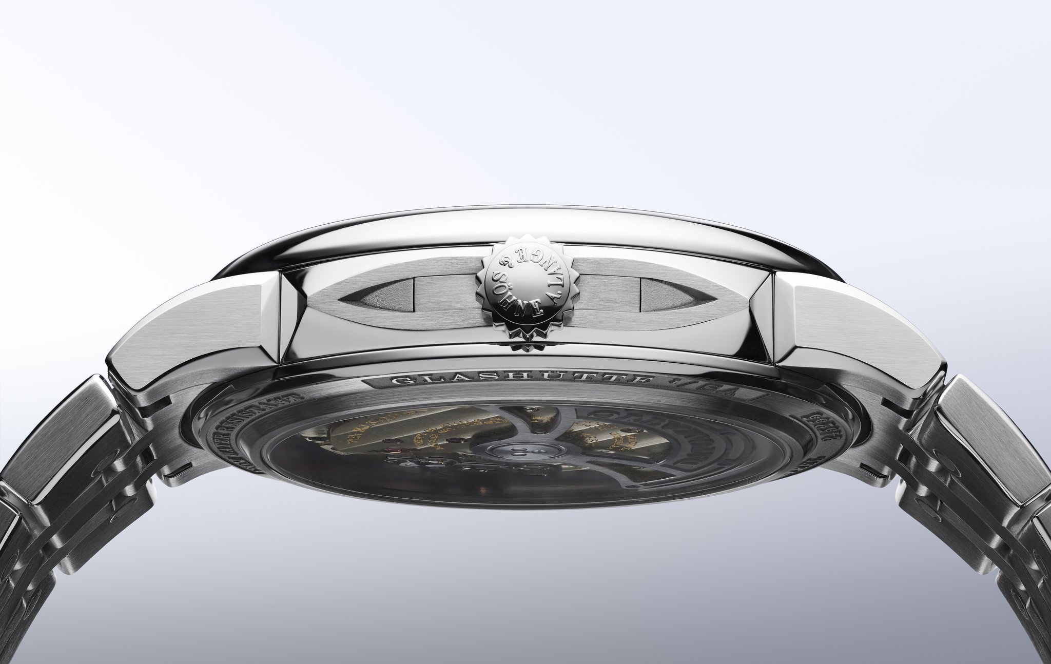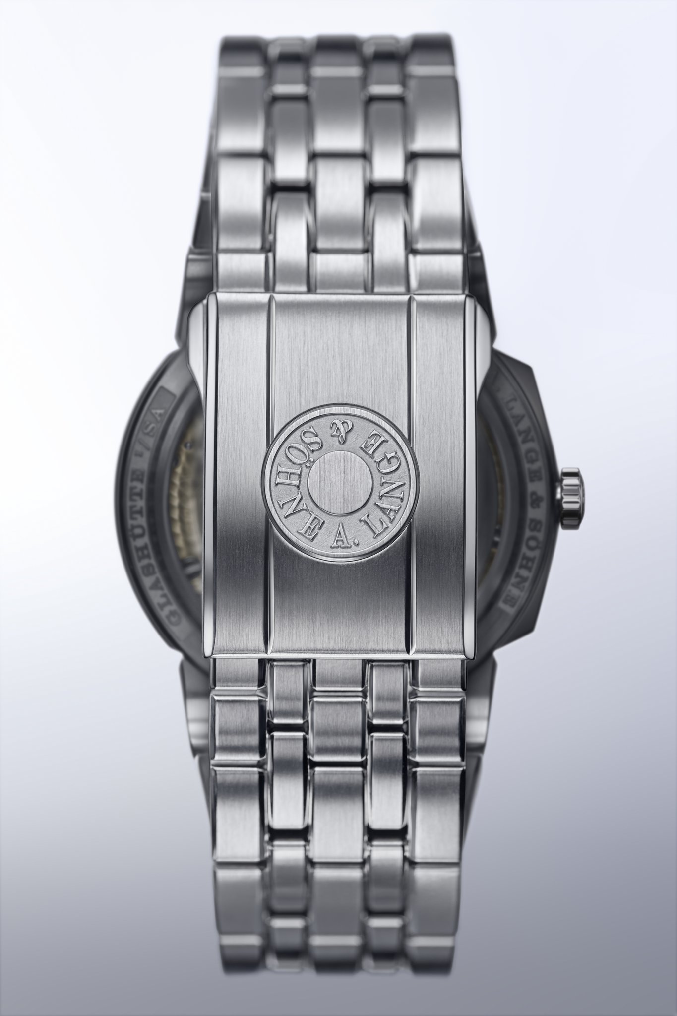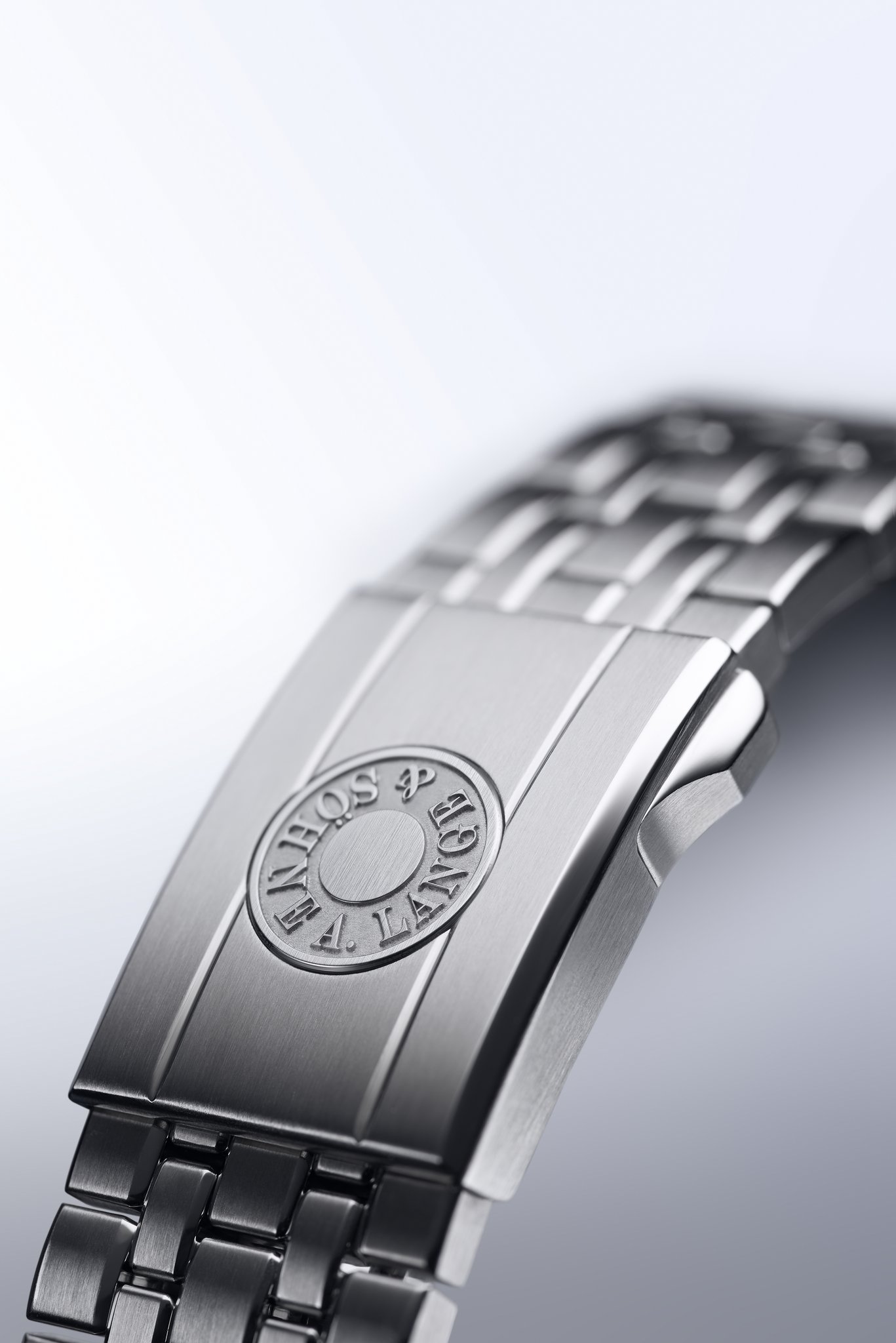 The stainless-steel bracelet is eminently comfortable to wear. Its length can be adjusted in small steps up to 7 millimetres thanks to a safety deployant buckle. By pressing the pusher embossed with the Lange signature the bracelet can be pulled or pushed to adjust the desired length. It is not necessary to open the buckle. If required, the bracelet can also be extended by adding further links.