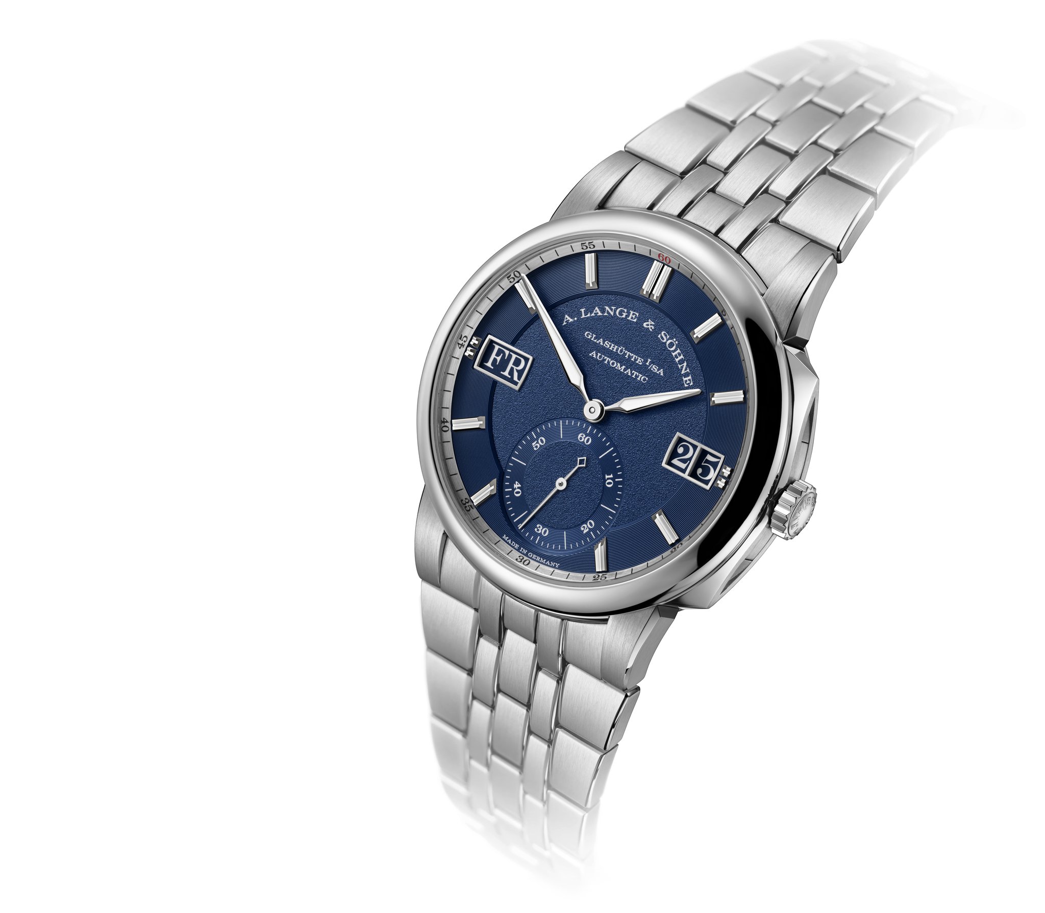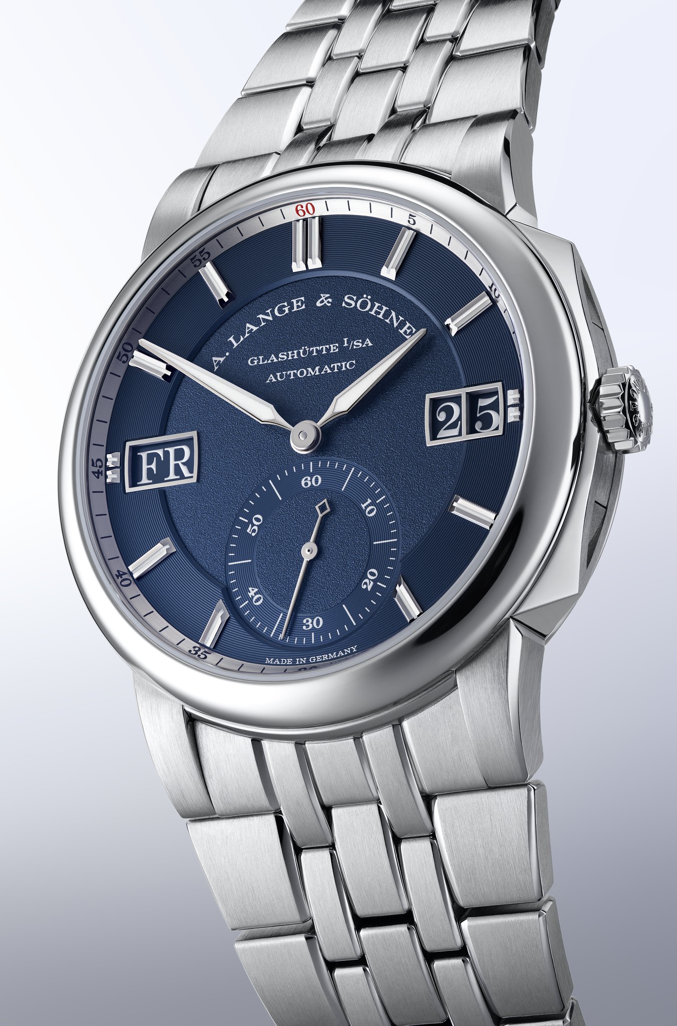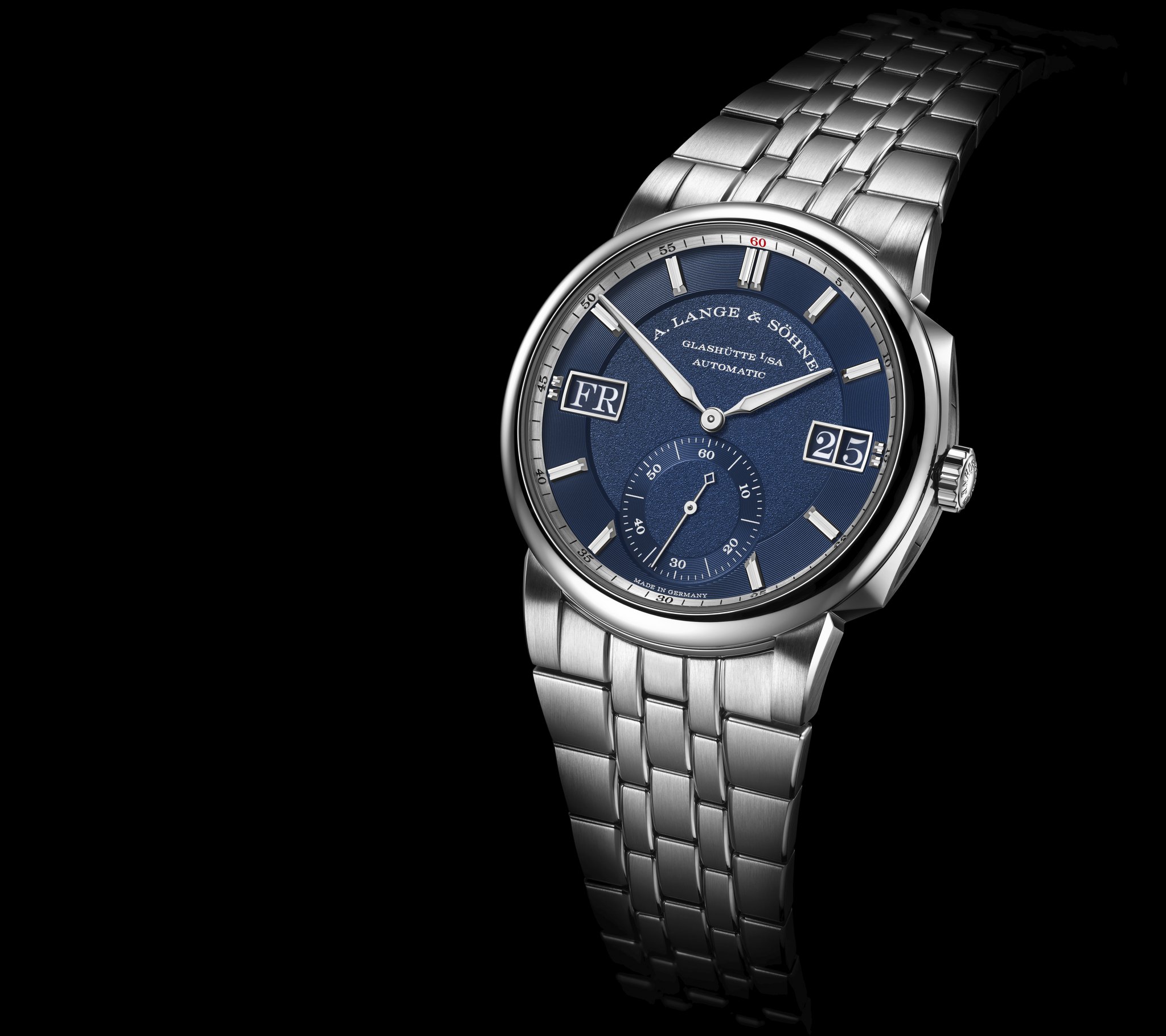 The stainless-steel bracelet is eminently comfortable to wear. Its length can be adjusted in small steps up to 7 millimetres thanks to a safety deployant buckle. By pressing the pusher embossed with the Lange signature the bracelet can be pulled or pushed to adjust the desired length. It is not necessary to open the buckle. If required, the bracelet can also be extended by adding further links.