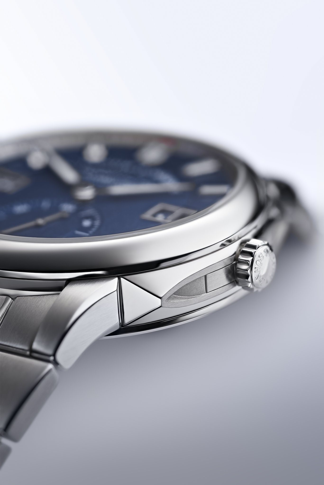 The ODYSSEUS is a sporty-elegant watch for people who admire fine watchmaking but live active lives. The prominent design of the stainless-steel case with a diameter of 40.5 millimetres and a height of 11.1 millimetres, featuring an integrated stainless-steel bracelet, embraces traditional brand elements and reinterprets them. This applies particularly to the sculpted, slightly cantilevered middle band of the three-part case. Its surfaces are decorated with a satin contour finish and the edges are emphasised with a chamfer. The combination of brushed surfaces and chamfered edges is echoed on the lugs and links of the massive stainless-steel bracelet. Specially sealed, tapered buttons for correcting the date and the day of the week are arranged at 2 and 4 o’clock.