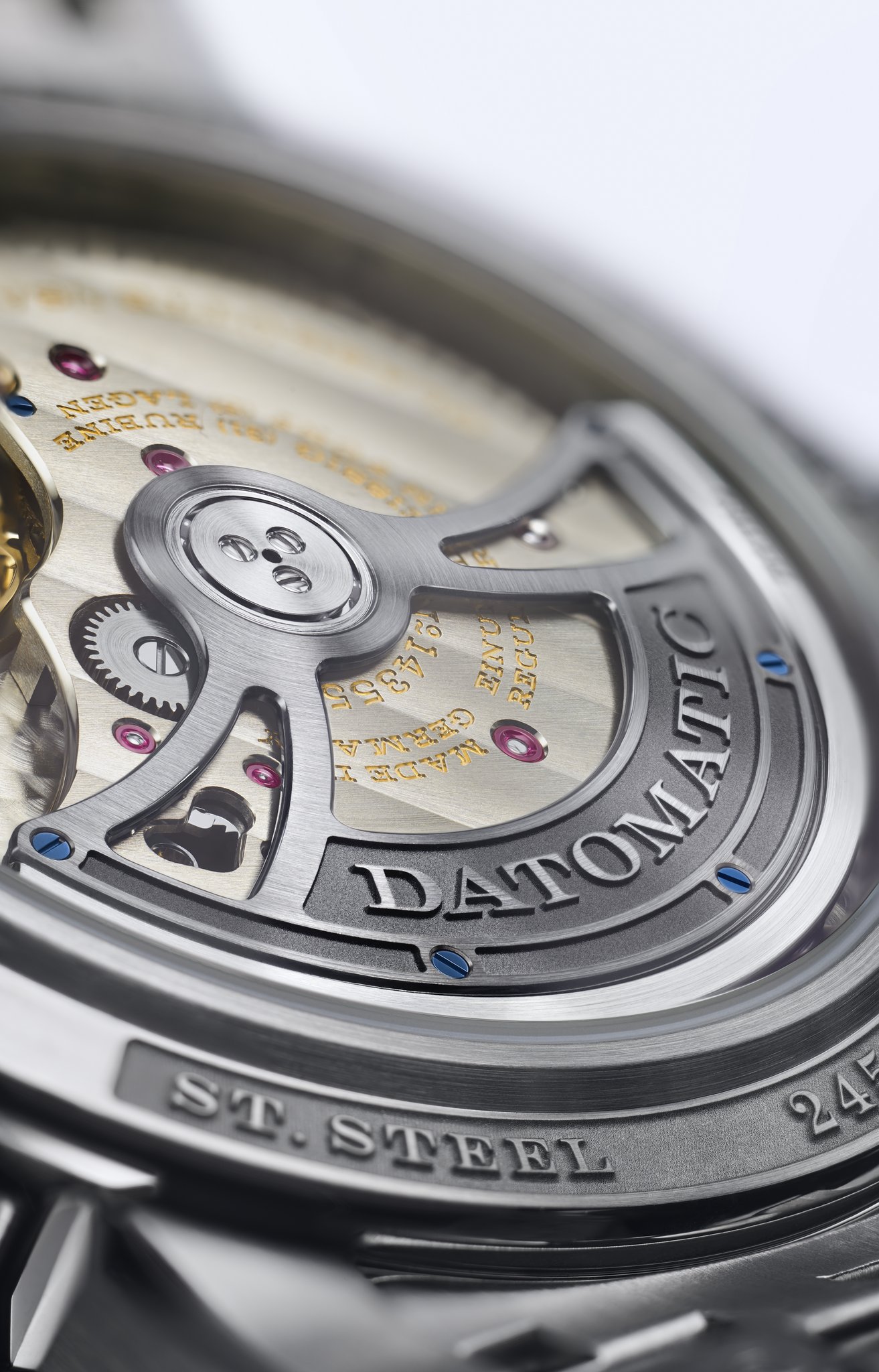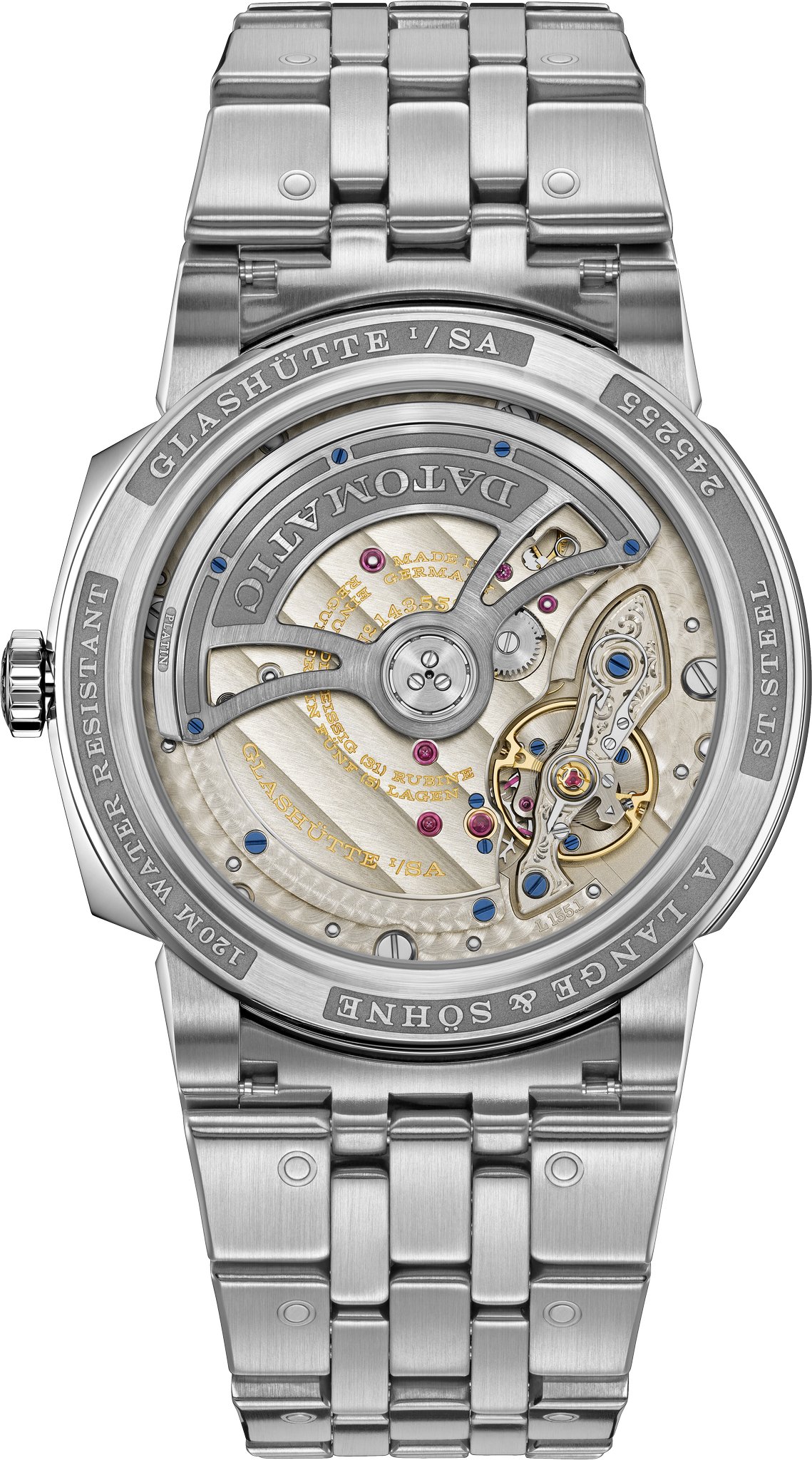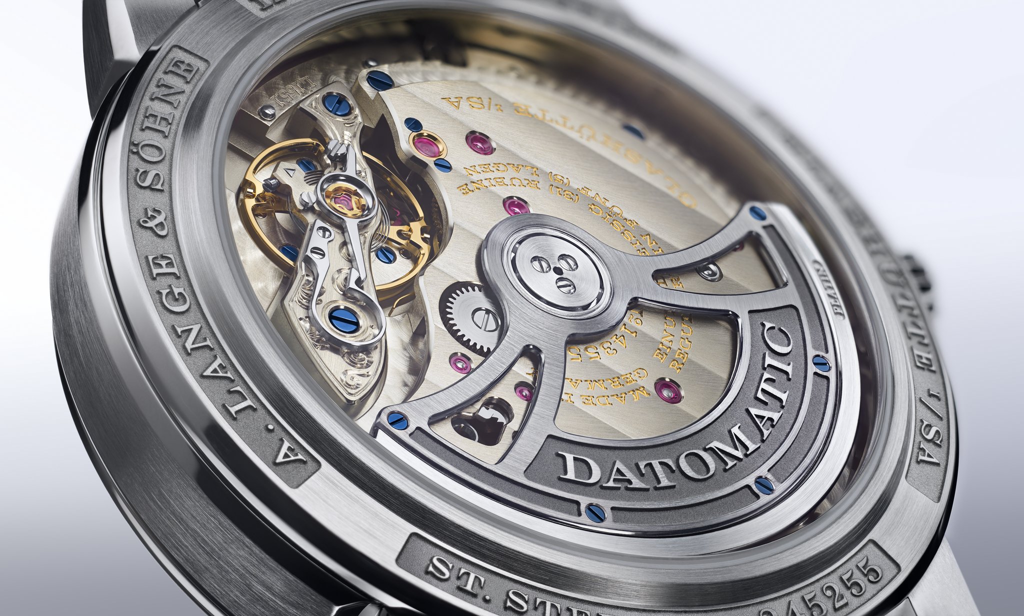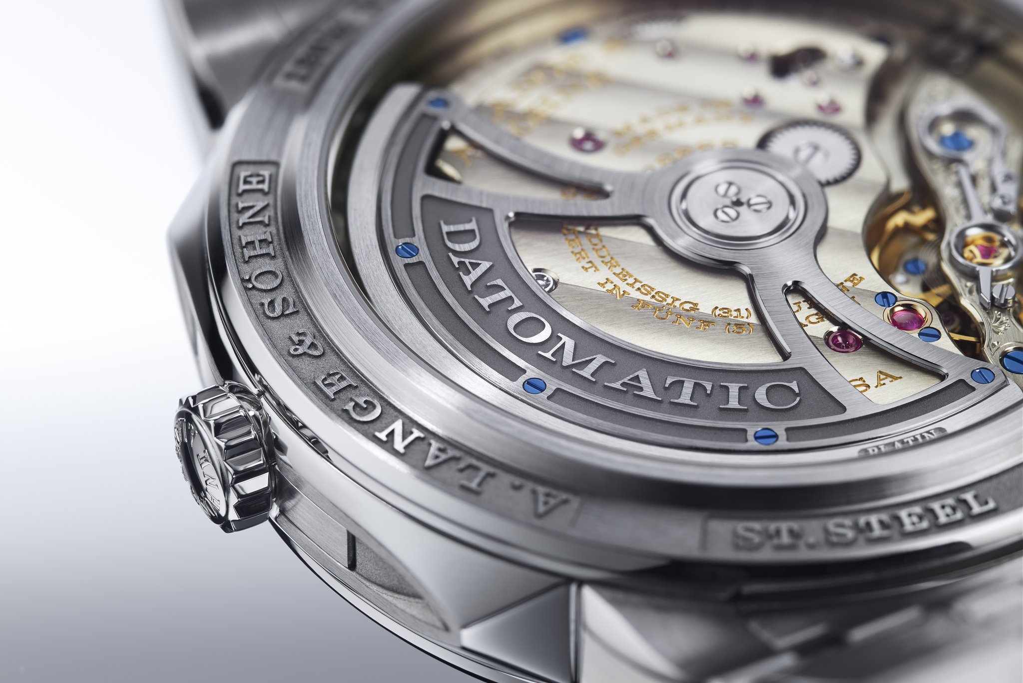 Lange manufacture calibre L155.1 DATOMATIC, self-wind-ing, crafted to the most exacting Lange quality standards, decorated and assembled by hand; precision-adjusted in five positions; unidirectionally winding central rotor with platinum centrifugal mass; balance bridge engraved by hand