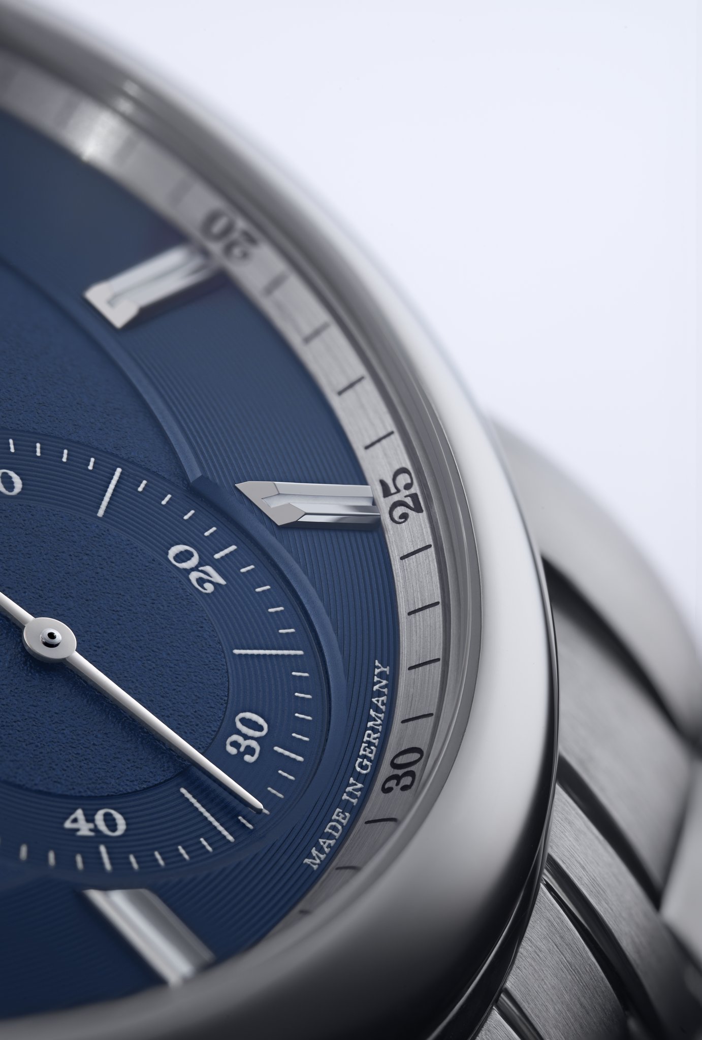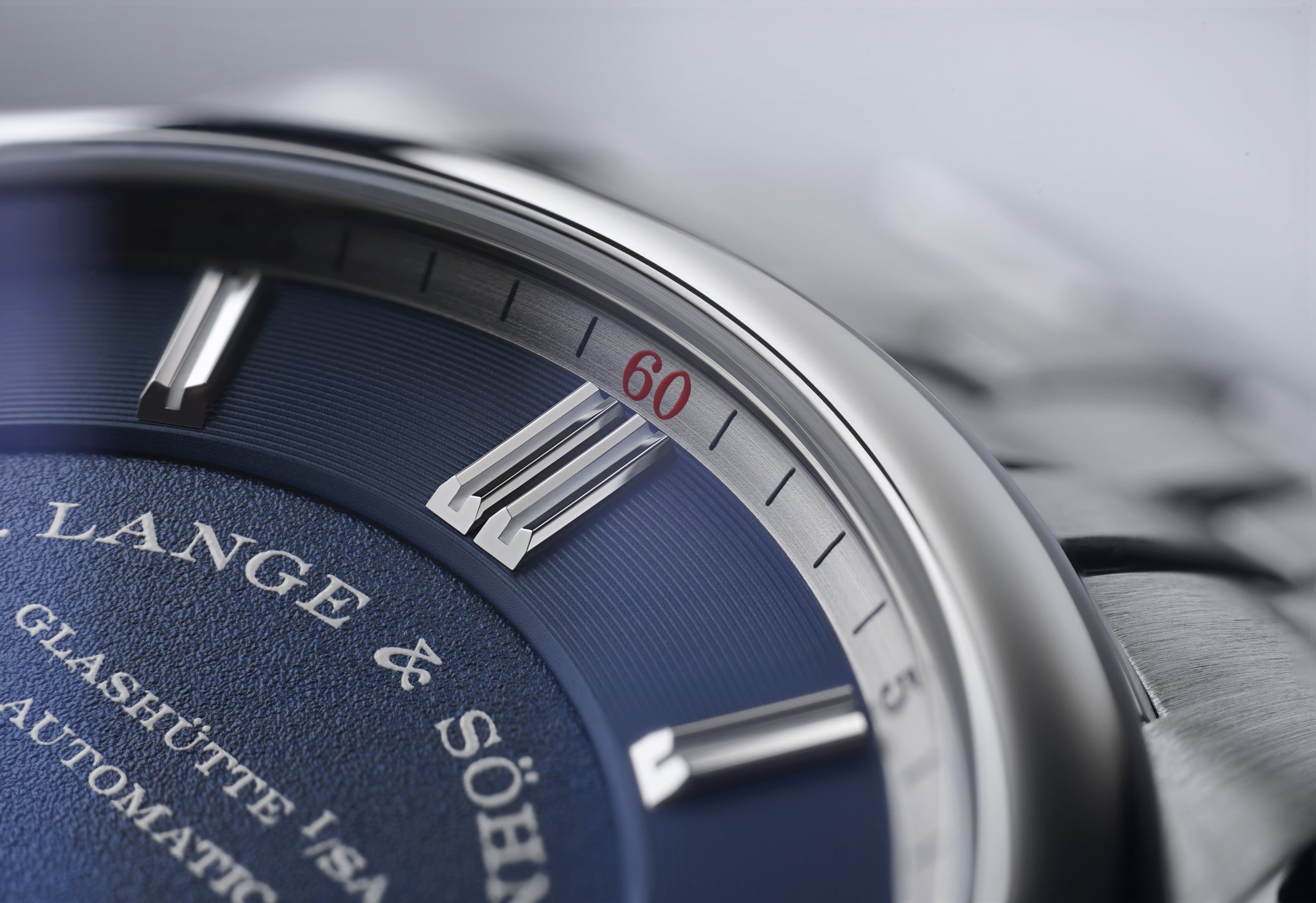 The dial is made of brass and has several levels with different surfaces. Just like the outer scale of the subsidiary seconds dial, the notched baton appliques made of white gold lie above concen-tric lines, a technique called azurage. They con-trast against the grained inner surfaces of the main and subsidiary dial. A bevelled, argenté-coloured flange ring with a printed minute scale frames the dial. The number 60, printed in red at 12 o’clock, provides a colourful accent. In the ODYSSEUS, the brand-typical lancet-shaped hands for hours and minutes are more prominent than in other watches of the manufactory. Just like the inner surfaces of the baton appliques, they are luminous.