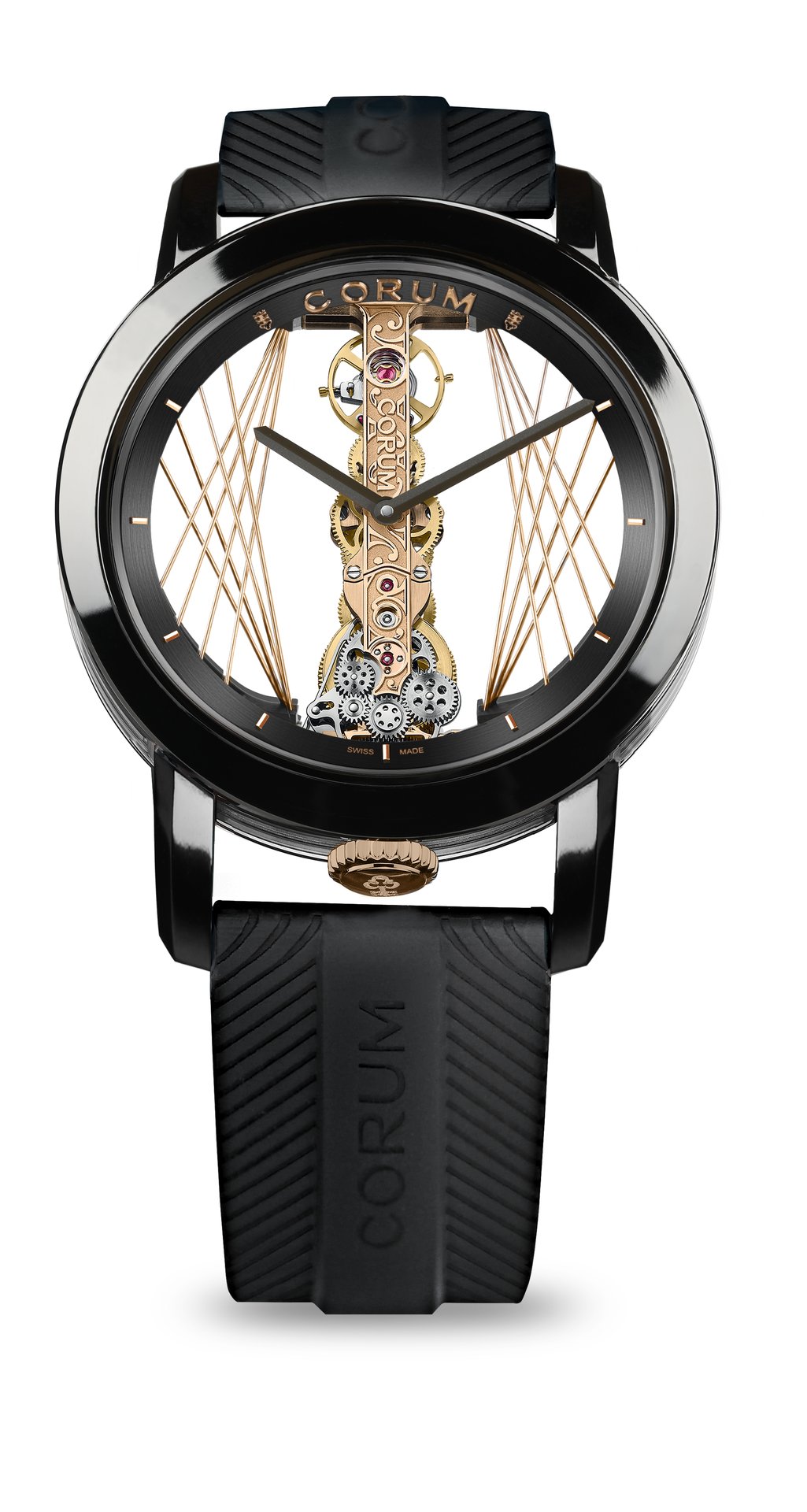 Four symmetrical series of cables extend across both sides of the movement. They continue the architectural inspiration of the aptly named “Bridge” collection. Through exploring the aesthetic of the bridge, Corum illustrates the watchmaking metaphor. The piece links to the “bridge” that keeps its gear train in motion for those who travel across cities and rivers to connect with others. An age-old symbol of openness, of encounter, the bridge has always been one of the most complex works of art ever created, a technical prowess capable of defying centuries and the elements.