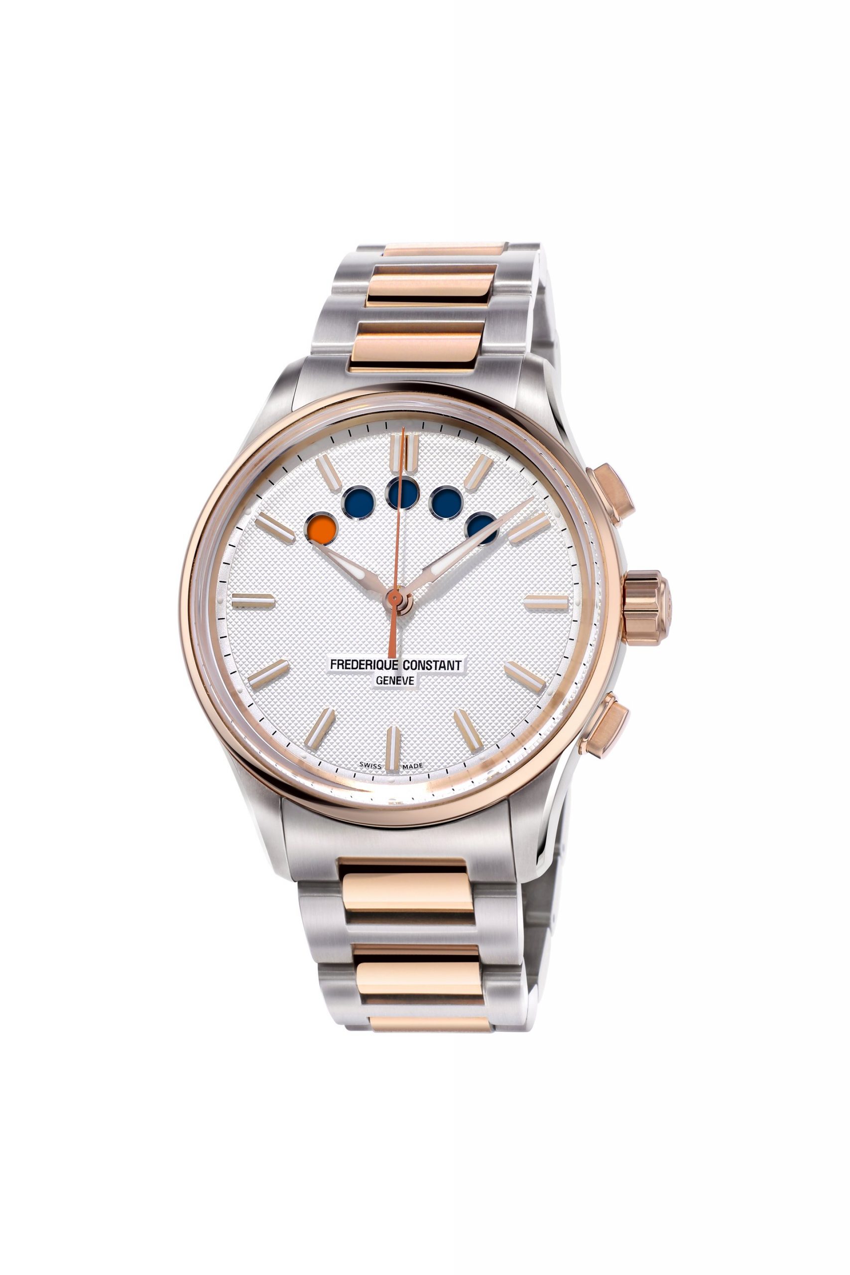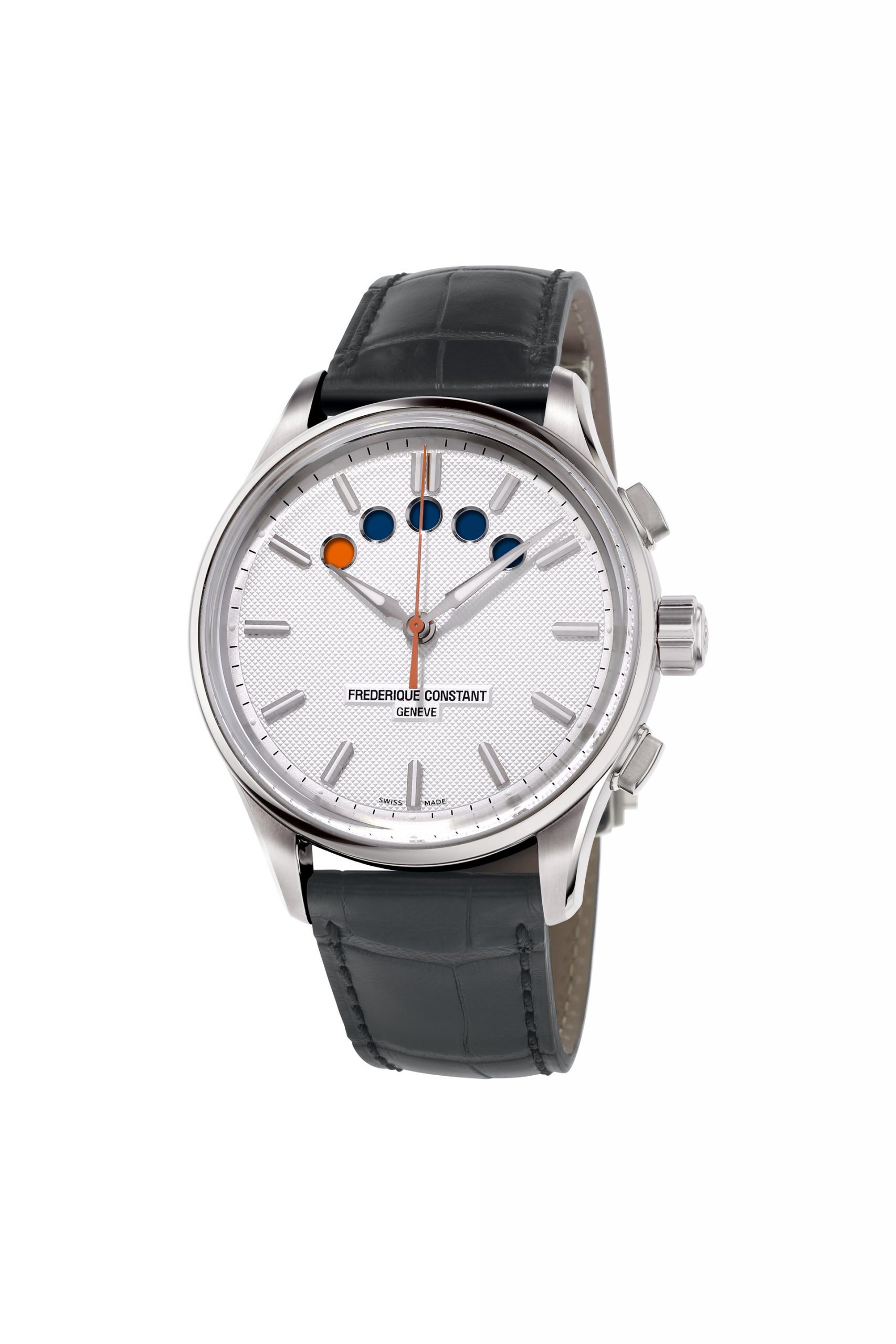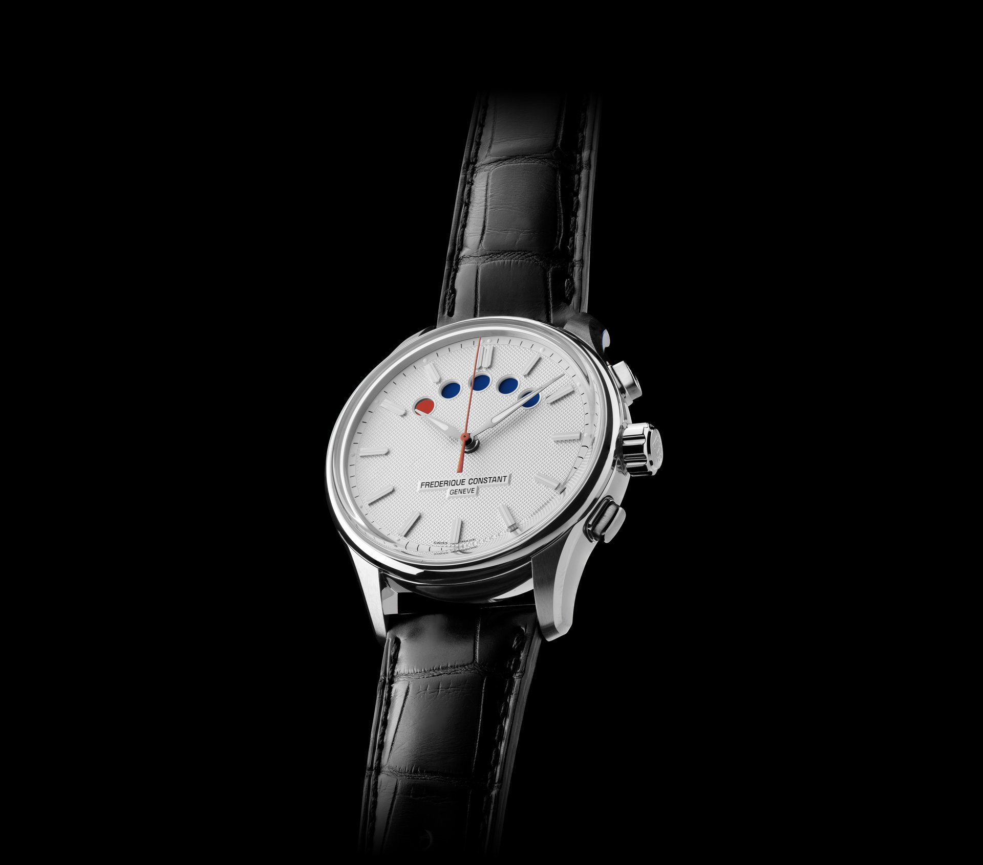 Frederique Constant has not designed a “nautically-inspired” timepiece, but rather a genuine regatta watch that is operational in race conditions. The perfectly readable original display from 1997 was left unchanged. It features five dots at the top of the dial. Each dot represents one minute. The top button activates the first countdown that slowly turns all the points from white to blue, the contrasting color of the dial. Five minutes has passed when all five points are coloured.