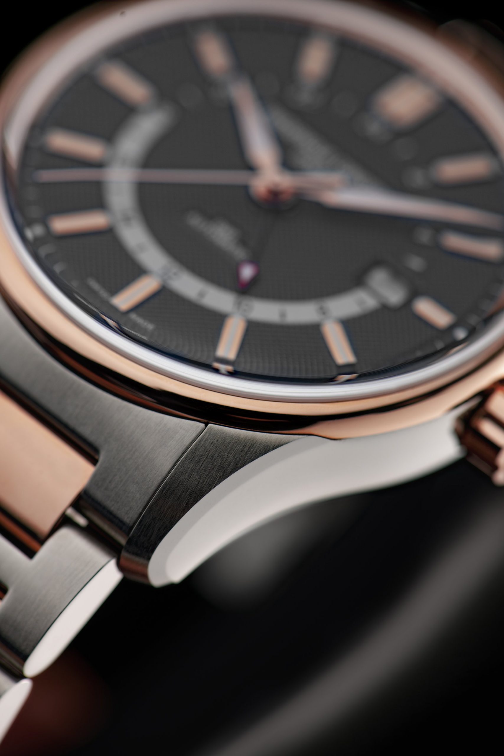 - Hand polished rose gold-plated hour & minute hands with luminous treatment, pearl black second hand and black oxy GMT hand with red tip and white luminous treatment