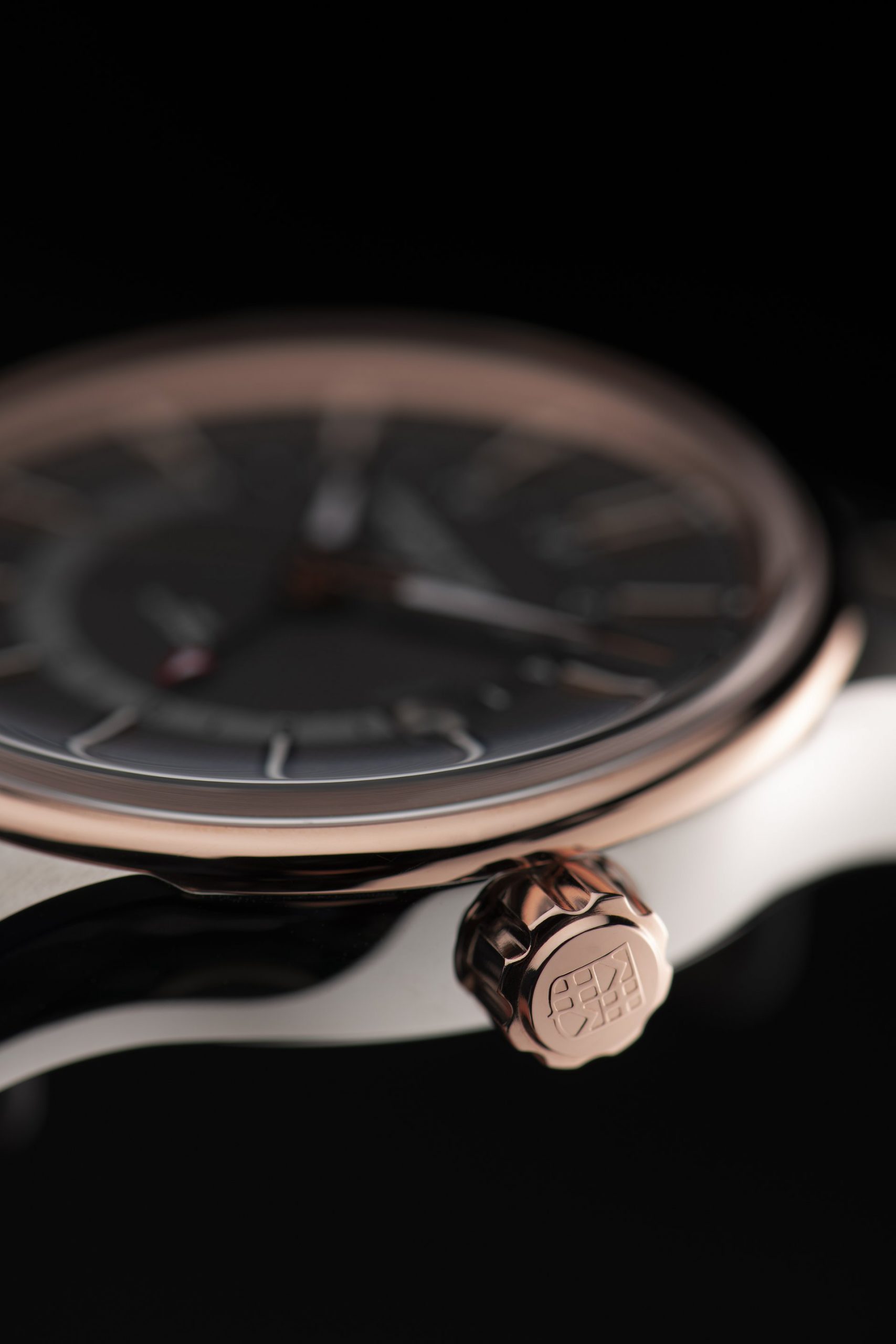 - Hand polished rose gold-plated hour, minute, orange second hands