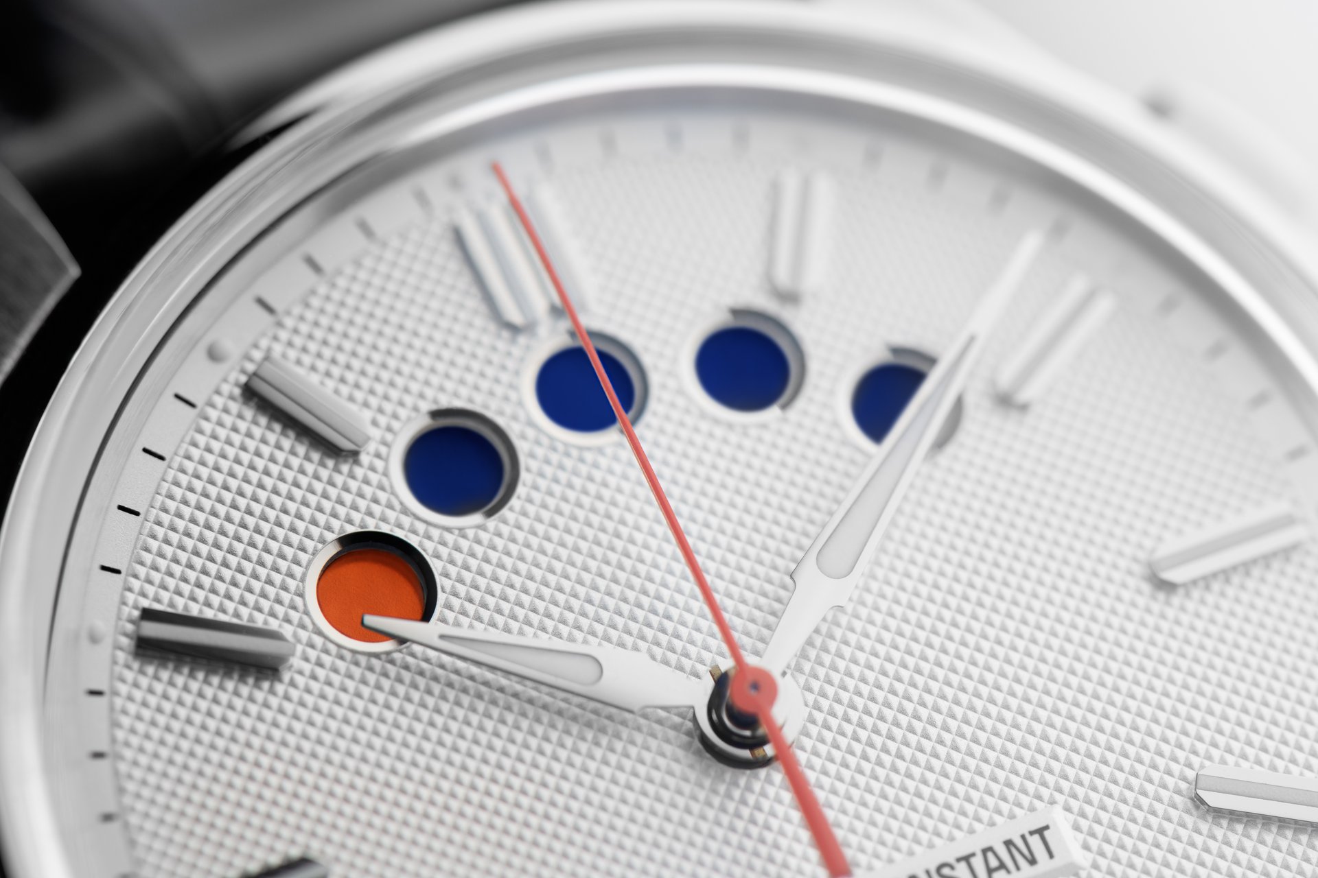 - Hand polished silver hour, minute, orange second hands