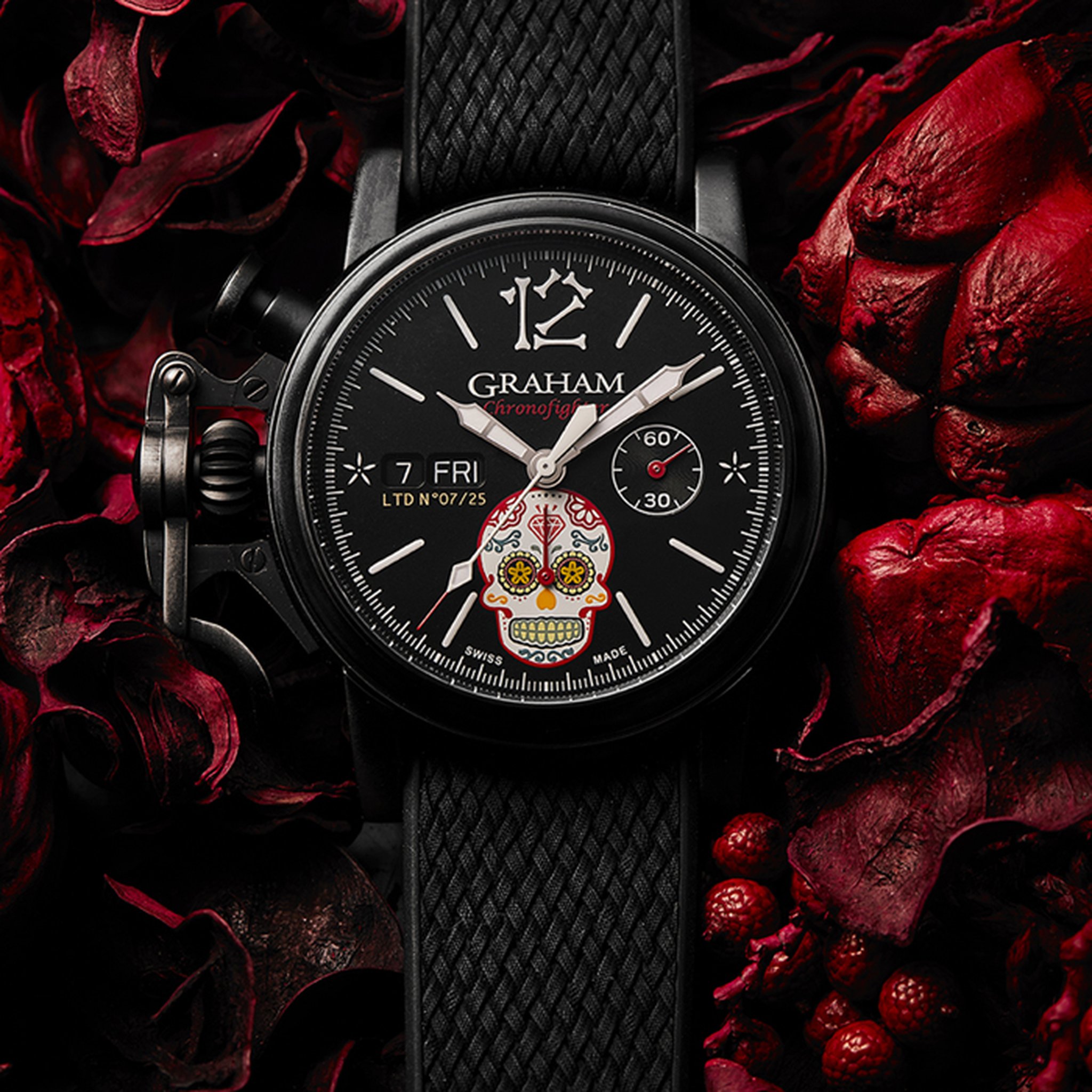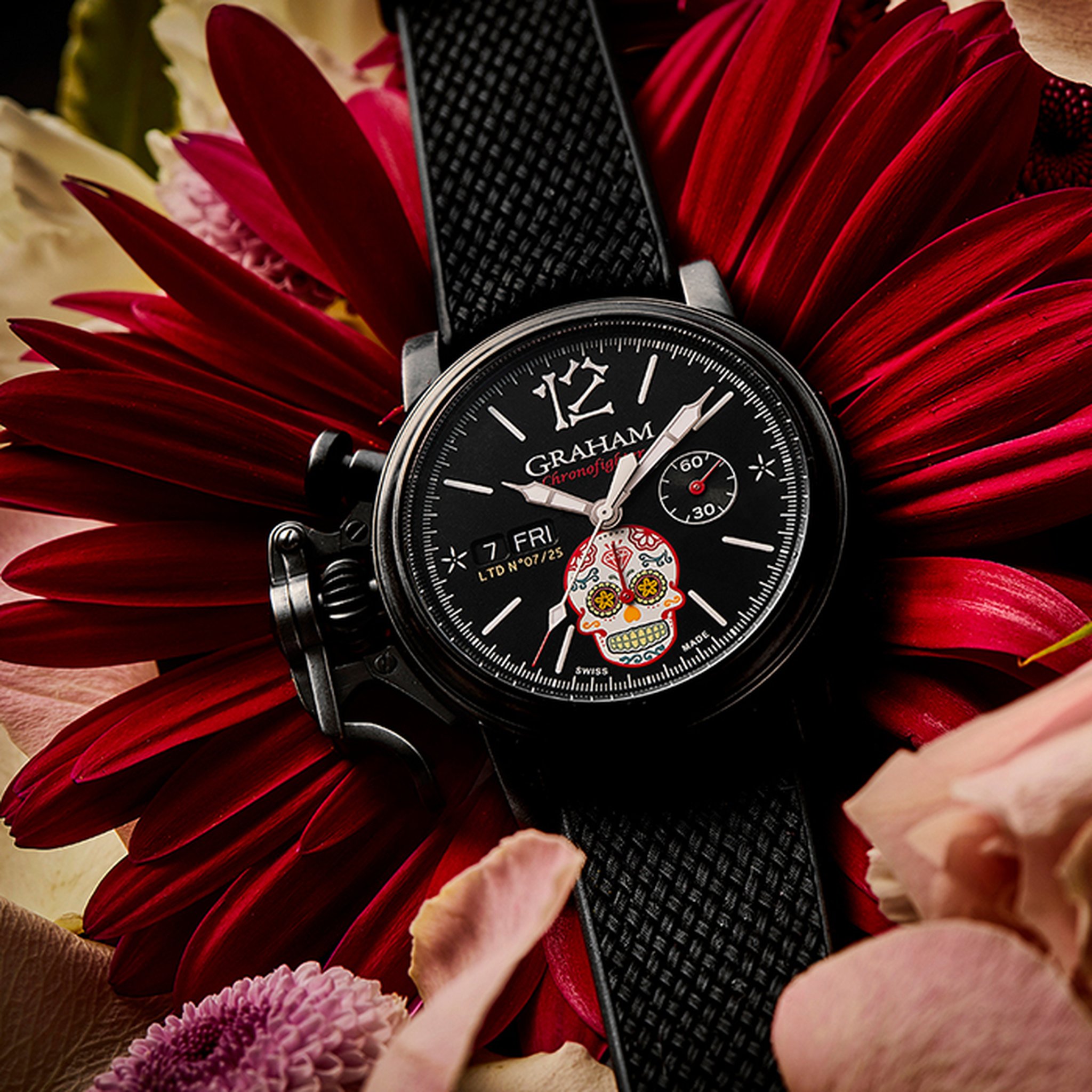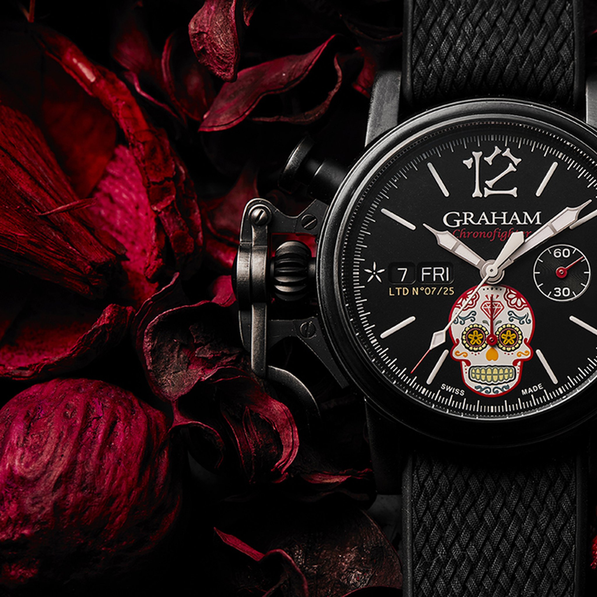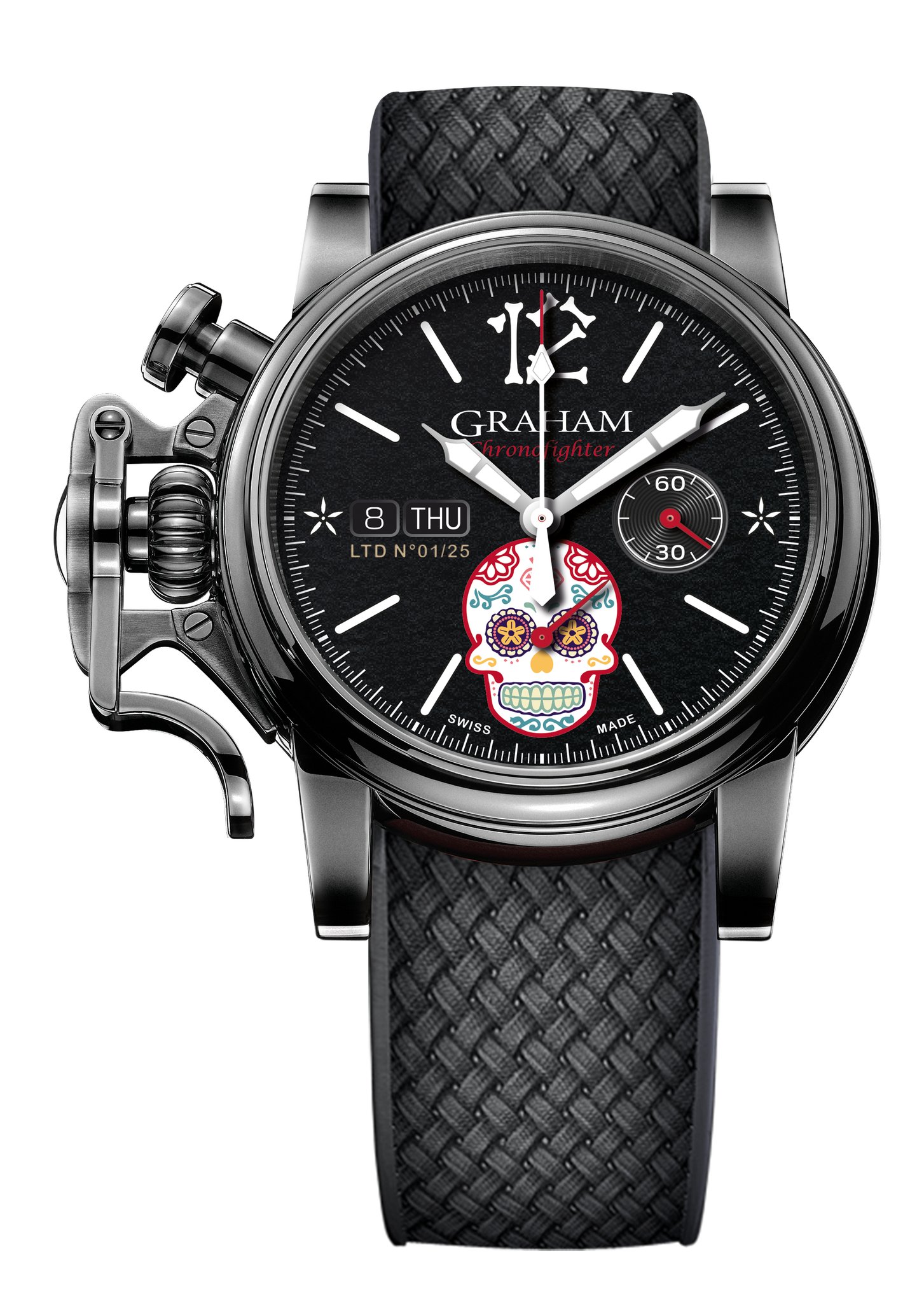 The distinctive start and stop lever on the left of the case is the renowned GRAHAM Chronofighter signature which enables to activate the chronograph functions. The system recalls early stopwatches used by World War 2 flying officers which were just large pocket watches strapped over bomber jackets. Instinctive and precise, it is a fail-safe system which does not distract the wearer because the lever on the left of the case is effortlessly reached with the right hand. The thumb, the fastest of all fingers, starts and stops the chronograph. The result is precise timing.