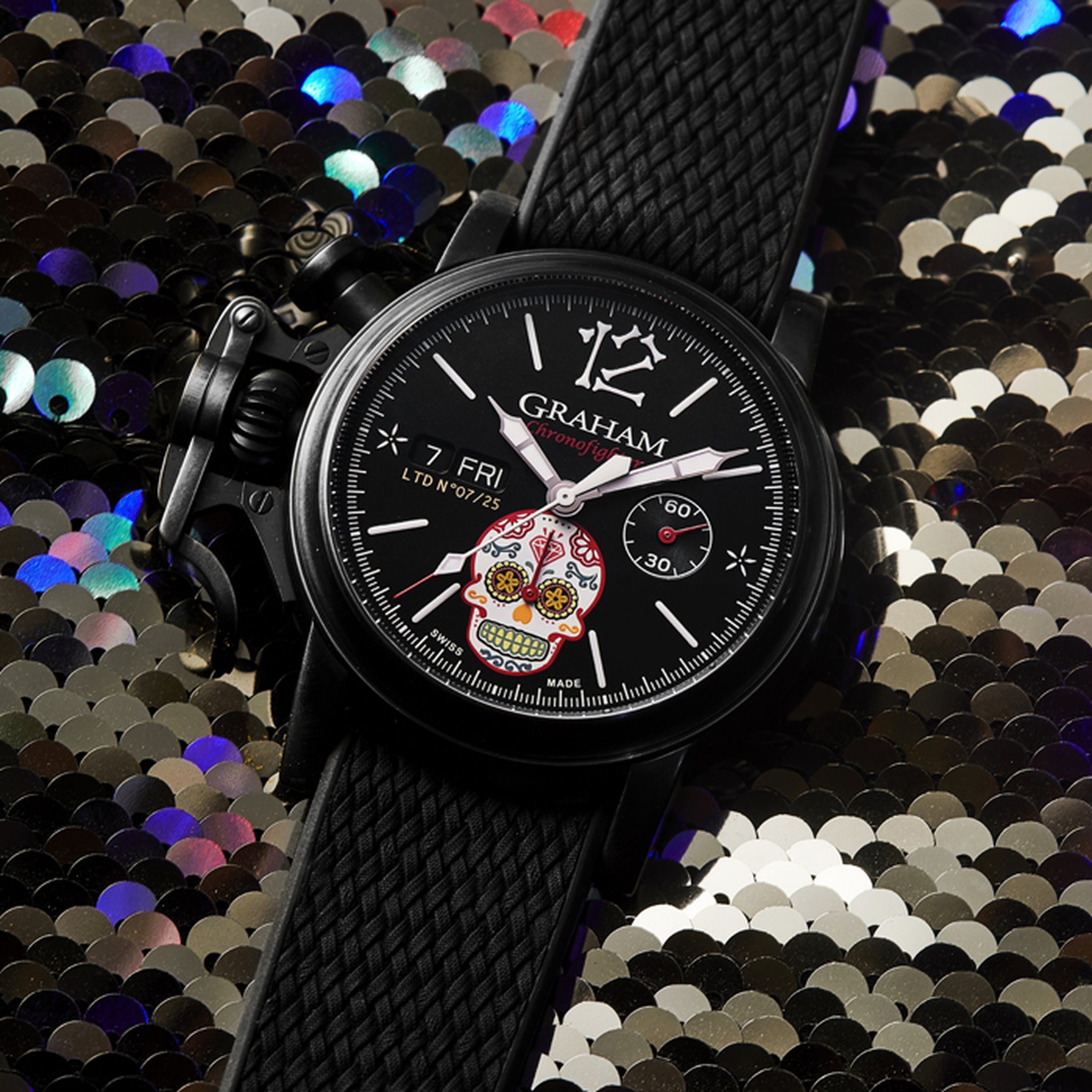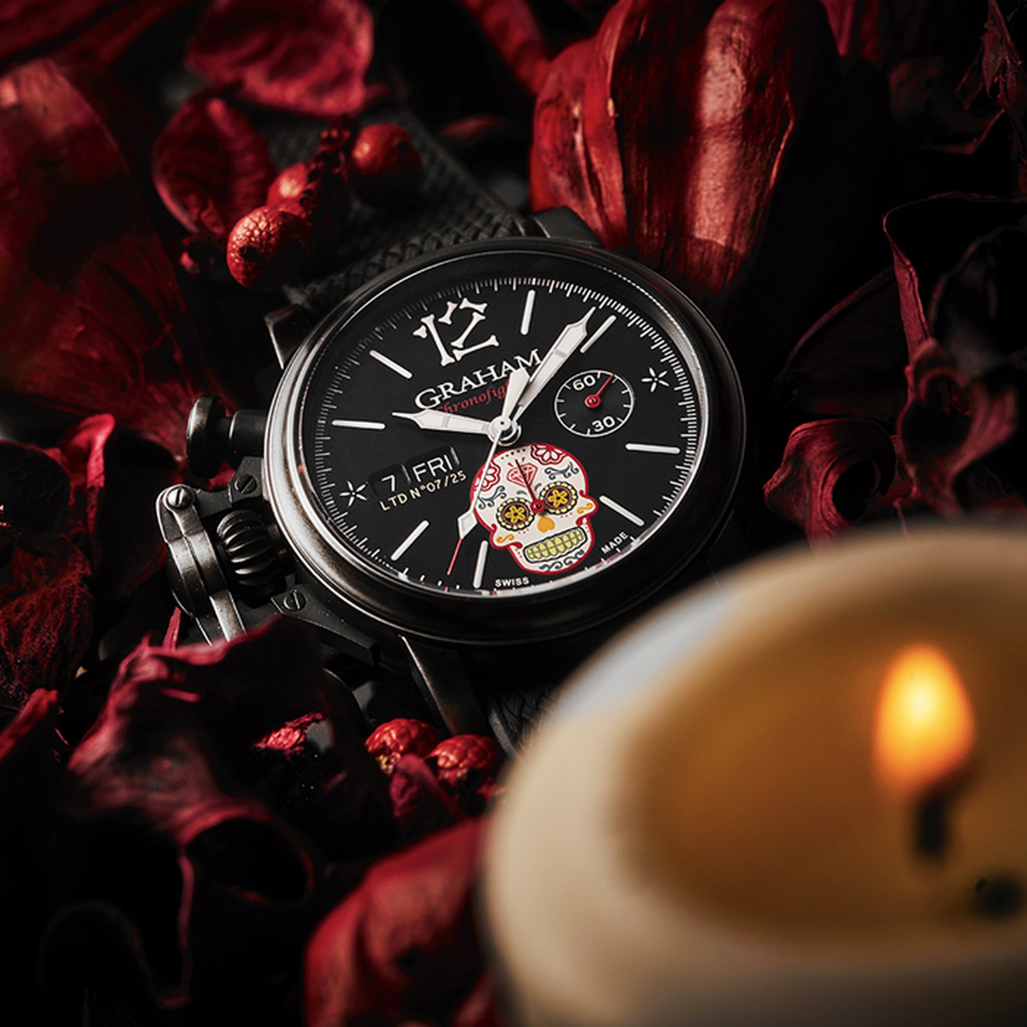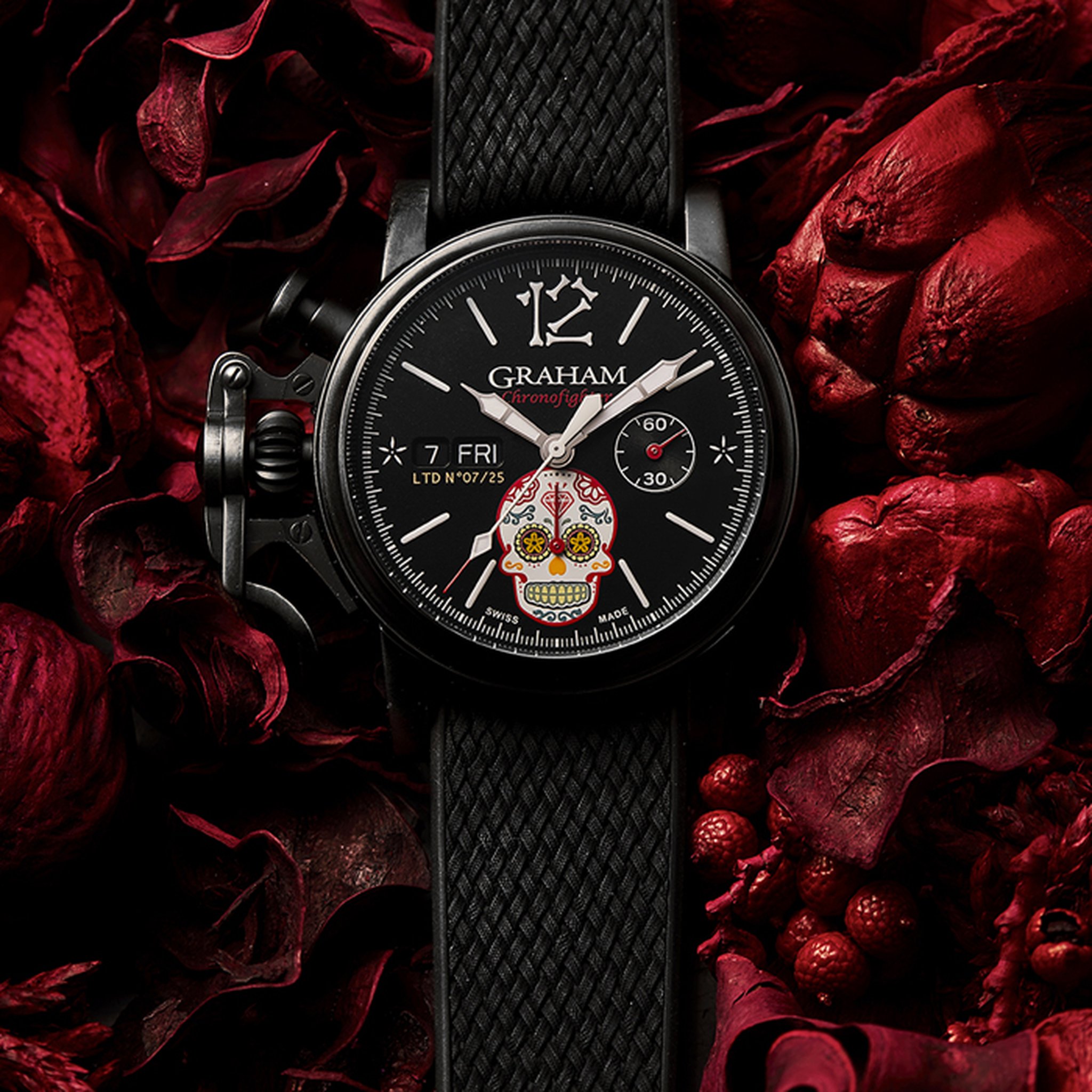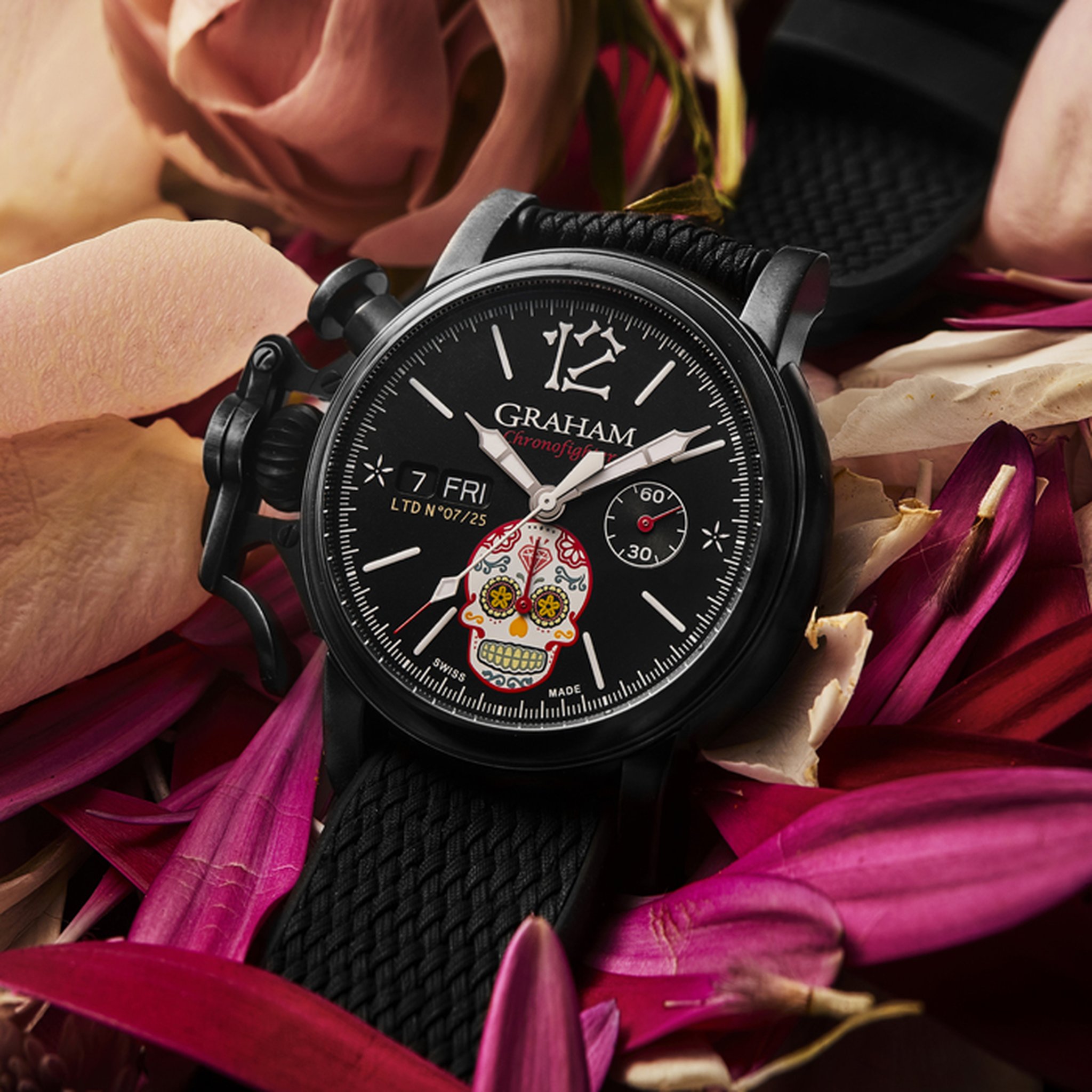 The distinctive start and stop lever on the left of the case is the renowned GRAHAM Chronofighter signature which enables to activate the chronograph functions. The system recalls early stopwatches used by World War 2 flying officers which were just large pocket watches strapped over bomber jackets. Instinctive and precise, it is a fail-safe system which does not distract the wearer because the lever on the left of the case is effortlessly reached with the right hand. The thumb, the fastest of all fingers, starts and stops the chronograph. The result is precise timing.