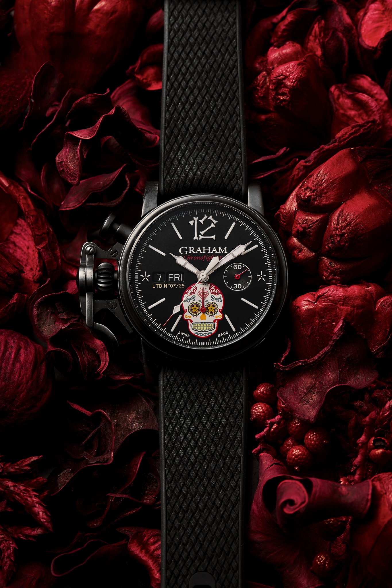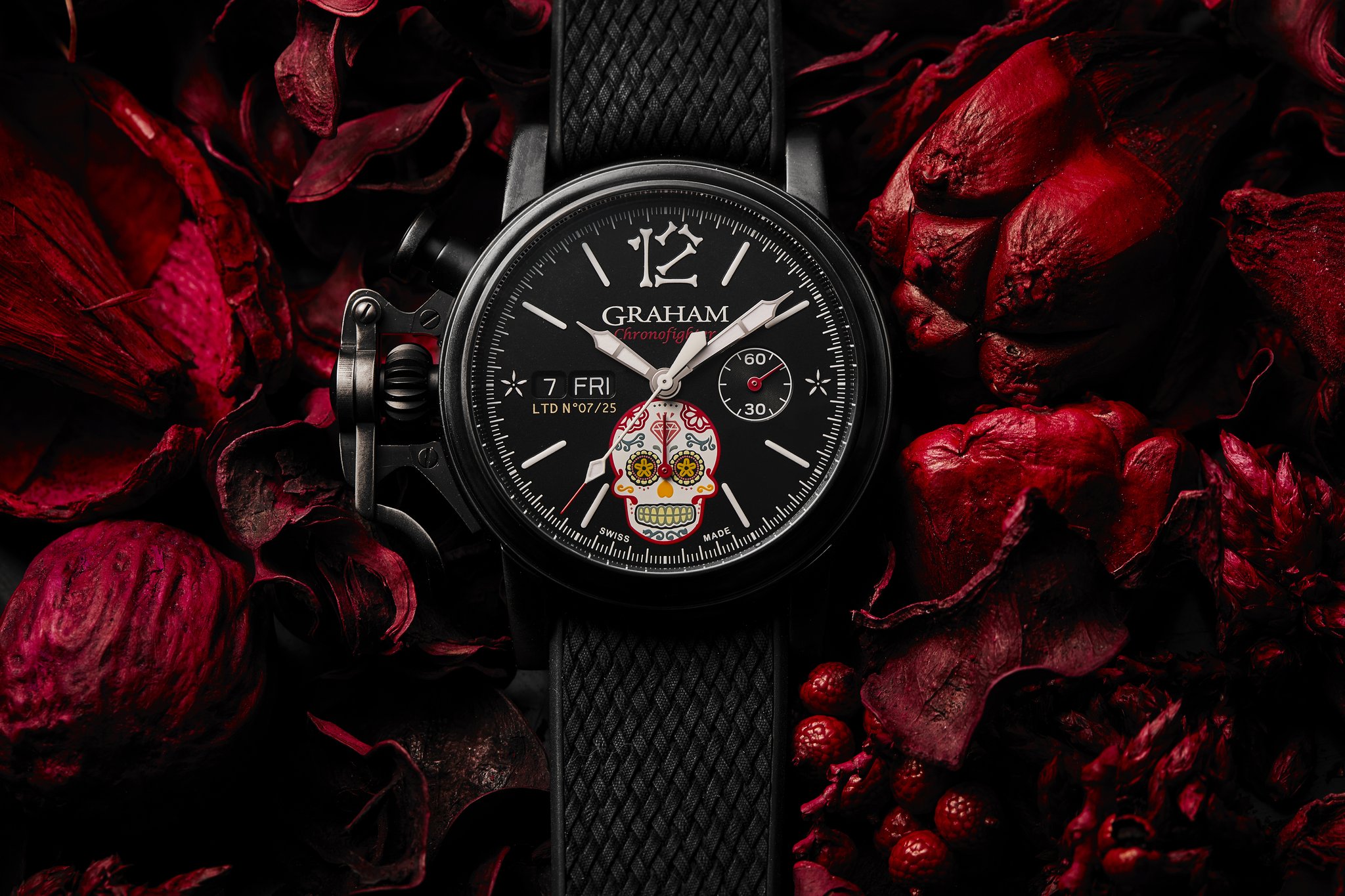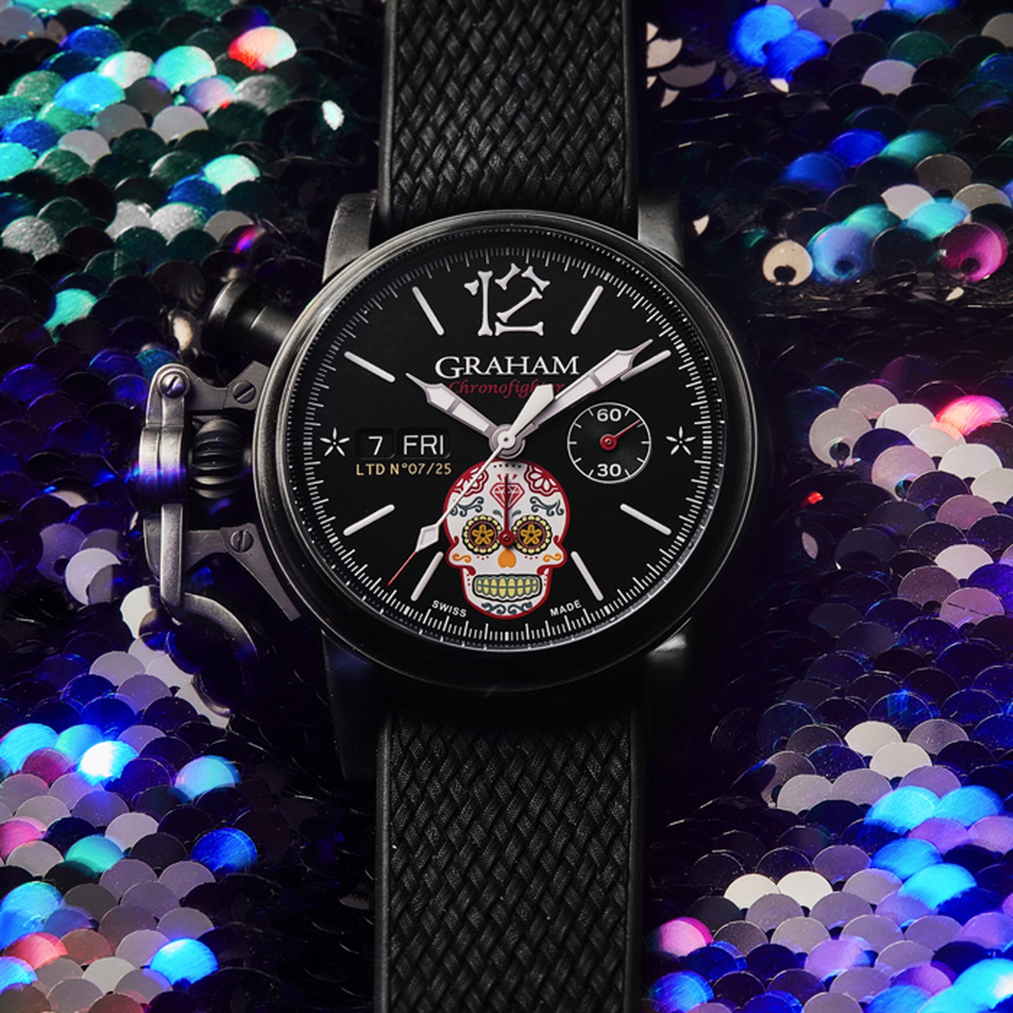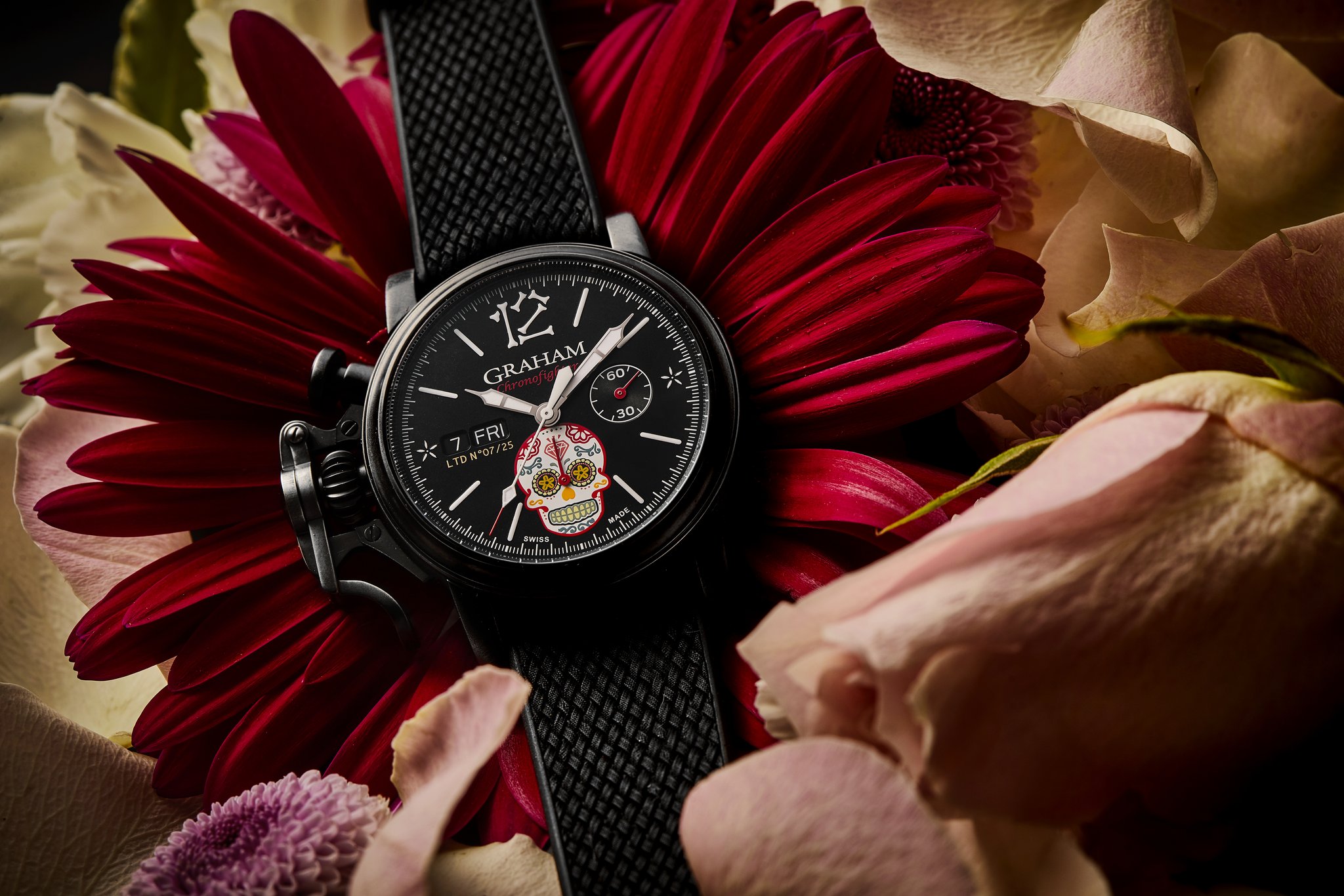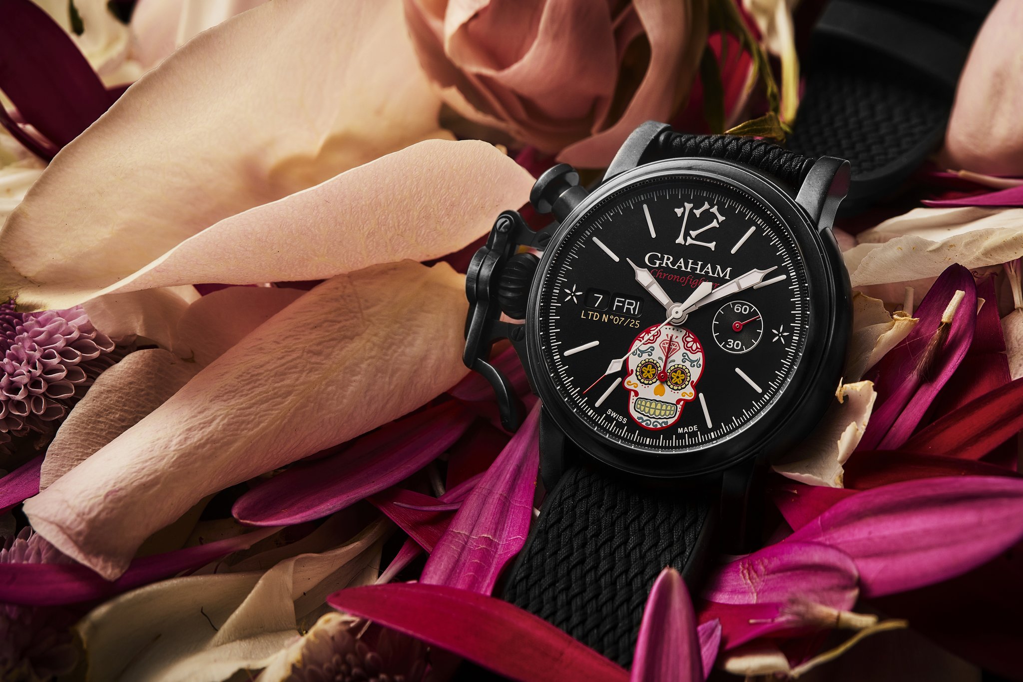 The distinctive start and stop lever on the left of the case is the renowned GRAHAM Chronofighter signature which enables to activate the chronograph functions. The system recalls early stopwatches used by World War 2 flying officers which were just large pocket watches strapped over bomber jackets. Instinctive and precise, it is a fail-safe system which does not distract the wearer because the lever on the left of the case is effortlessly reached with the right hand. The thumb, the fastest of all fingers, starts and stops the chronograph. The result is precise timing.
