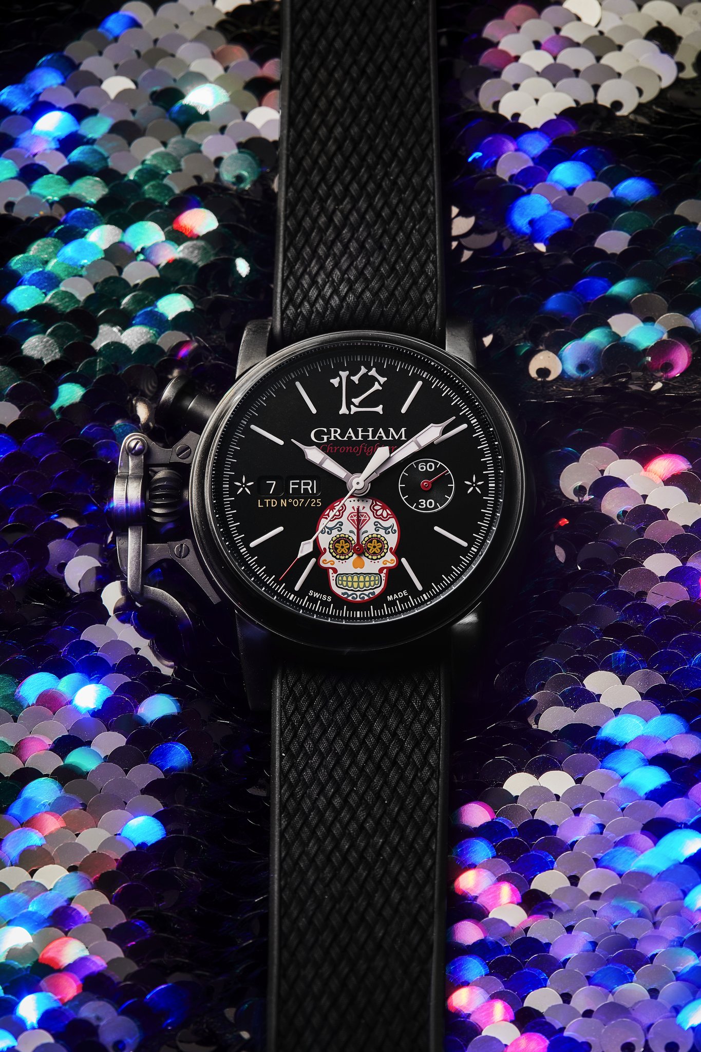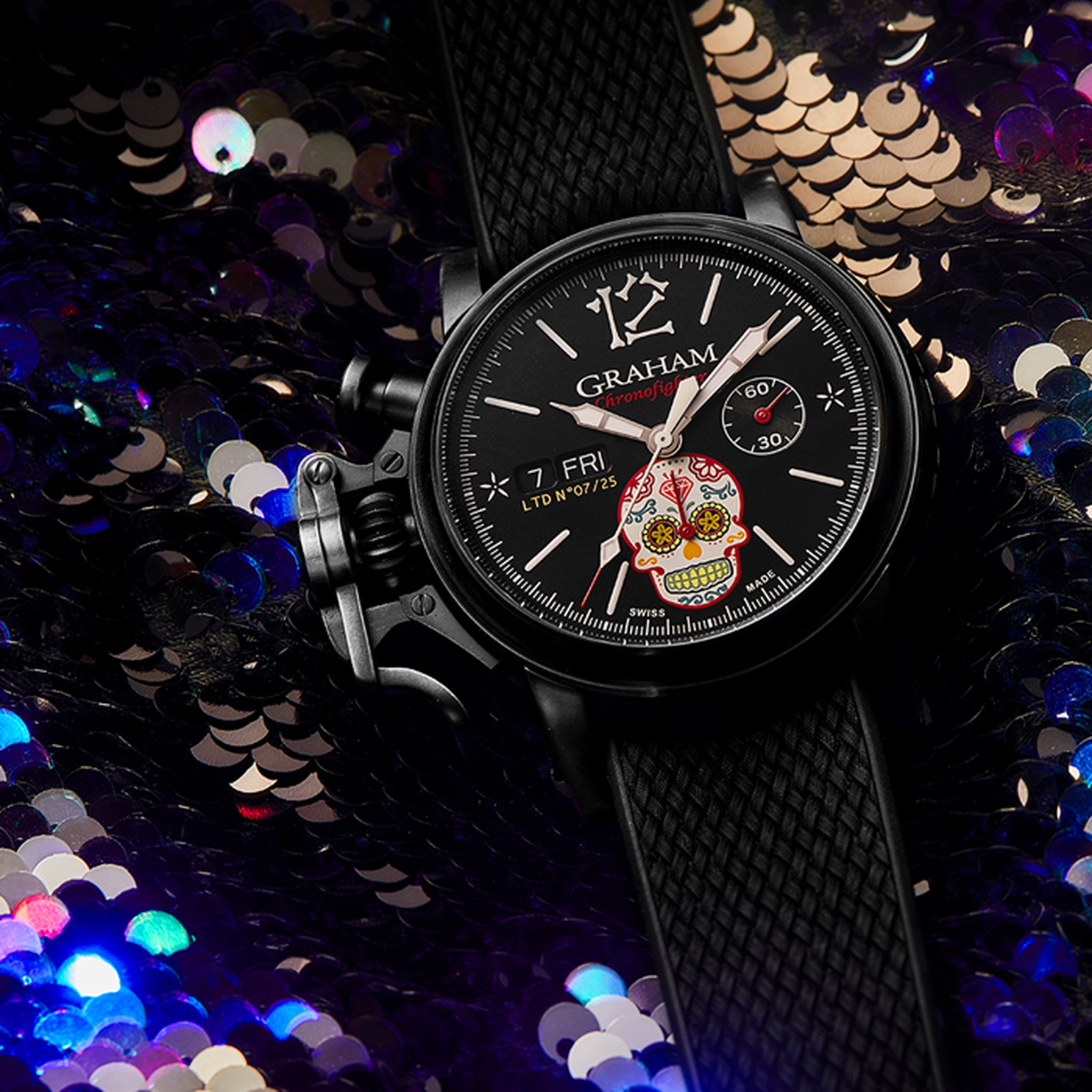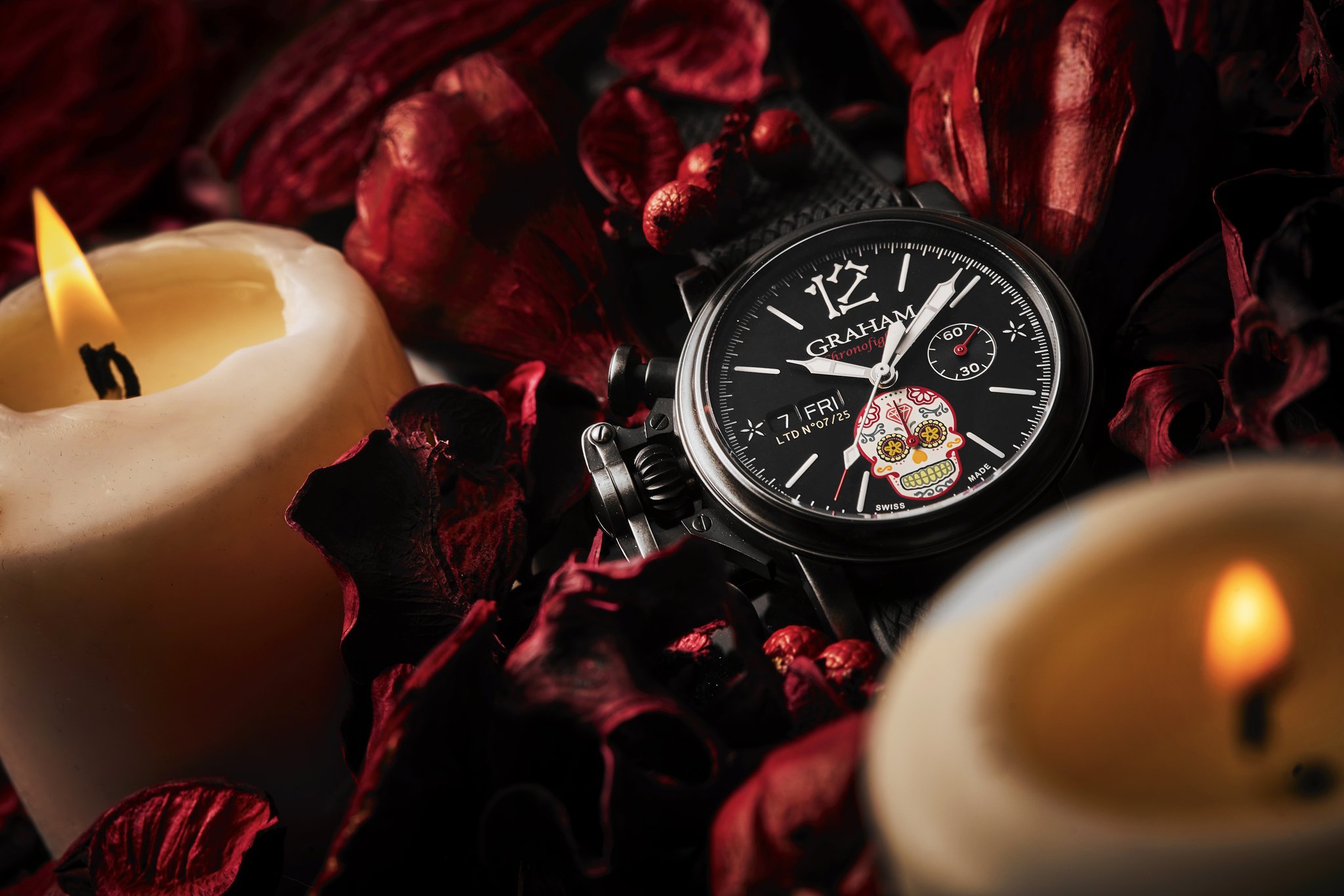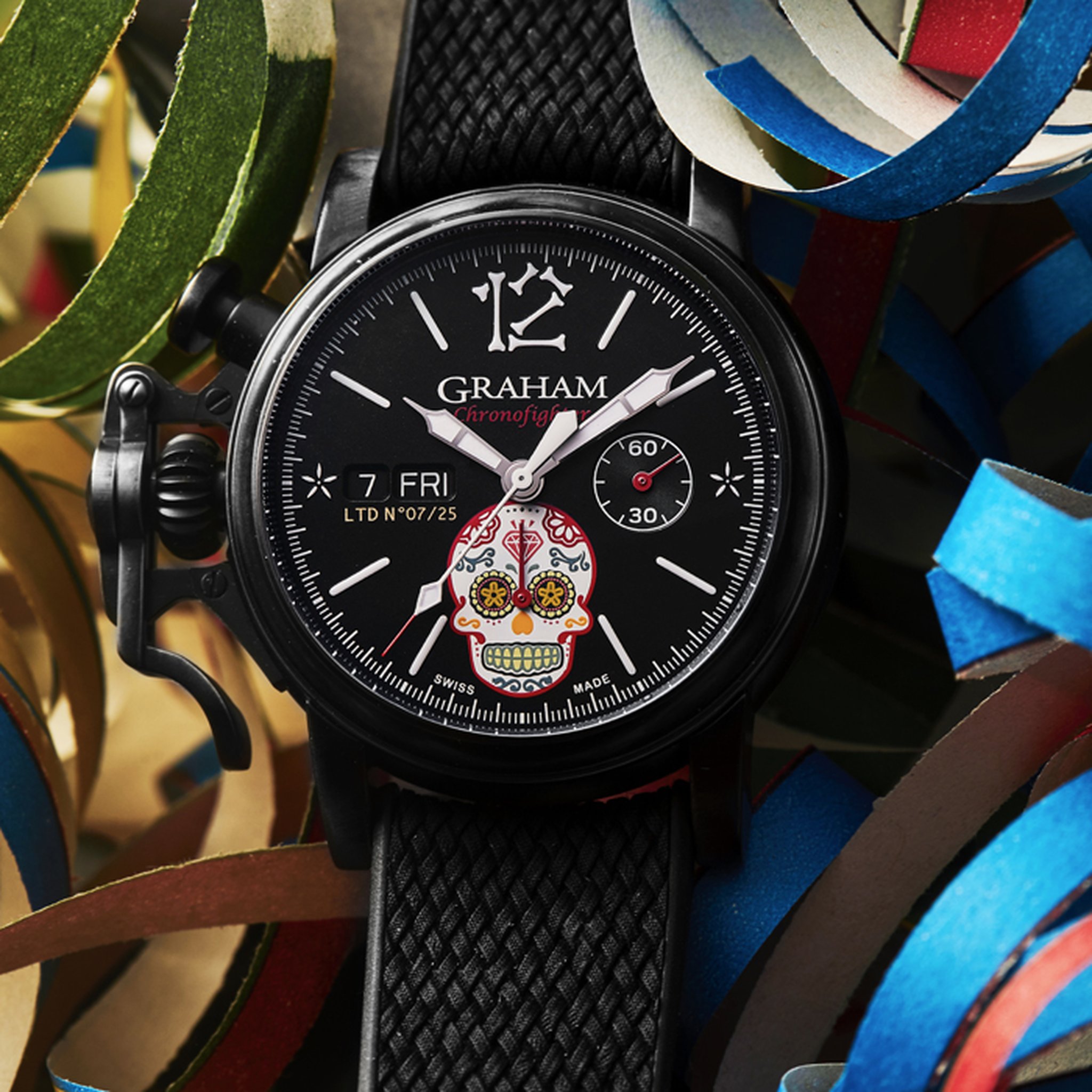 The distinctive start and stop lever on the left of the case is the renowned GRAHAM Chronofighter signature which enables to activate the chronograph functions. The system recalls early stopwatches used by World War 2 flying officers which were just large pocket watches strapped over bomber jackets. Instinctive and precise, it is a fail-safe system which does not distract the wearer because the lever on the left of the case is effortlessly reached with the right hand. The thumb, the fastest of all fingers, starts and stops the chronograph. The result is precise timing.
