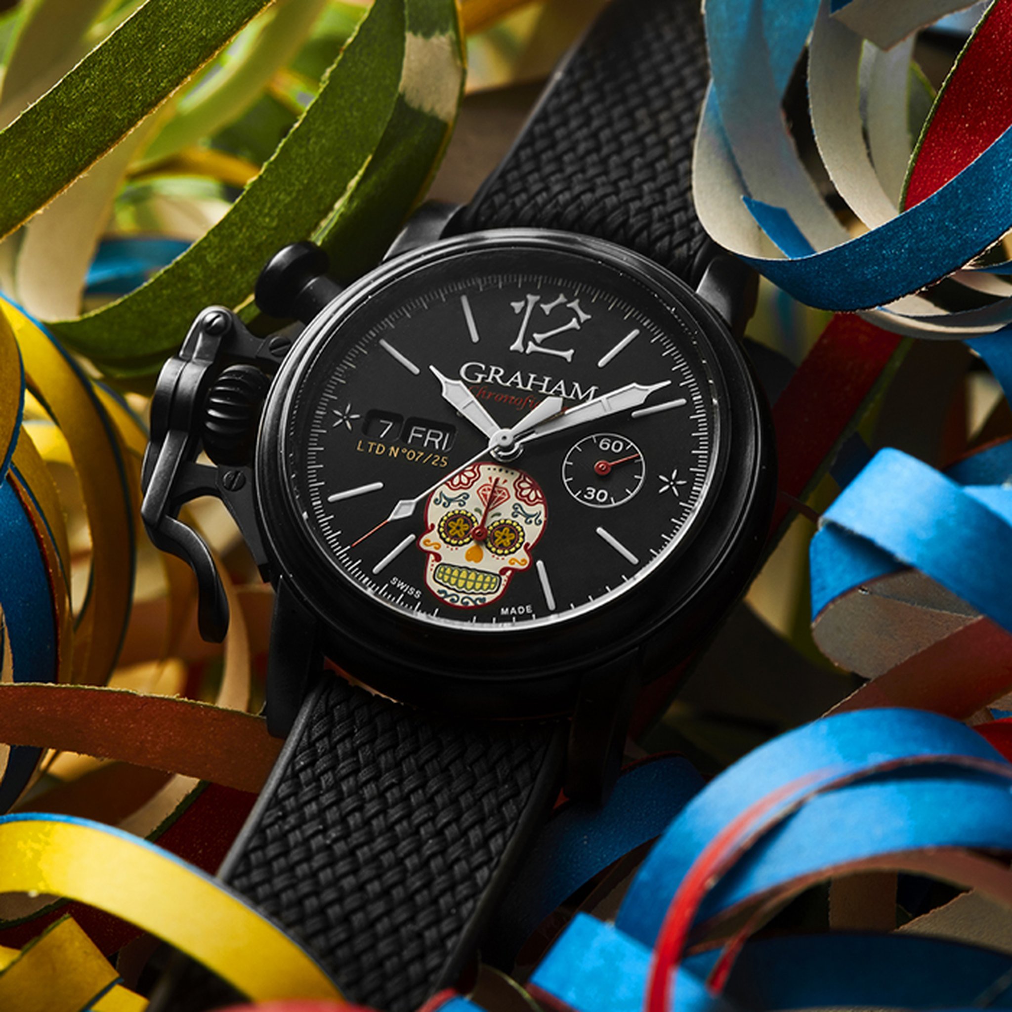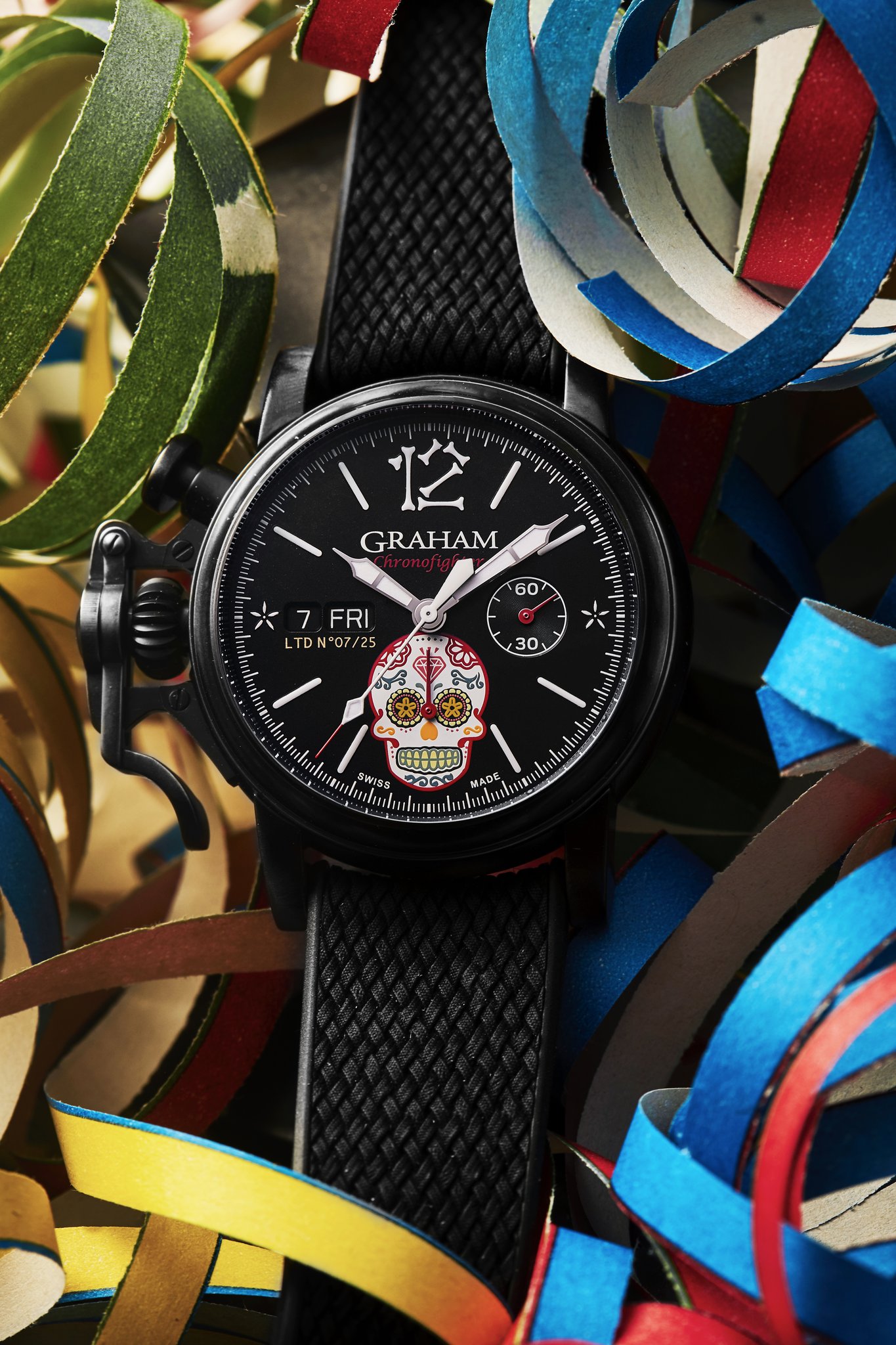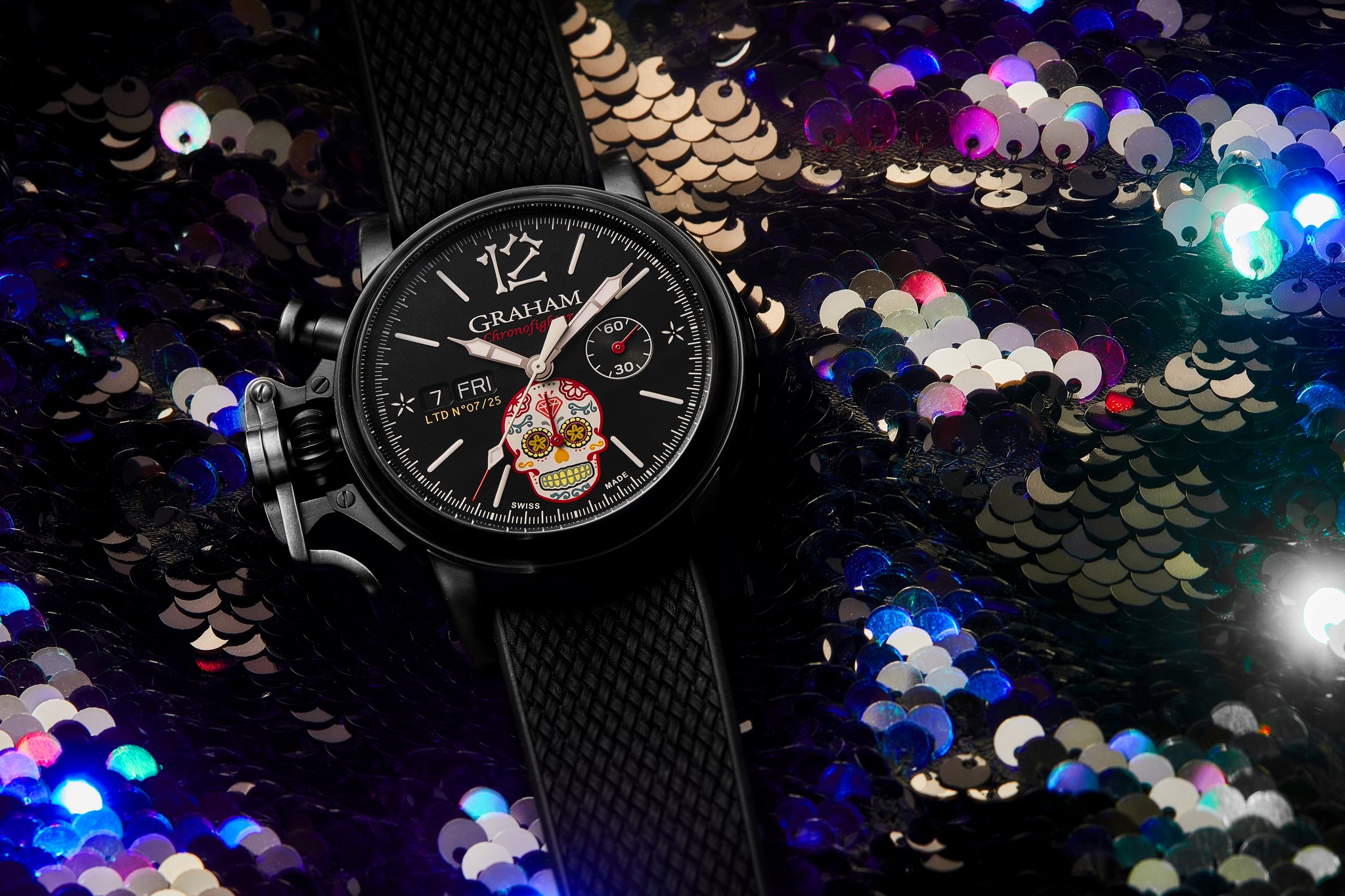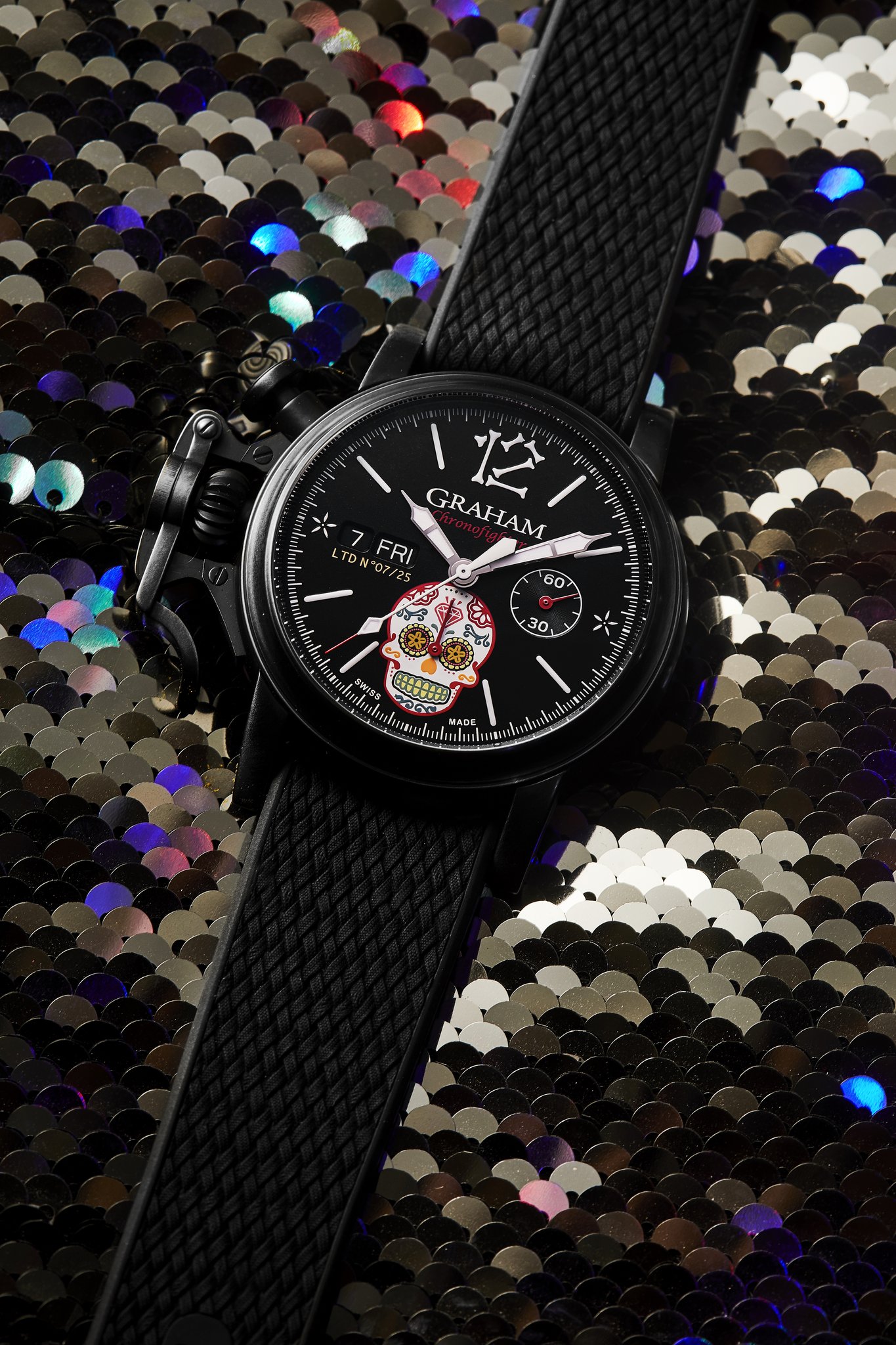 The distinctive start and stop lever on the left of the case is the renowned GRAHAM Chronofighter signature which enables to activate the chronograph functions. The system recalls early stopwatches used by World War 2 flying officers which were just large pocket watches strapped over bomber jackets. Instinctive and precise, it is a fail-safe system which does not distract the wearer because the lever on the left of the case is effortlessly reached with the right hand. The thumb, the fastest of all fingers, starts and stops the chronograph. The result is precise timing.