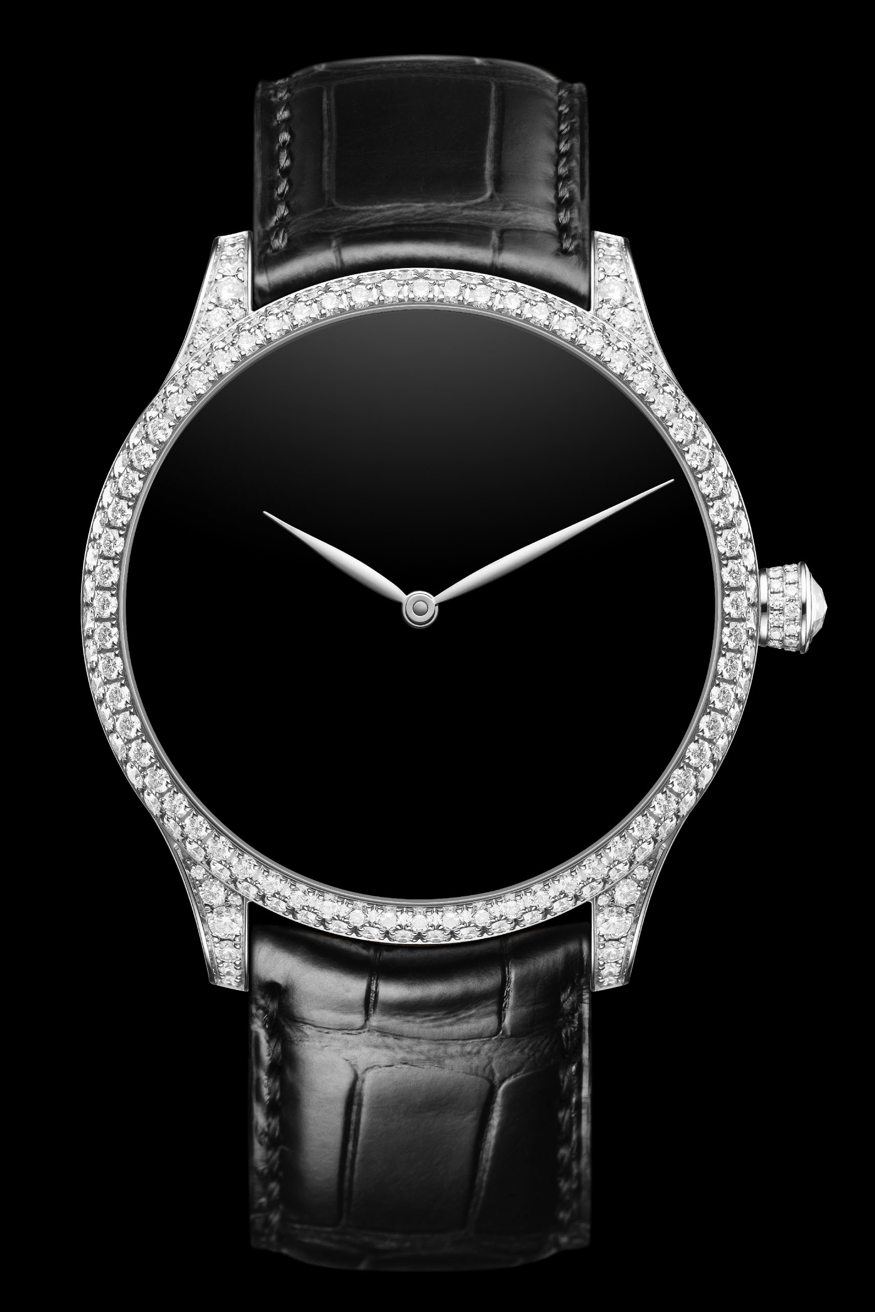 Drawing on its considerable expertise in producing Vantablack® dials, H. Moser & Cie. finds a new application for this high-tech material more commonly used in astrophysics for telescopes, or for military thermal camouflage, using it to give a glamorous twist to this sensual, curvaceous model. The roundness of the case, topped with a domed crystal, is reminiscent of the pocket watches and convex forms of the 1960s and the Bauhaus movement of the 1940s. Adorned with 313 dazzling diamonds, the white gold of the case offers an arresting contrast with the astral black of the Concept dial, absorbing light like an abyss and free from either logo or indices. With its exquisite exterior, the Venturer Concept Vantablack® Diamonds is the ultimate in elegance, perfect paired with either an evening dress or a dinner jacket, bold yet refined, traditional yet sexy, with astonishing depth and a lustrous shine.