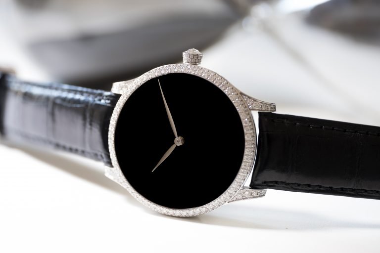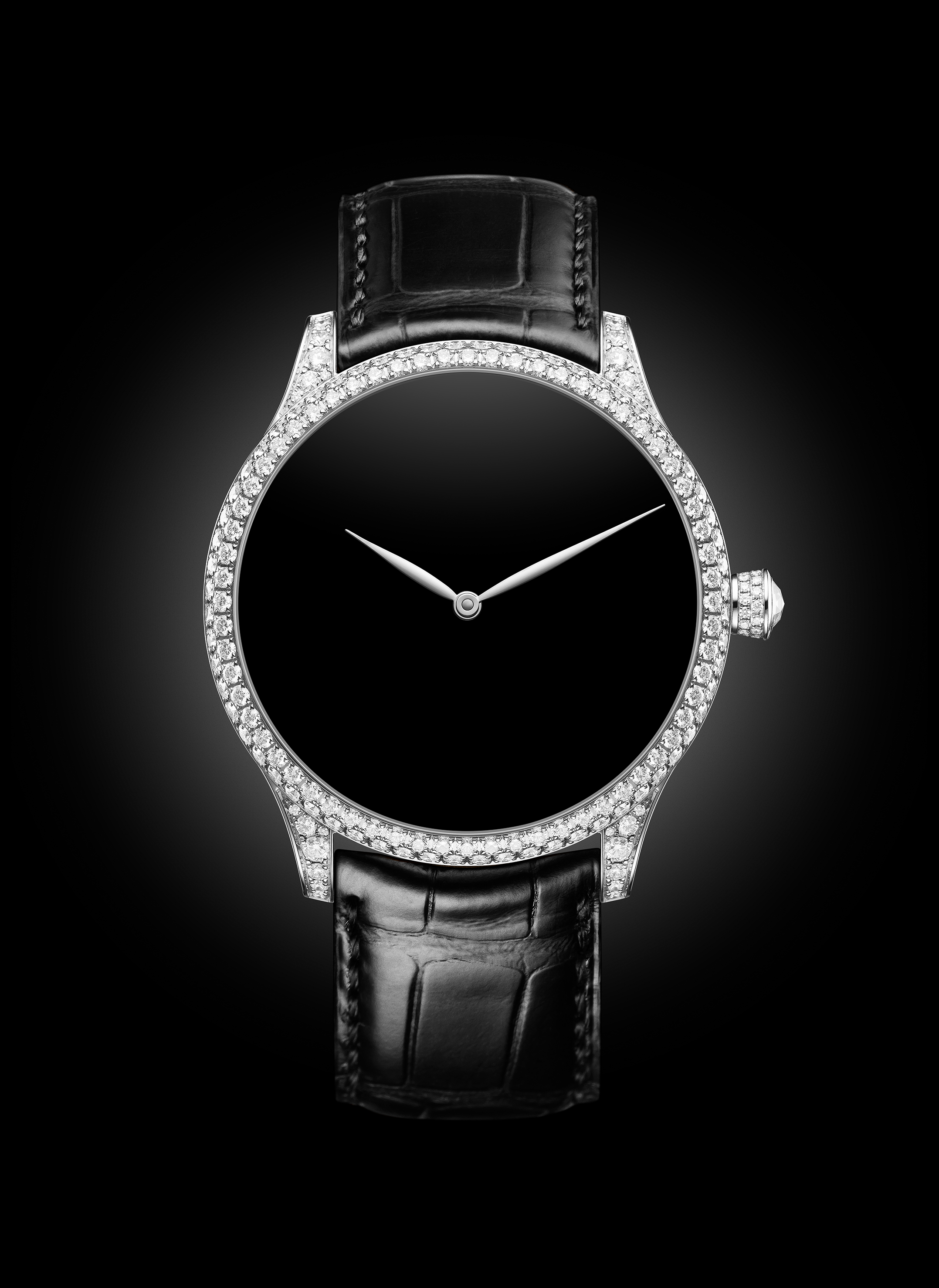 The Venturer Concept Vantablack® Diamonds from H. Moser & Cie. marries the purity of white gold and the brilliance of diamonds with the deepest black of a dial made from Vantablack®, an innovative material used in astrophysics. Playing heavily on contrasts, the Schaffhausen-based manufacture has produced a seductive, sparkling model with a 39 mm diameter case. It adopts a resolutely minimalist aesthetic, effortlessly elegant thanks to its pared-down dial.