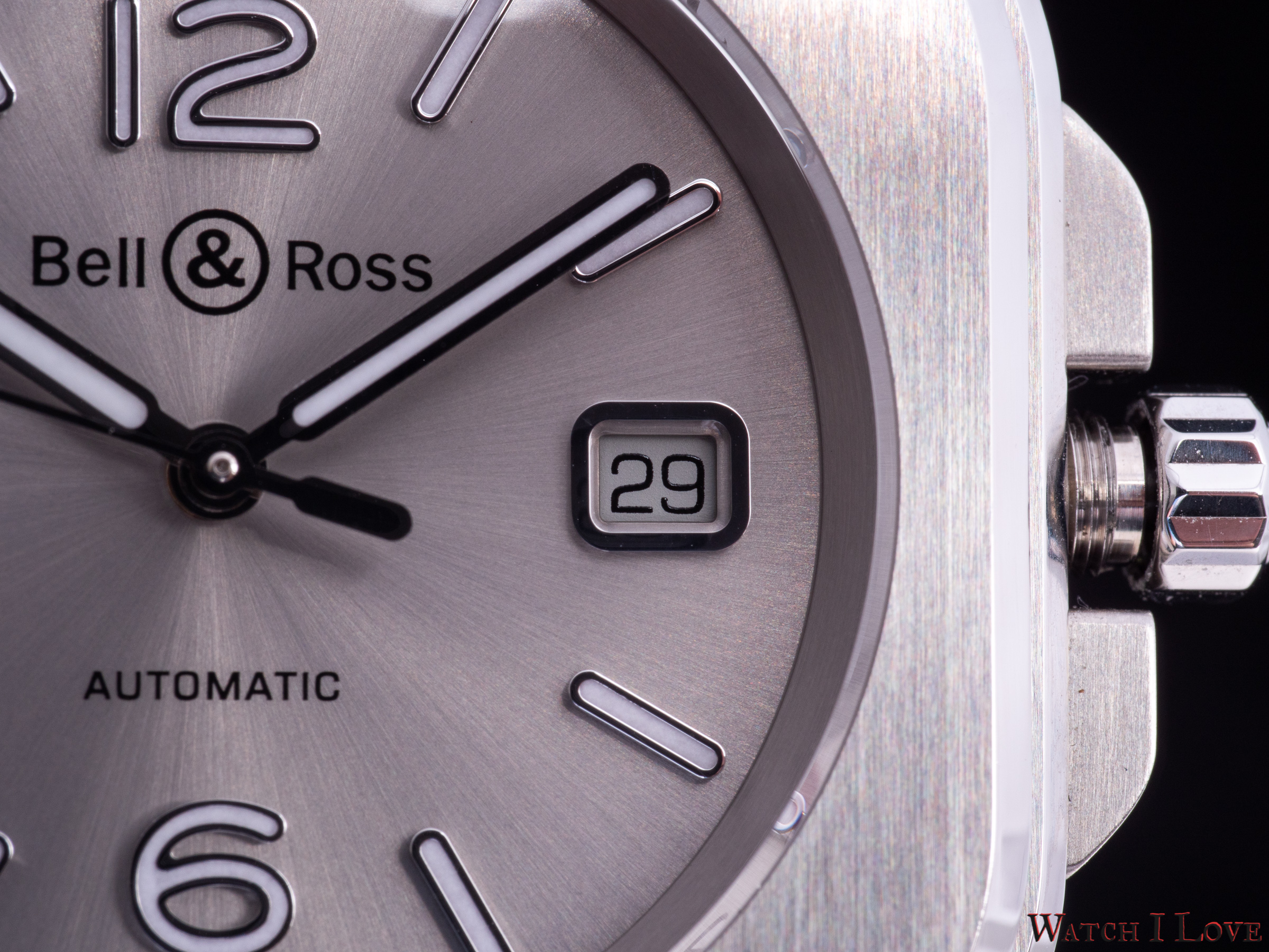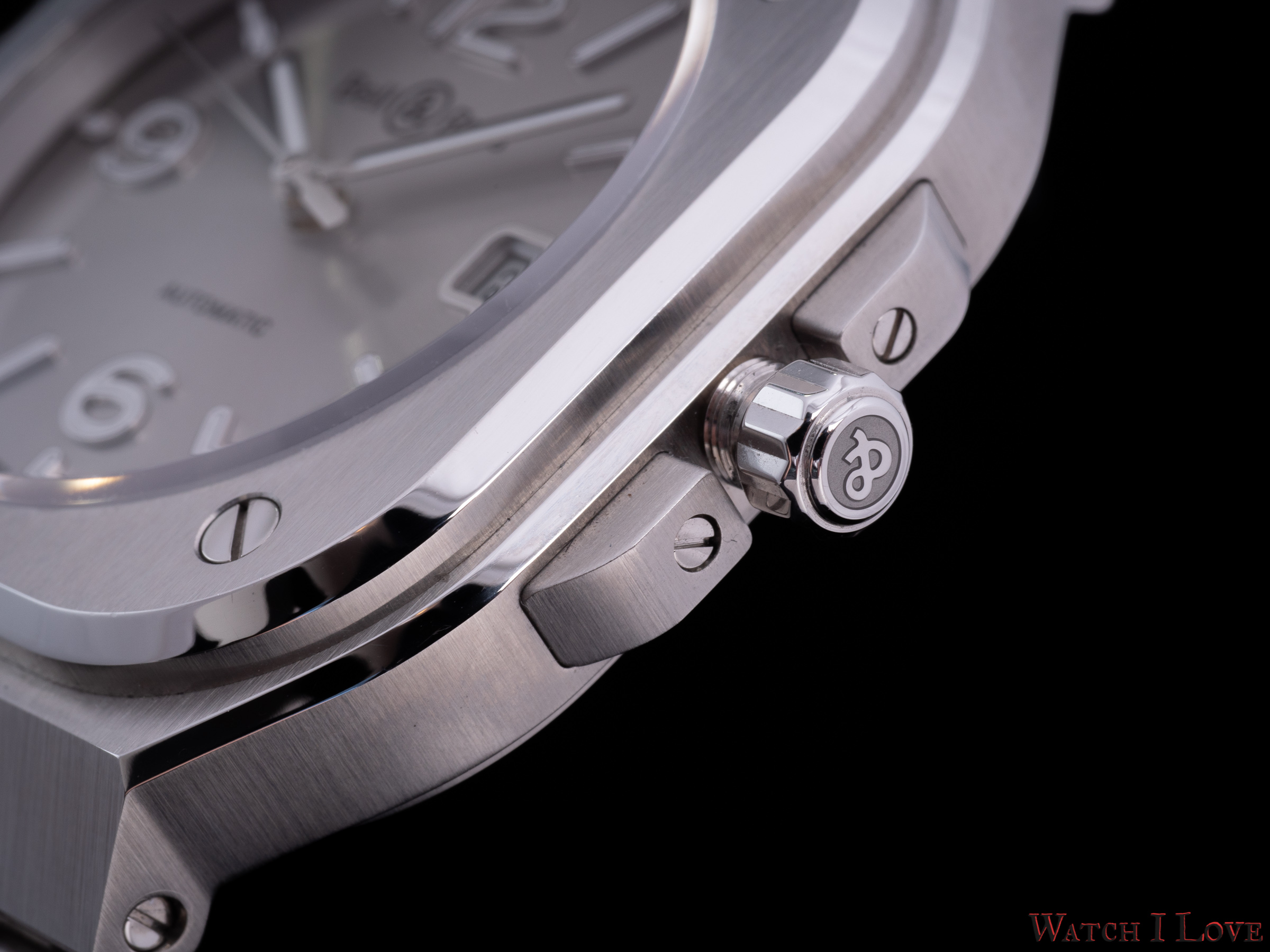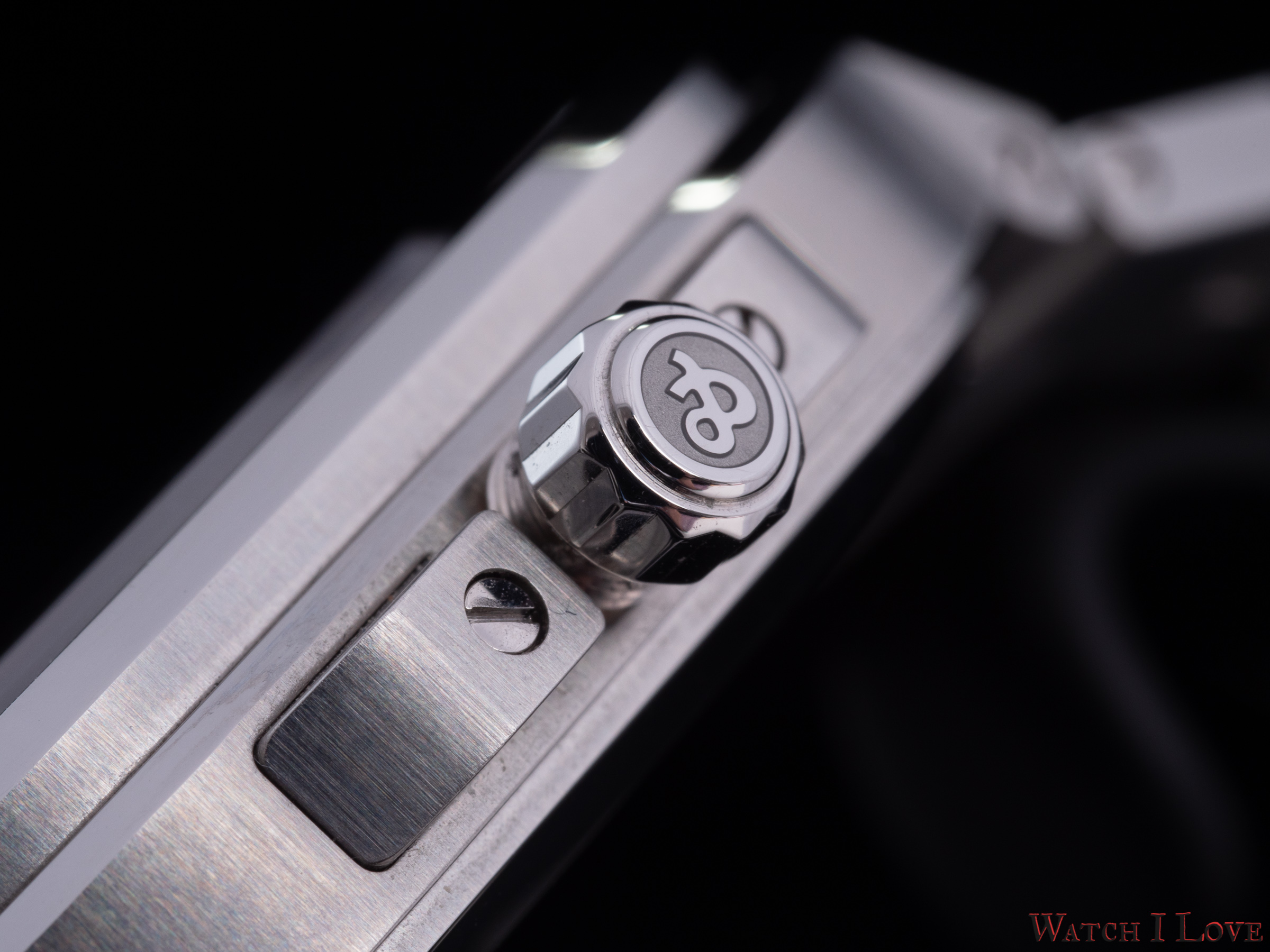 The crown is well protected by the brushed bumpers. It features the typical Bell & Ross logo in a raised medallion. Setting and winding impose no issues. But, as any other screw-in crown, of the wrist, is easier to use.
