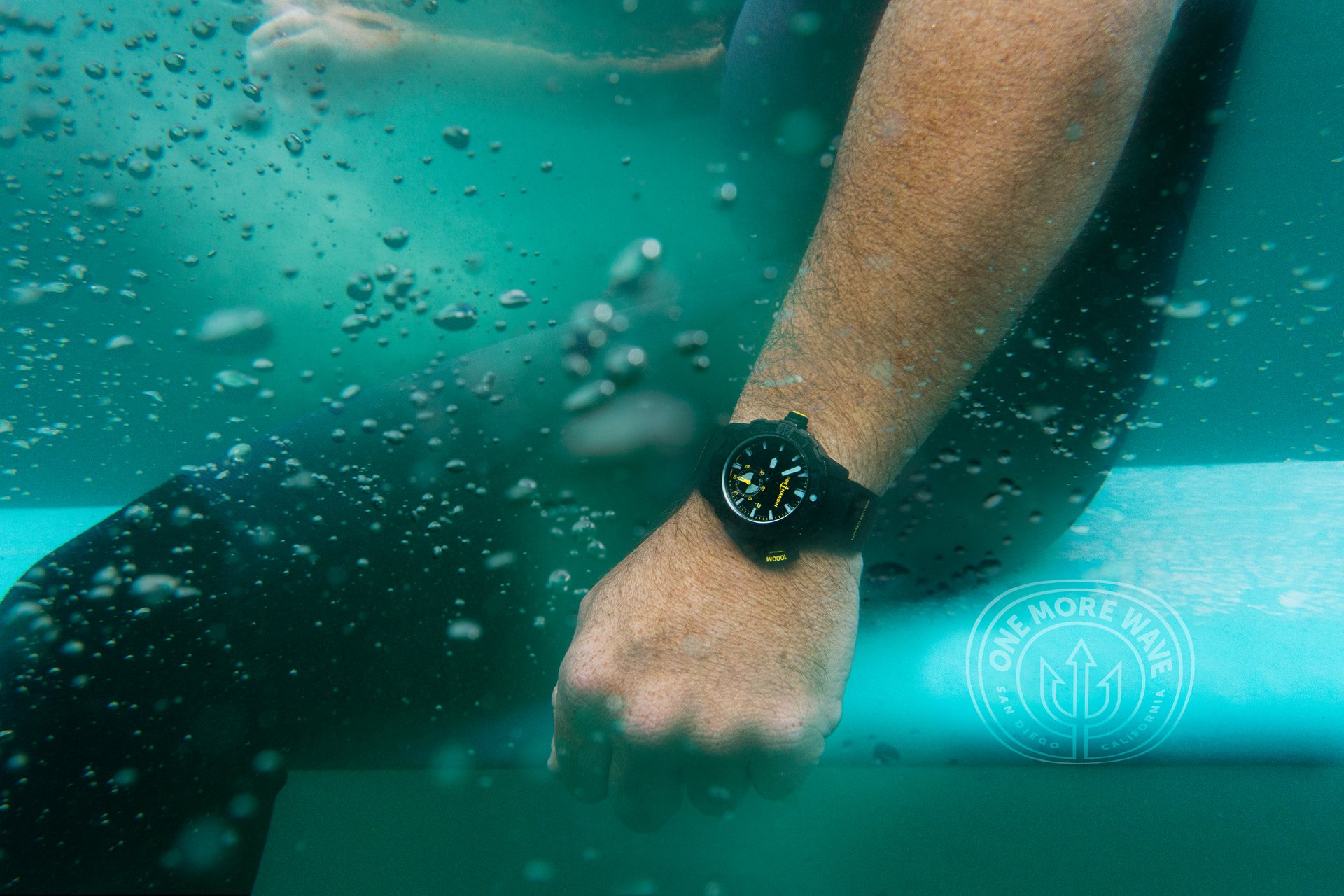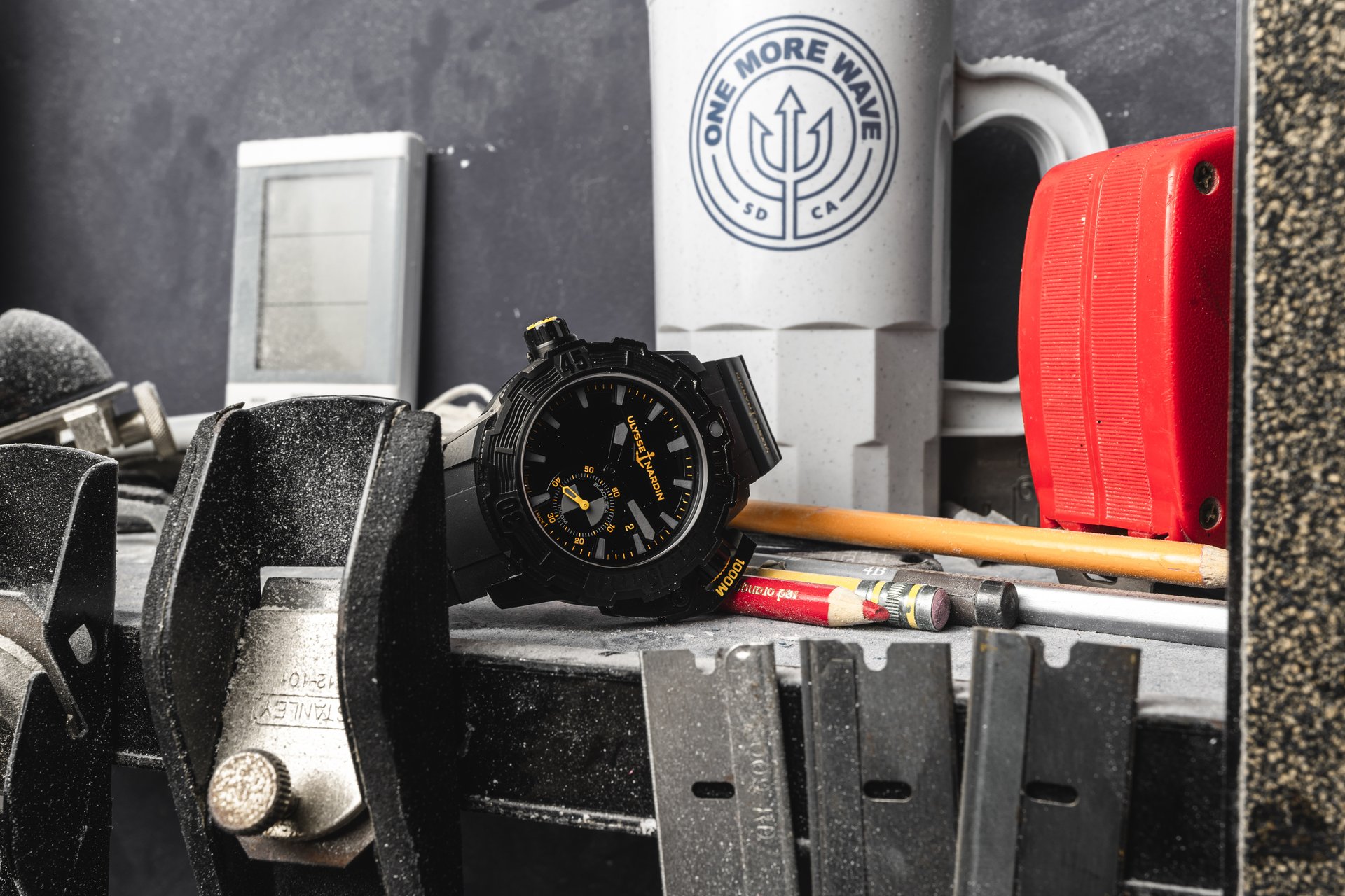 In addition to a financial contribution, Ulysse Nardin hopes to bring awareness and raise funds for the organization through the launch of the Diver Deep Dive “One More Wave.” The timepiece features a striking yellow and black design, with a black DLC titanium case and 1000m water resistance. The case-back is engraved with the “One More Wave” logo to signify the partnership. Members of OMW designed the limited edition timepiece as a watch that would stand up to the highly variable pressures experienced while surfing, while also subtly reflecting the founders’ background in amphibious warfare.