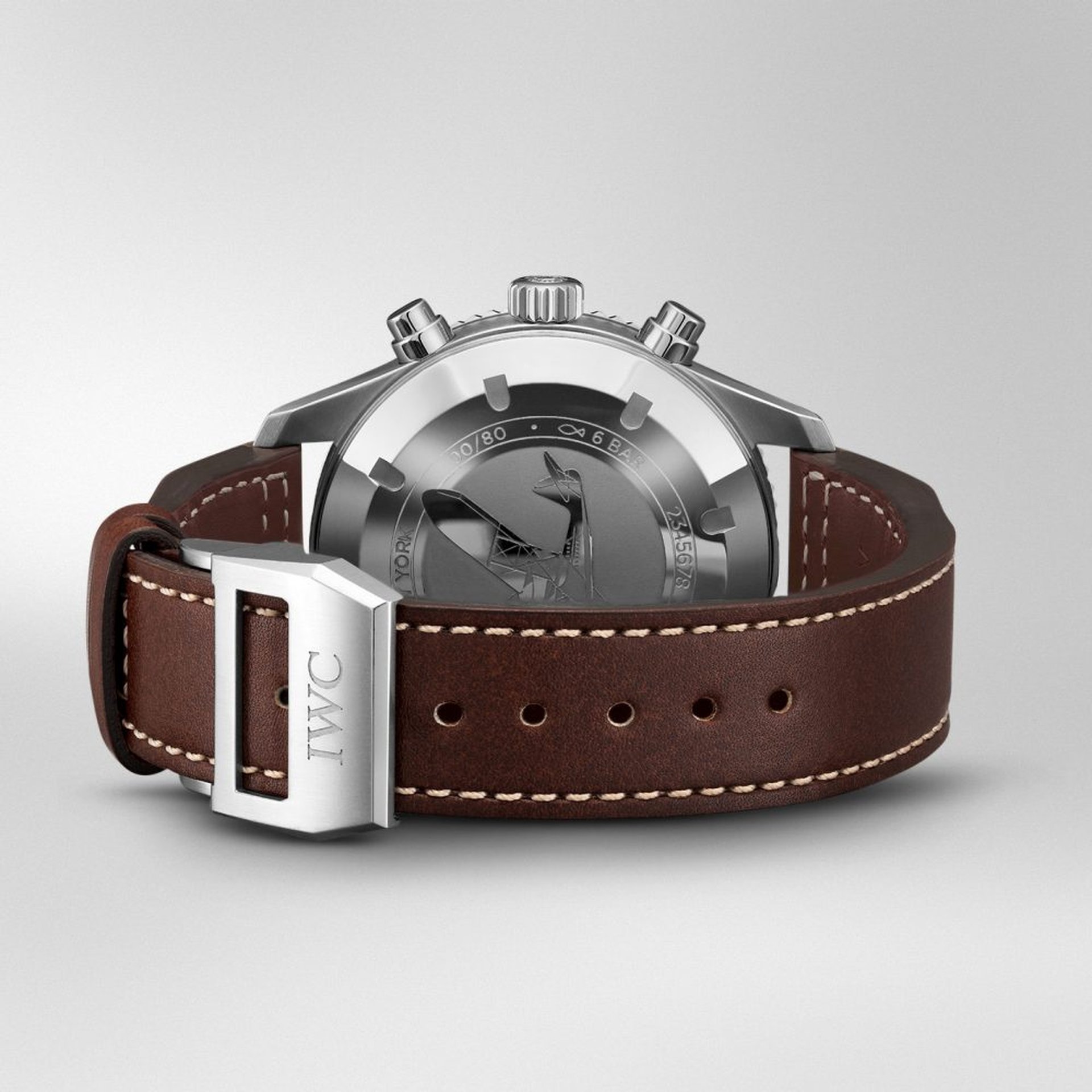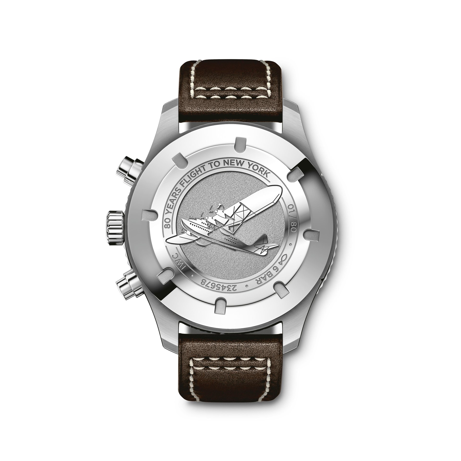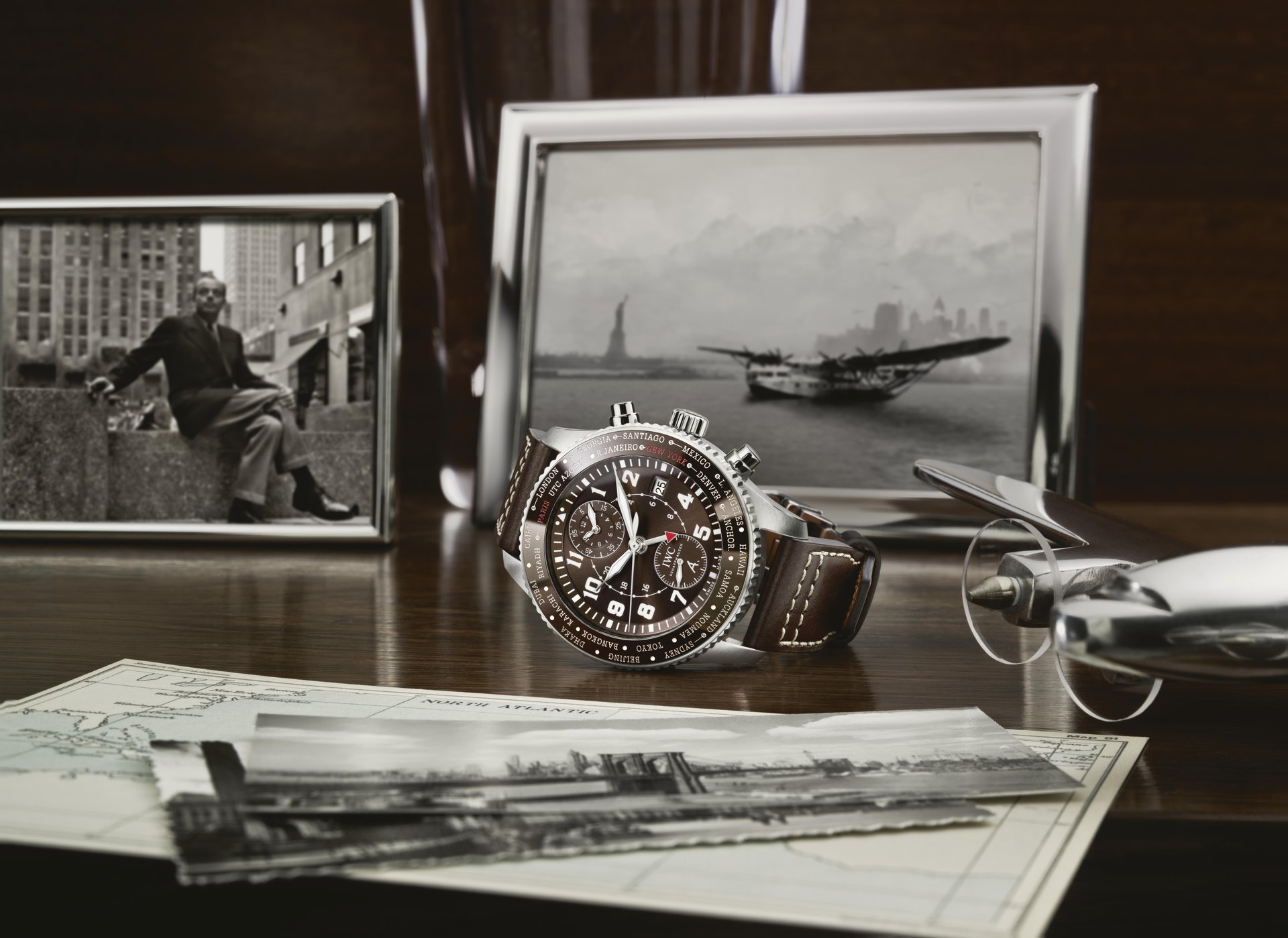 At the anniversary exhibition in New York, IWC also officially launched the Pilot’s Watch Timezoner Chronograph Edition “80 Years Flight to New York” (Ref. IW395003). In a nod to the transatlantic flight itself, the timepiece features the patented timezoner function, which allows the wearer to adjust the time zone by simply pressing down and rotating the bezel. On the bezel made of brown ceramic, “Paris” and “New York” are marked in red. The sepia-brown dial is inspired by the pilot suits from the era of Saint Exupéry, and the case back features an engraving of the Latécoère 521. The watch is powered by the IWC-manufactured 89760 calibre and features a chronograph function that displays the stopped hours and minutes combined on a s ubdial at “12 o’clock”.