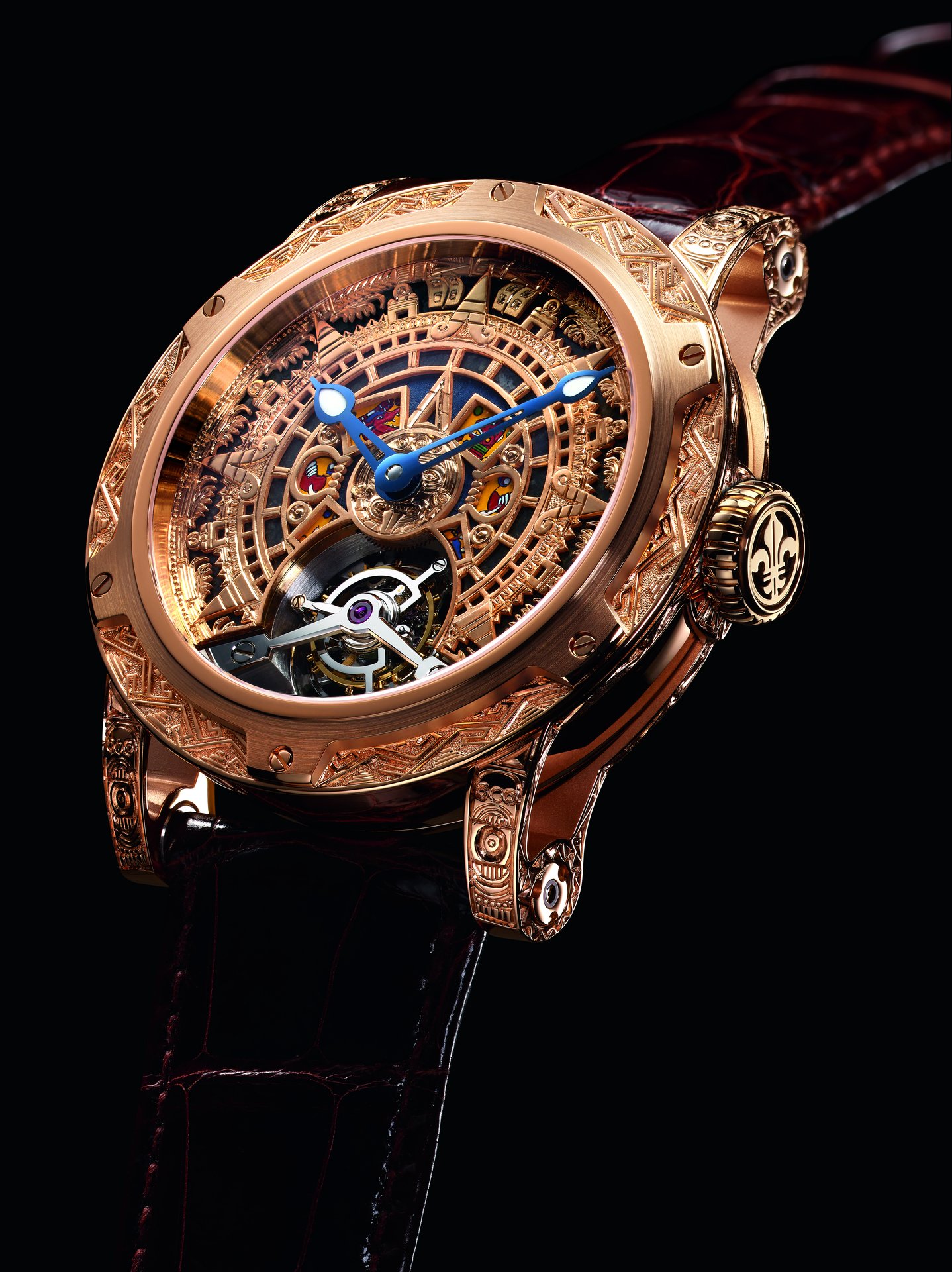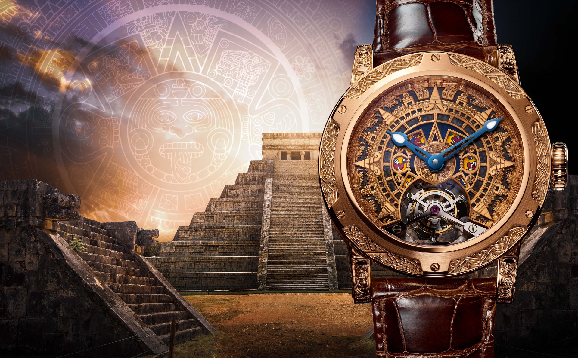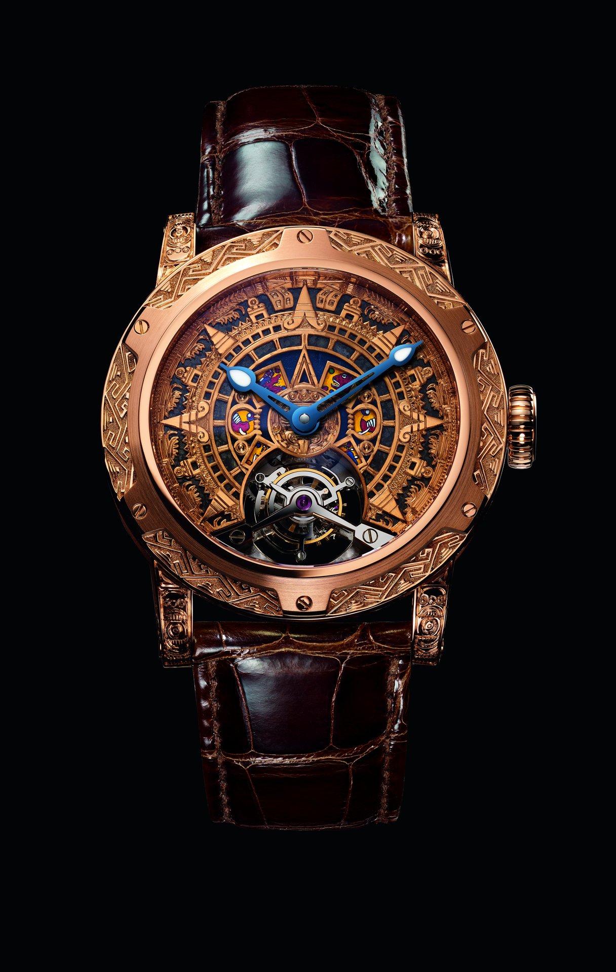 At the centre, the dial depicts the Sun Stone, one of the best-known and most iconic works in Aztec art. It was sculpted during the reign of the Aztec Emperor Axayacatl (1469-1481) to commemorate the New Fire ceremony in 1479. The enormous disc, 3.6 metres in diameter and weighing 24 tonnes, was cut from a single block of olivine basalt lava. Today, the Sun Stone is on display at the National Museum of Anthropology in Mexico city.
