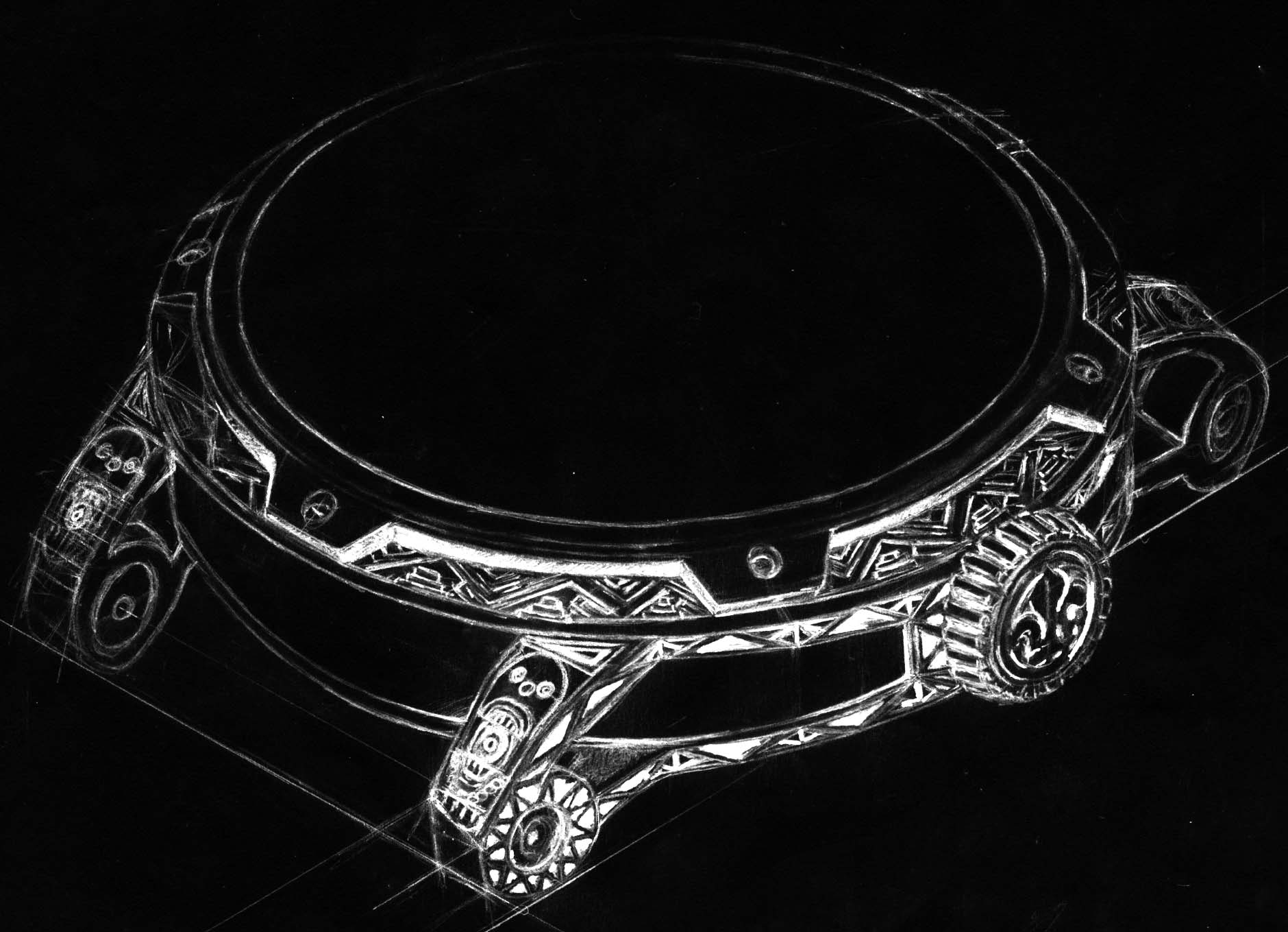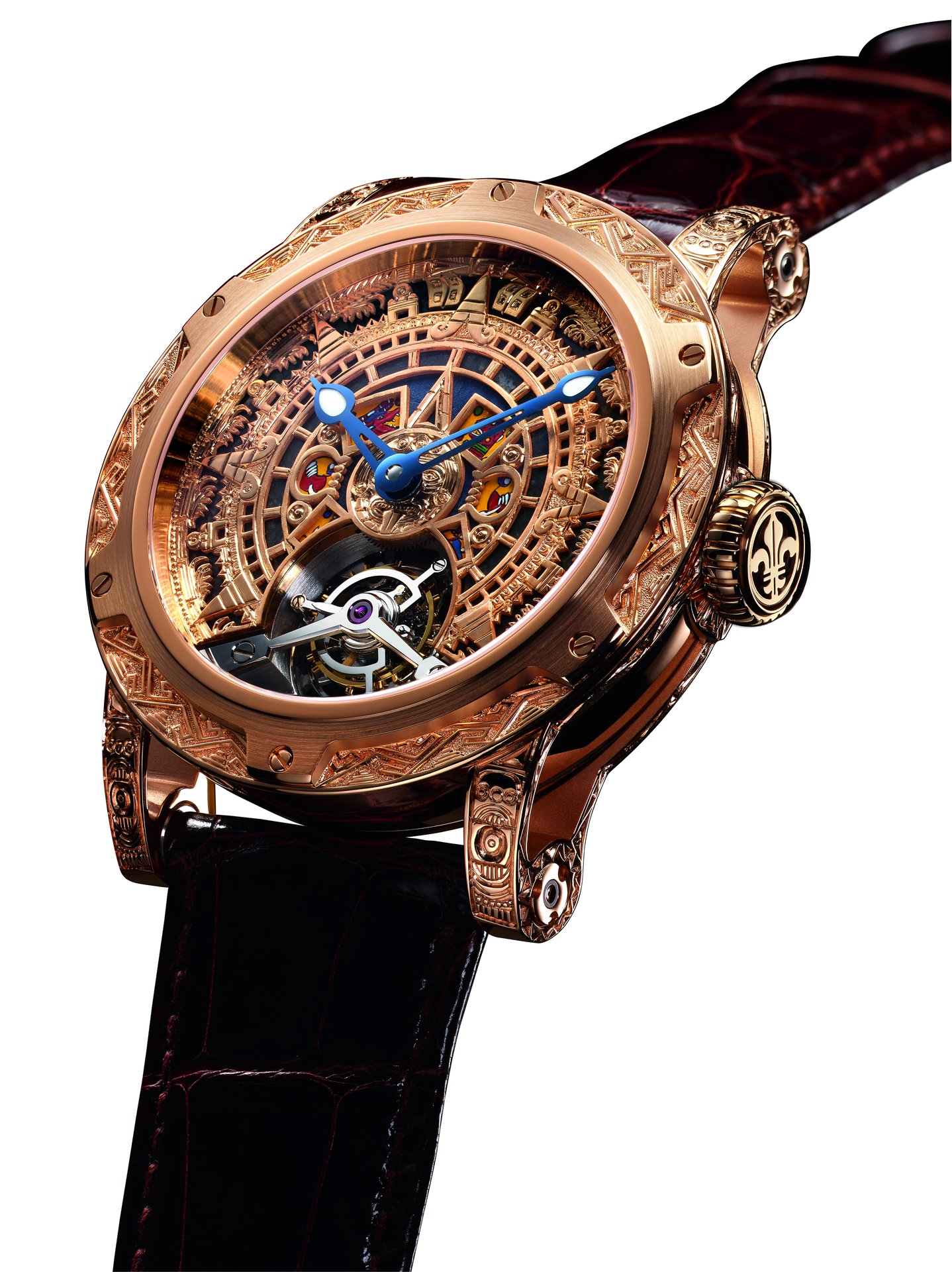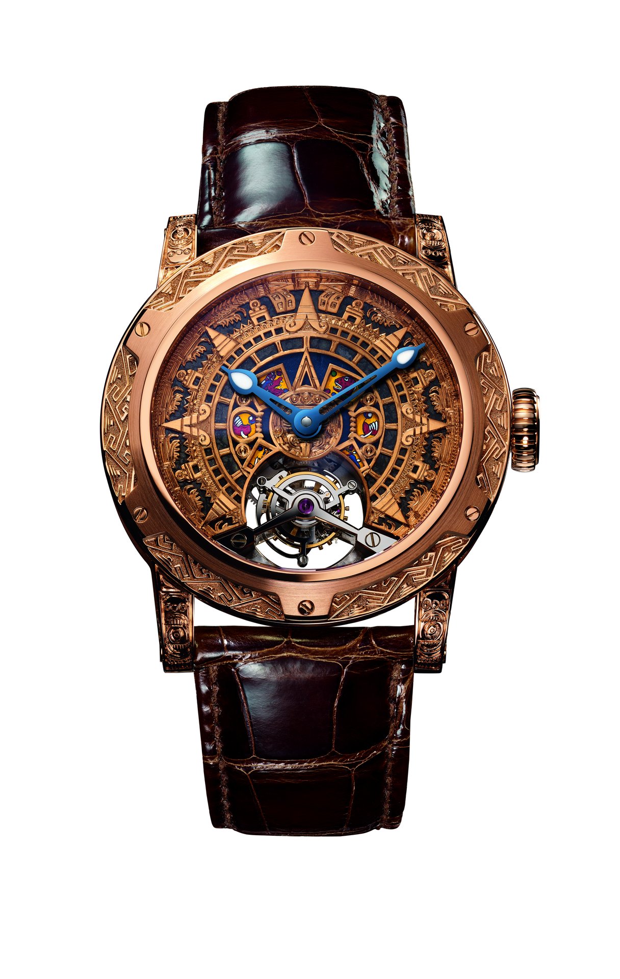 At the centre, the dial depicts the Sun Stone, one of the best-known and most iconic works in Aztec art. It was sculpted during the reign of the Aztec Emperor Axayacatl (1469-1481) to commemorate the New Fire ceremony in 1479. The enormous disc, 3.6 metres in diameter and weighing 24 tonnes, was cut from a single block of olivine basalt lava. Today, the Sun Stone is on display at the National Museum of Anthropology in Mexico city.