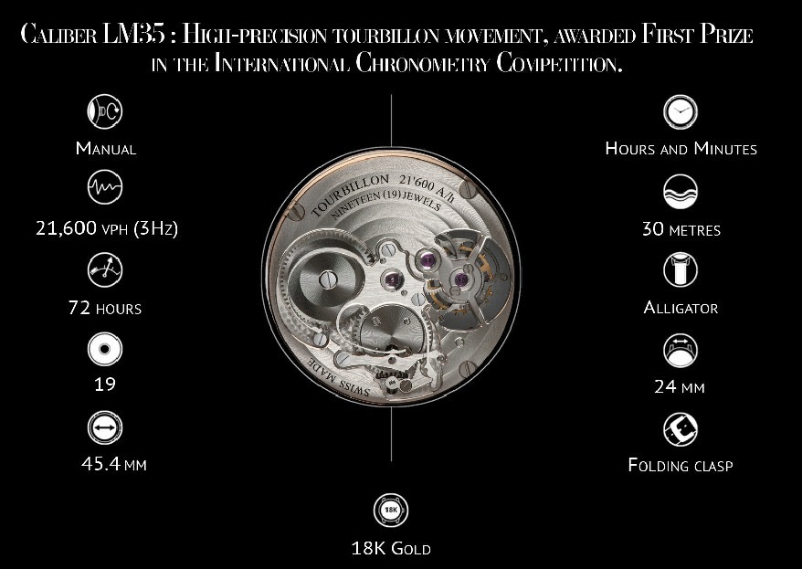 ‘Only Mexico’ is fitted with Louis Moinet’s mechanical tourbillon. This won the gold medal at the most recent International Chronometry Competition – and beats at a rhythm of 21,600 vibrations per hour.