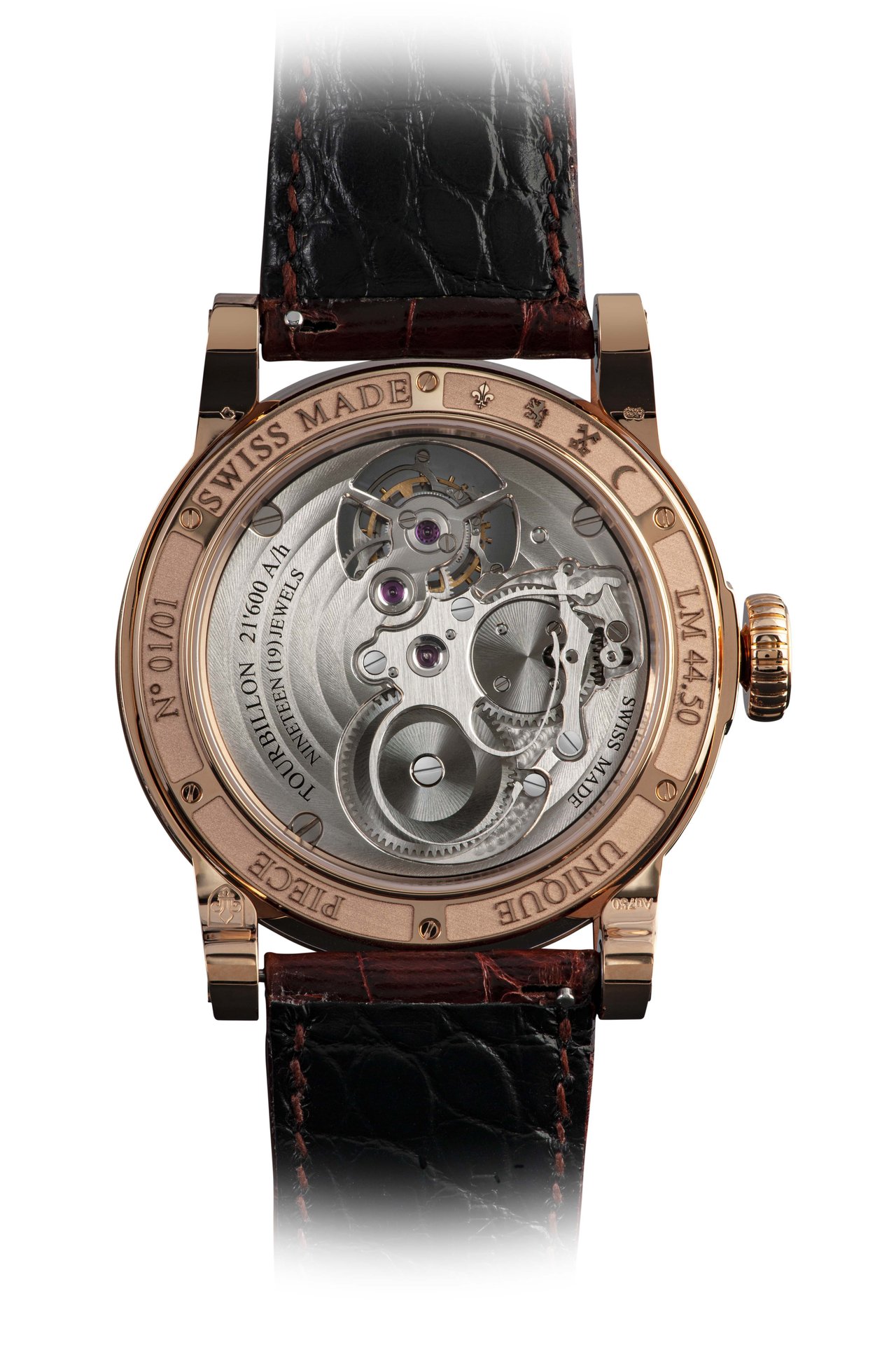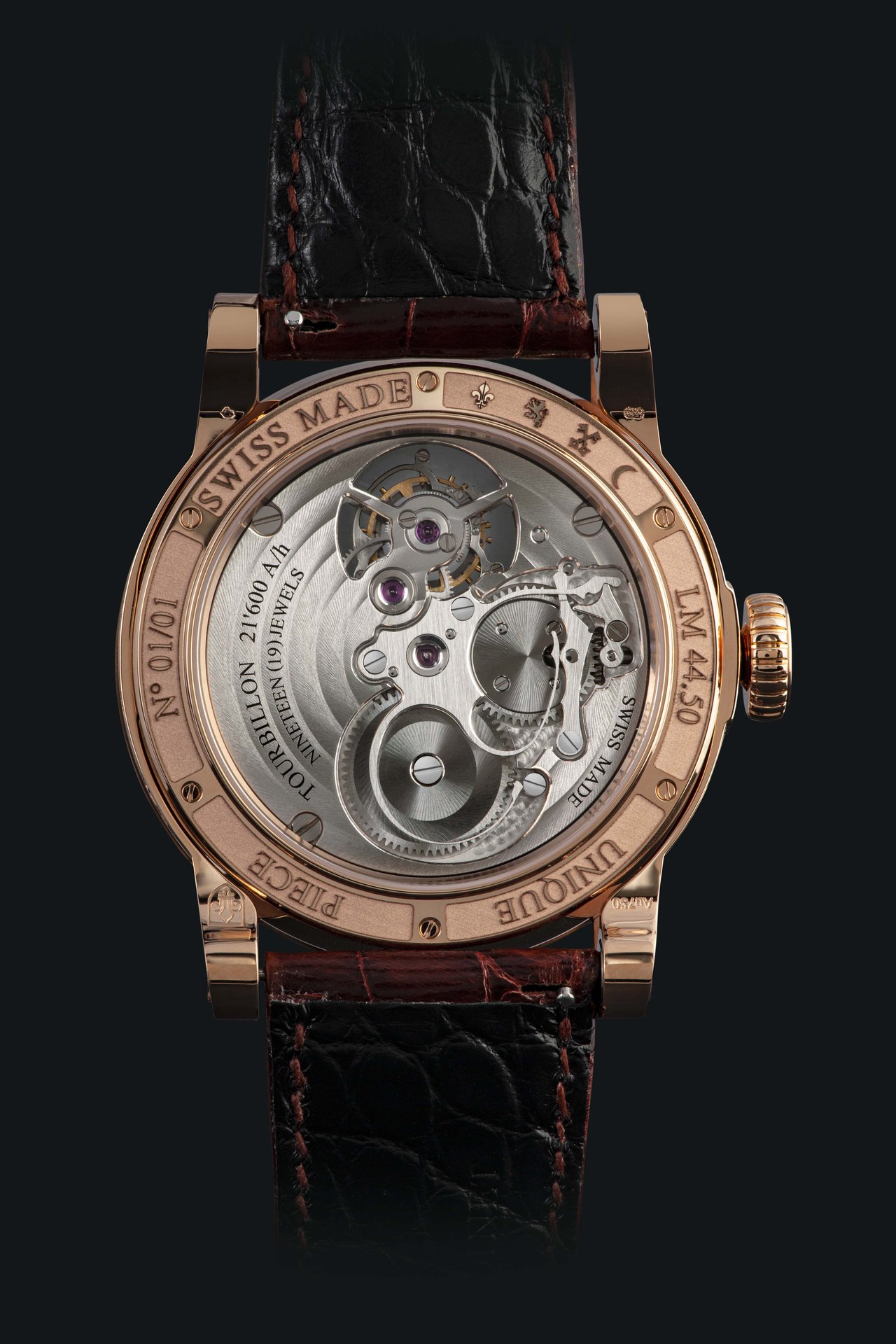 Louis Moinet’s legendary NEO case, cut from polished, satin-effect 5N rose gold, accentuates the imposing character of the piece. It owes its distinctive silhouette to the application of a large number of brand-new technologies. Everything is constructed around two horizontal bridges, spanning the piece and securing the strap in place at each end of their lugs.