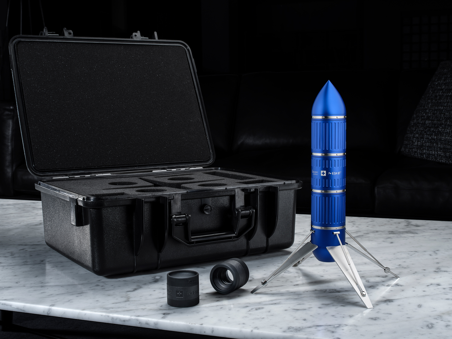 The anodized aluminium top rocket section doesn’t just minimise aerodynamic drag, it points toward space providing a constant reminder that there’s more to discover out there. The nose cone can be attached to any of the modular “stage” components using the same bayonet system.