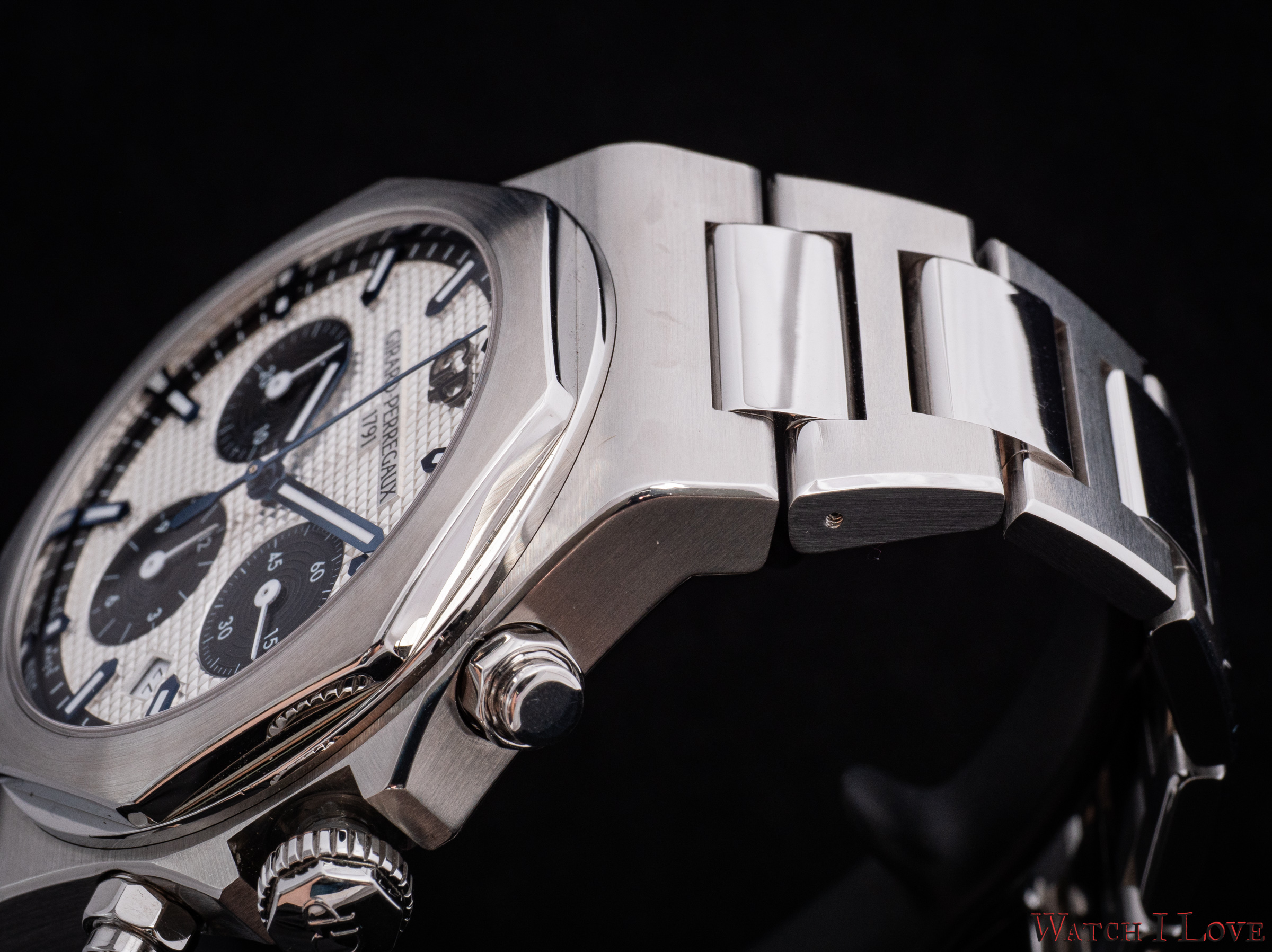 As mentioned earlier, the bracelet takes the beauty of the Laureato’s face to another level. The combination of polished inner links and brushed elements is fabulous. Moreover, the exterior side of the links features a polished beveling that continues the design of the case. The triple folding clasp is comfortable. The end link stands out with the “GP” logo engraved on a matt-polished area.