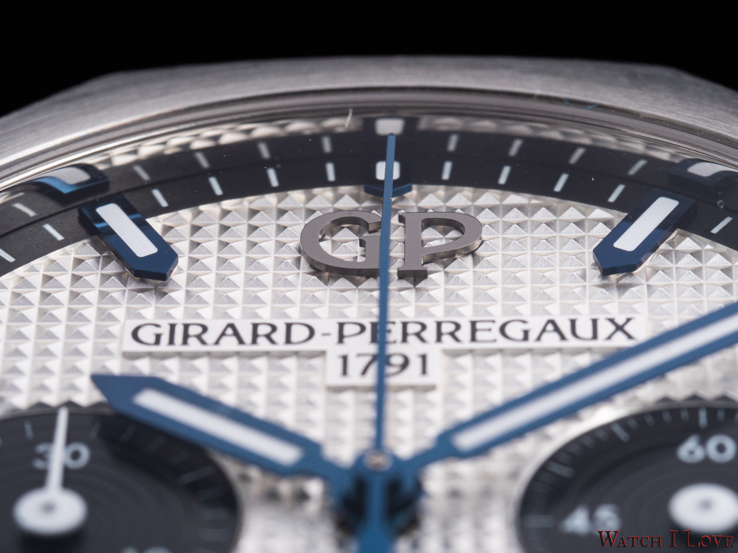 Girard-Perregaux Laureato 42mm Chronograph Ref. 81020-11-131-11 is powered by the calibre GP03300-0137. Since it is hidden under the ful steel caseback, we can only speculate what is really there. But I expect nothing less than on the three hands’s GP01800.
