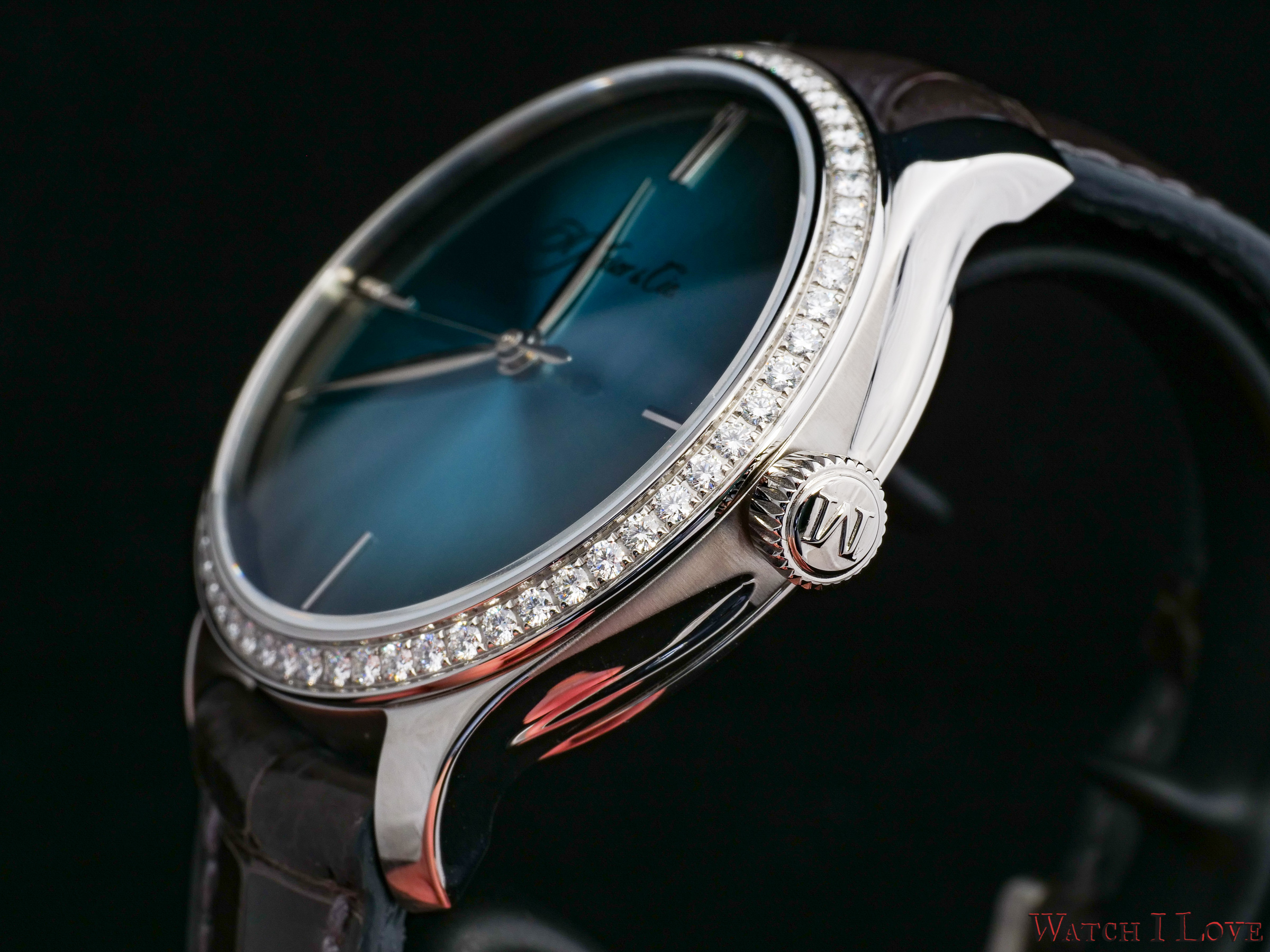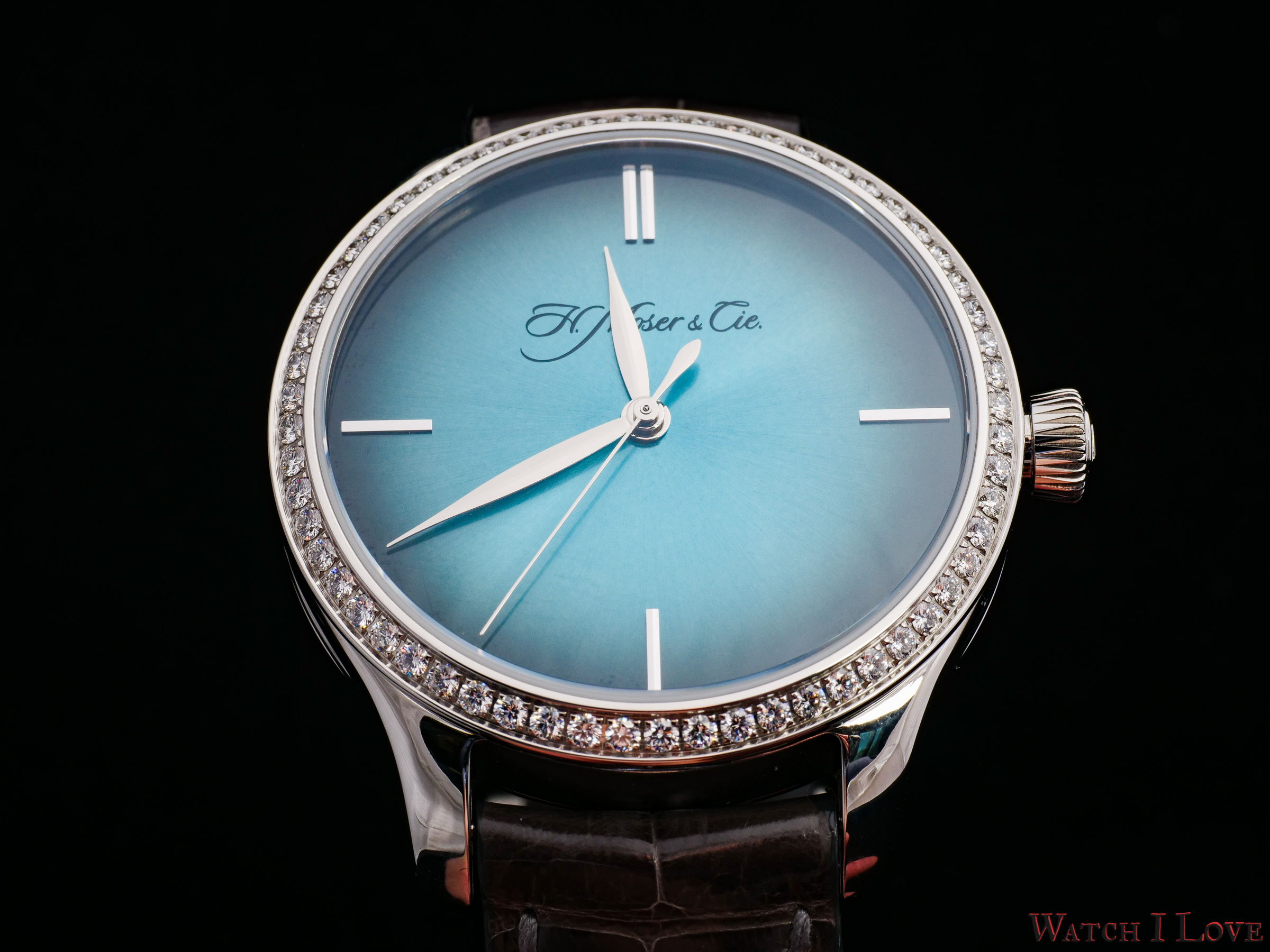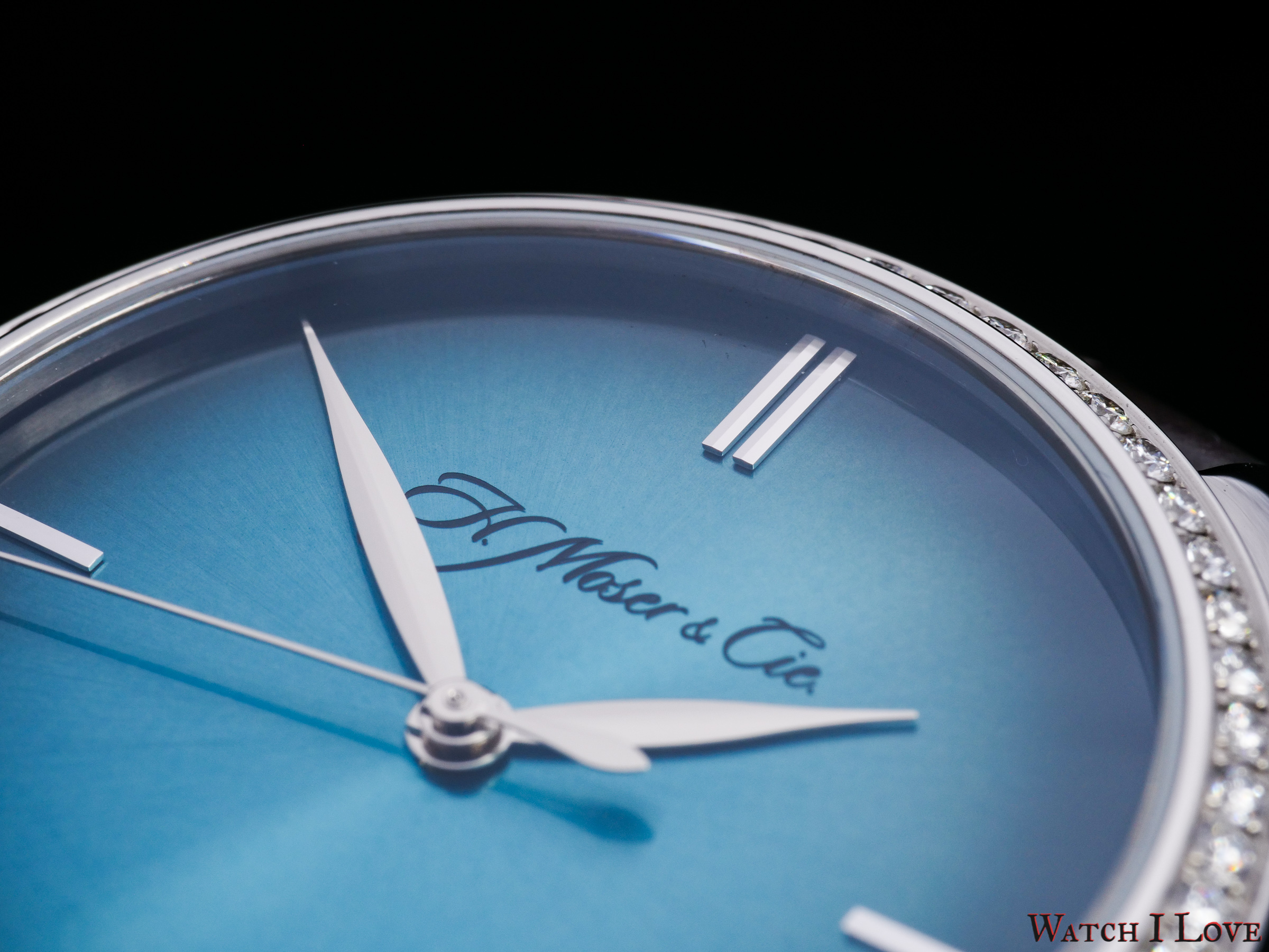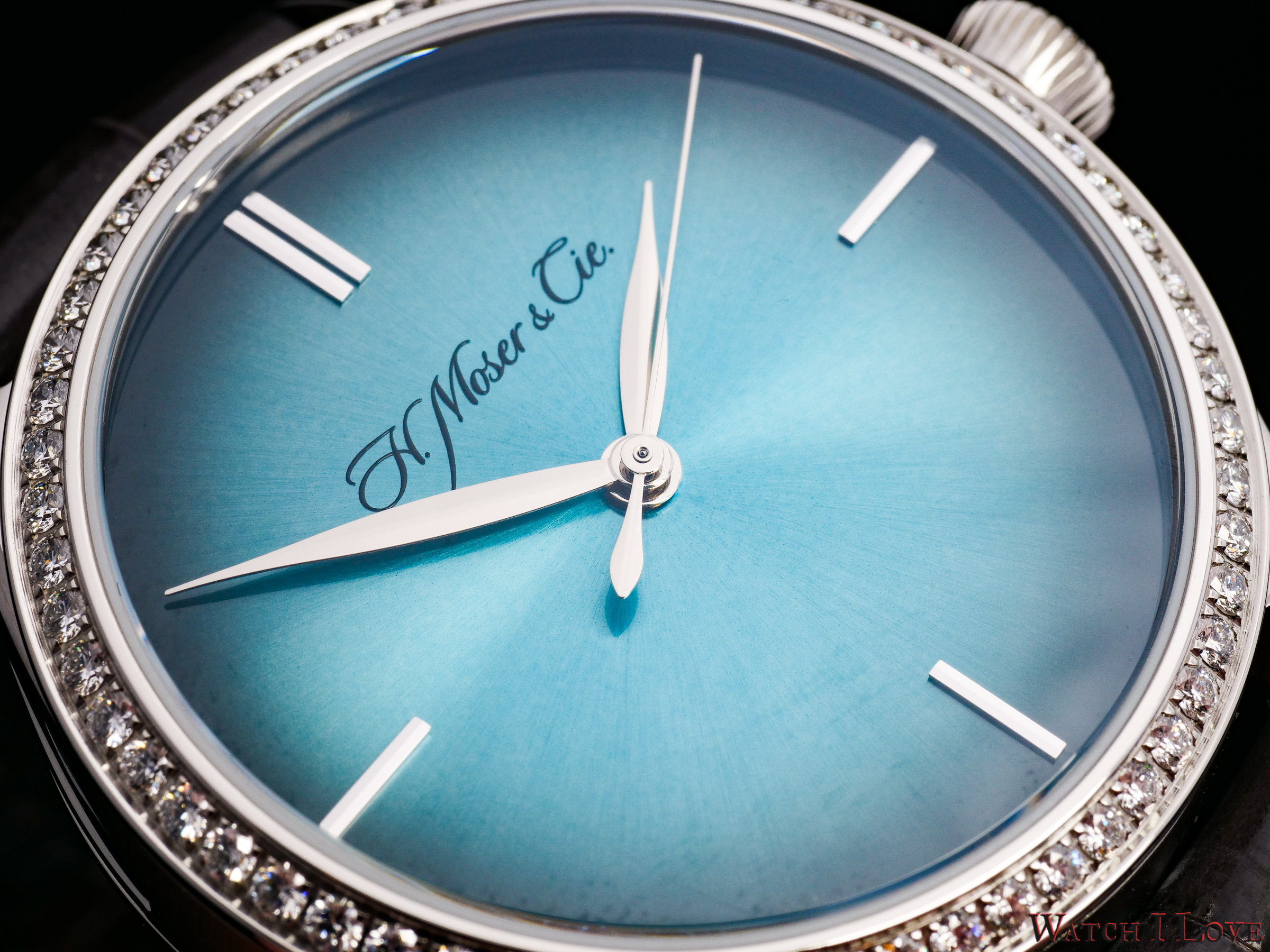 H. Moser & Cie Endeavour Centre Seconds Diamonds Purity has a signature sunray blue fumé dial. The simplicity, specific to many of the Moser timepieces, is also present. The leaf hands and four indexes are the only addition to the dial. And no, I did not omit the signature name printed on the dial. I just kept it for the decorative part. The signature highlights the dial’s degrade effect.