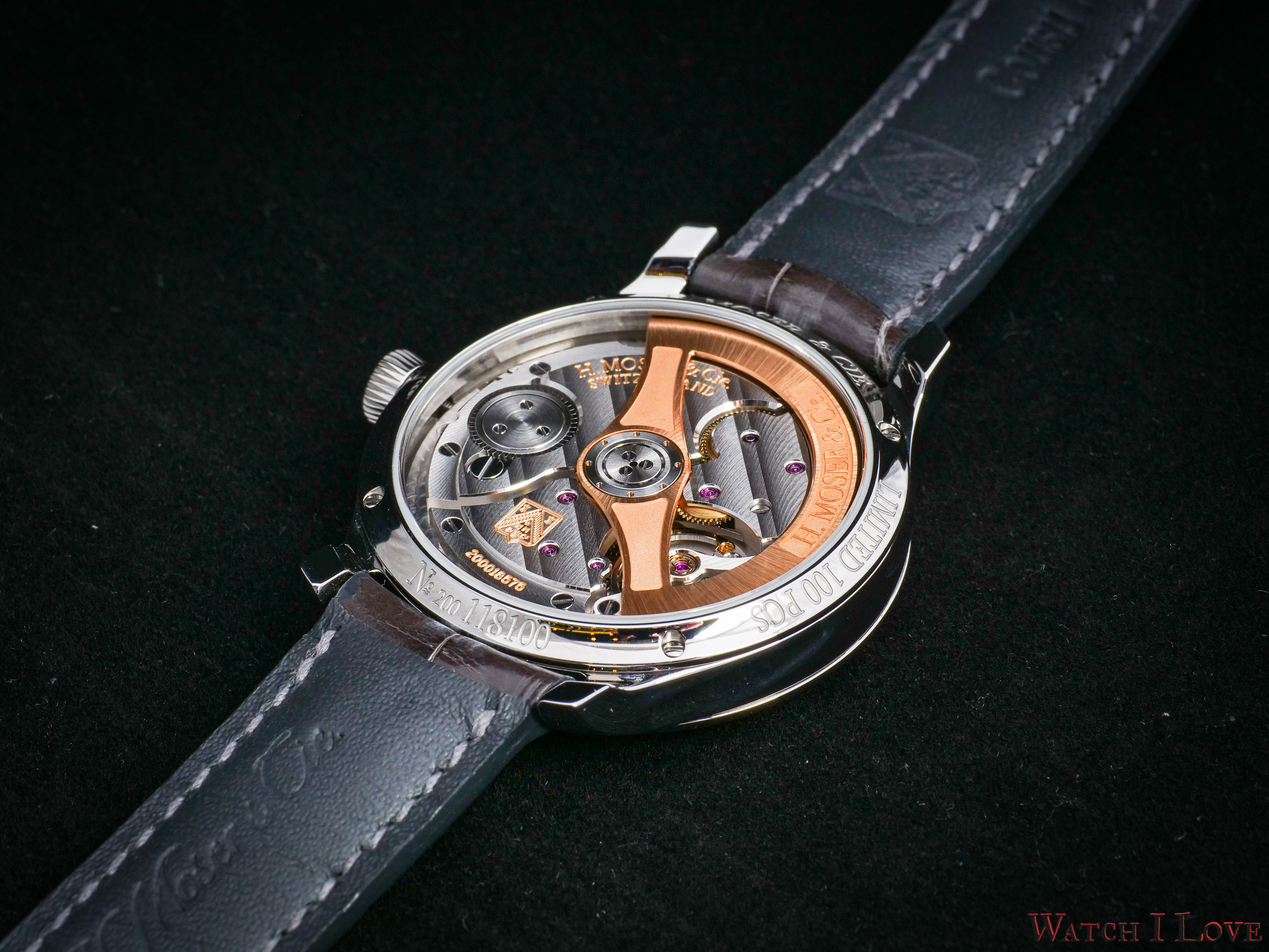 The movement’s architecture is compact with modular looking construction. The movement was launched in 2017 and it is used in the Centre Seconds line (also in the Pioneer Collection). The movement is lavishly decorated with Moser stripes, straight chamfering with polish, perlage. The winding is assured by the solid gold rotor weight engraved with the H. Moser hallmark.