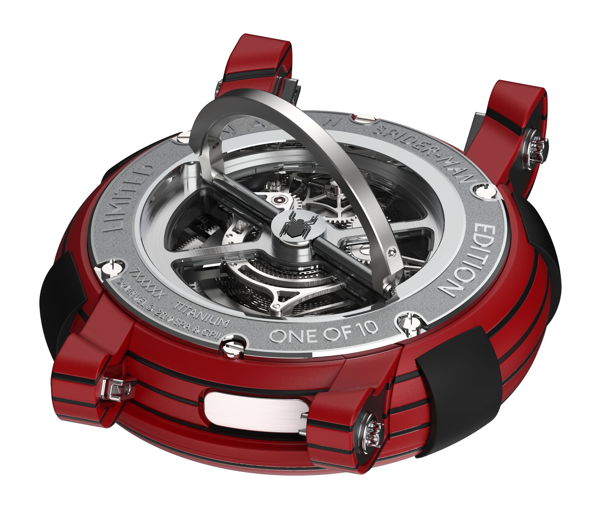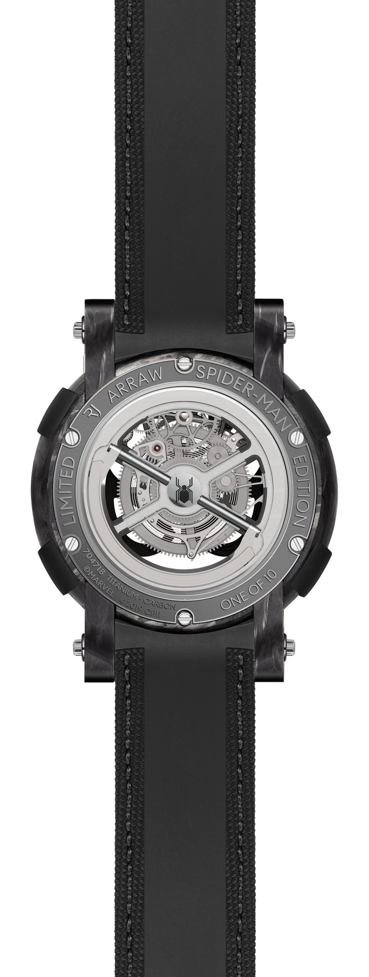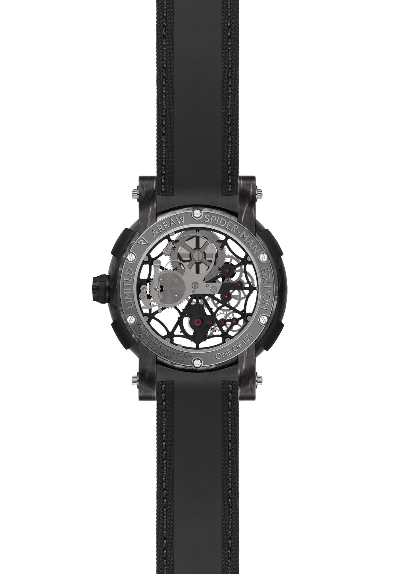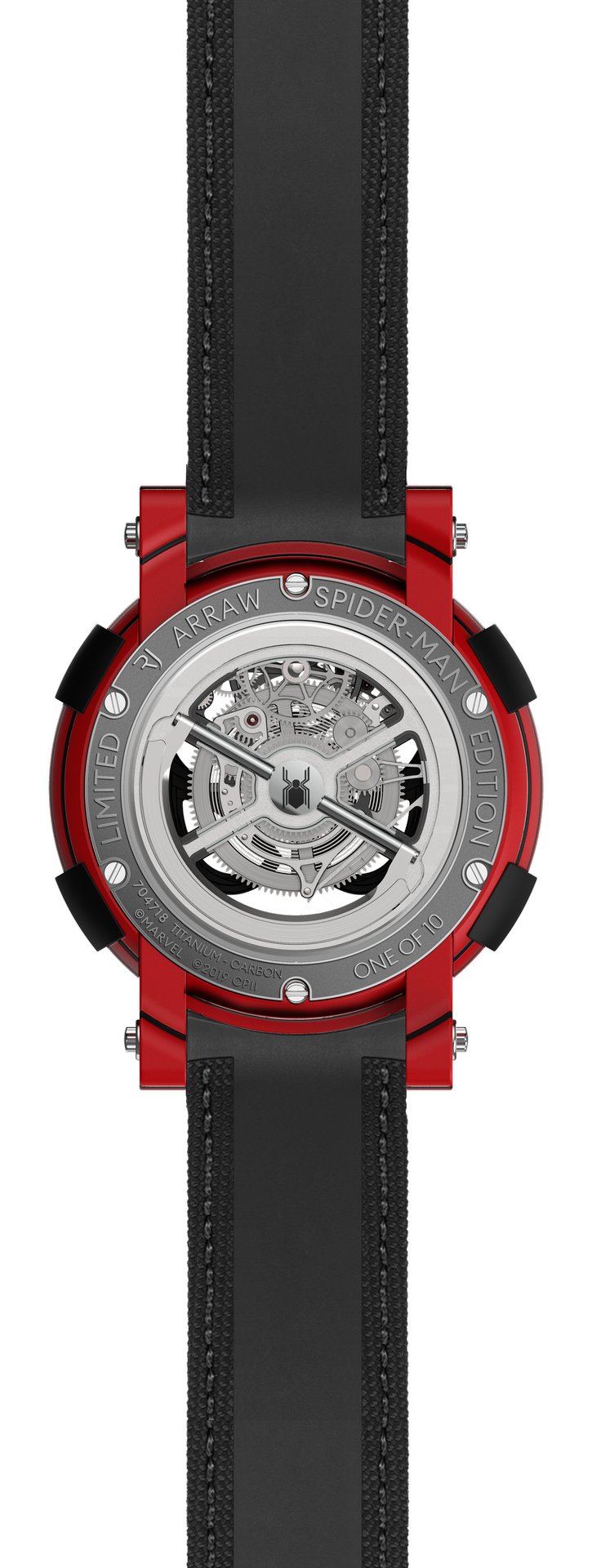 In order to maintain perfect symmetry, the ARRAW Spider-Man Tourbillon case has no crown. Winding of the barrel’s mainspring is done by lifting a hoop found on the case back, then turning it like a key, a faster winding method than a traditional crown provides.