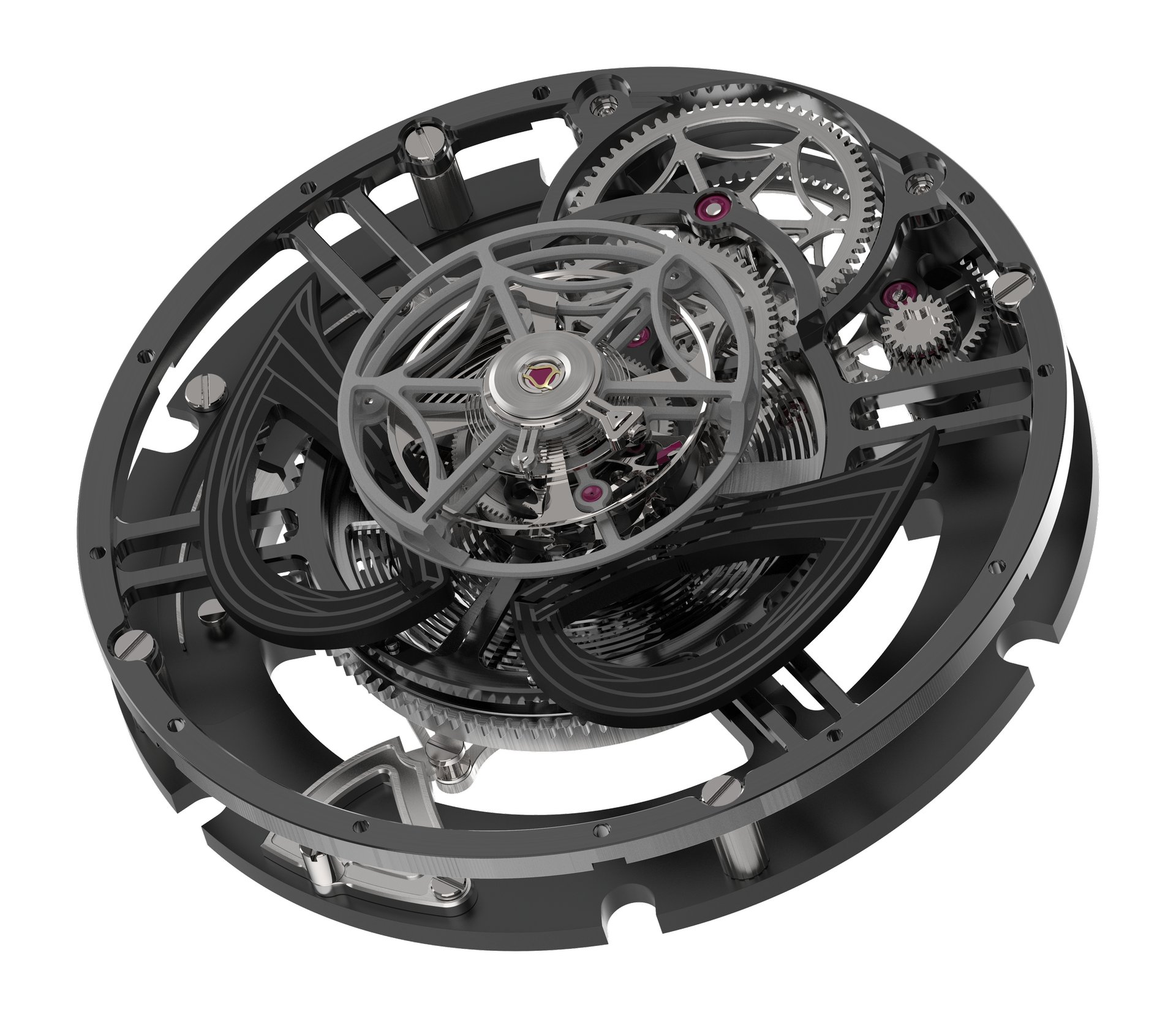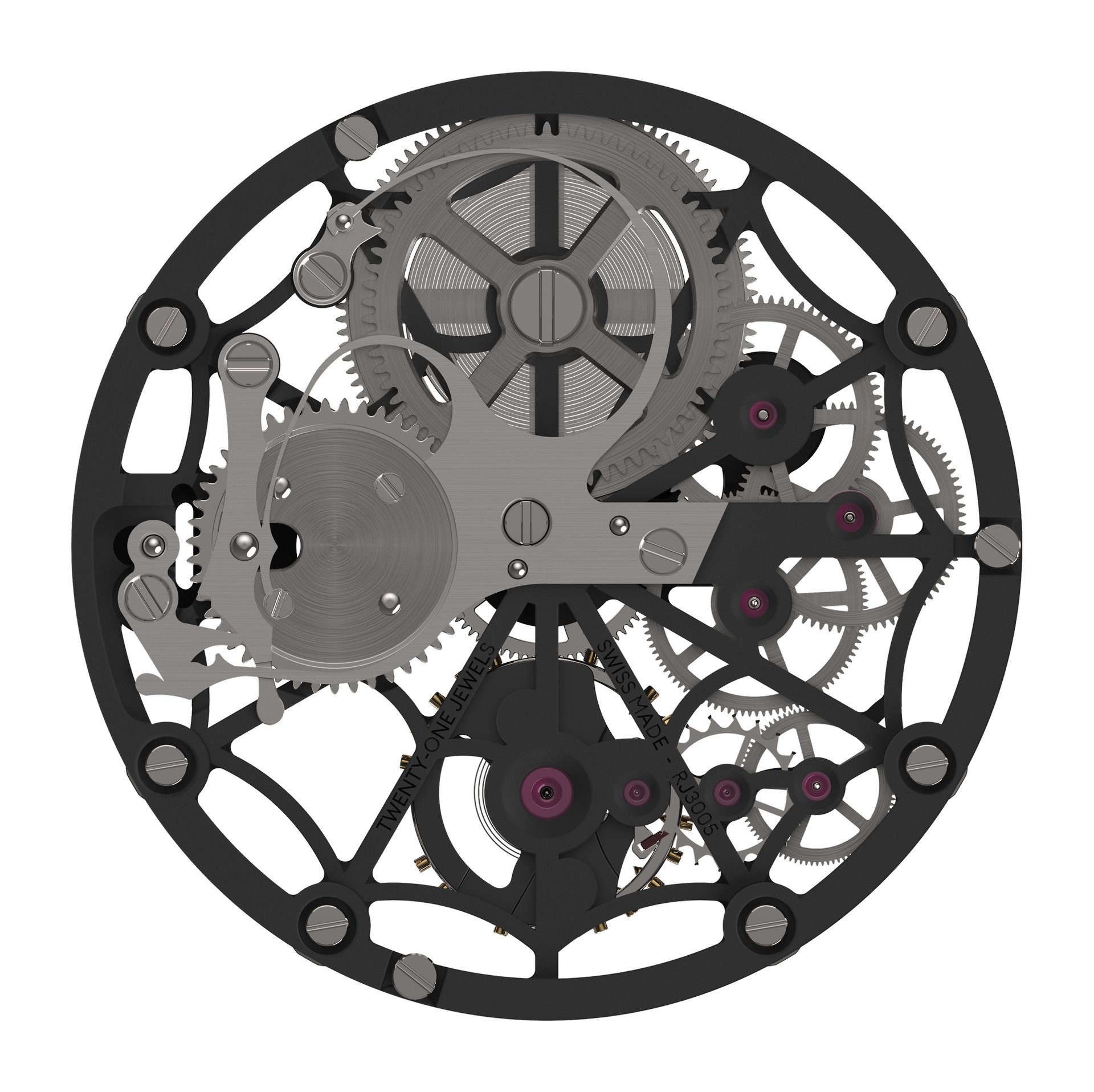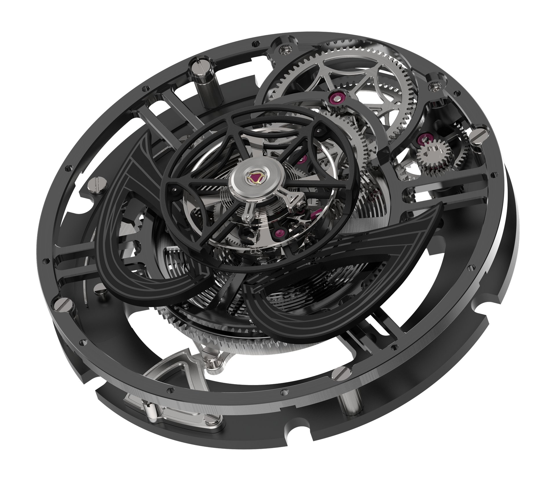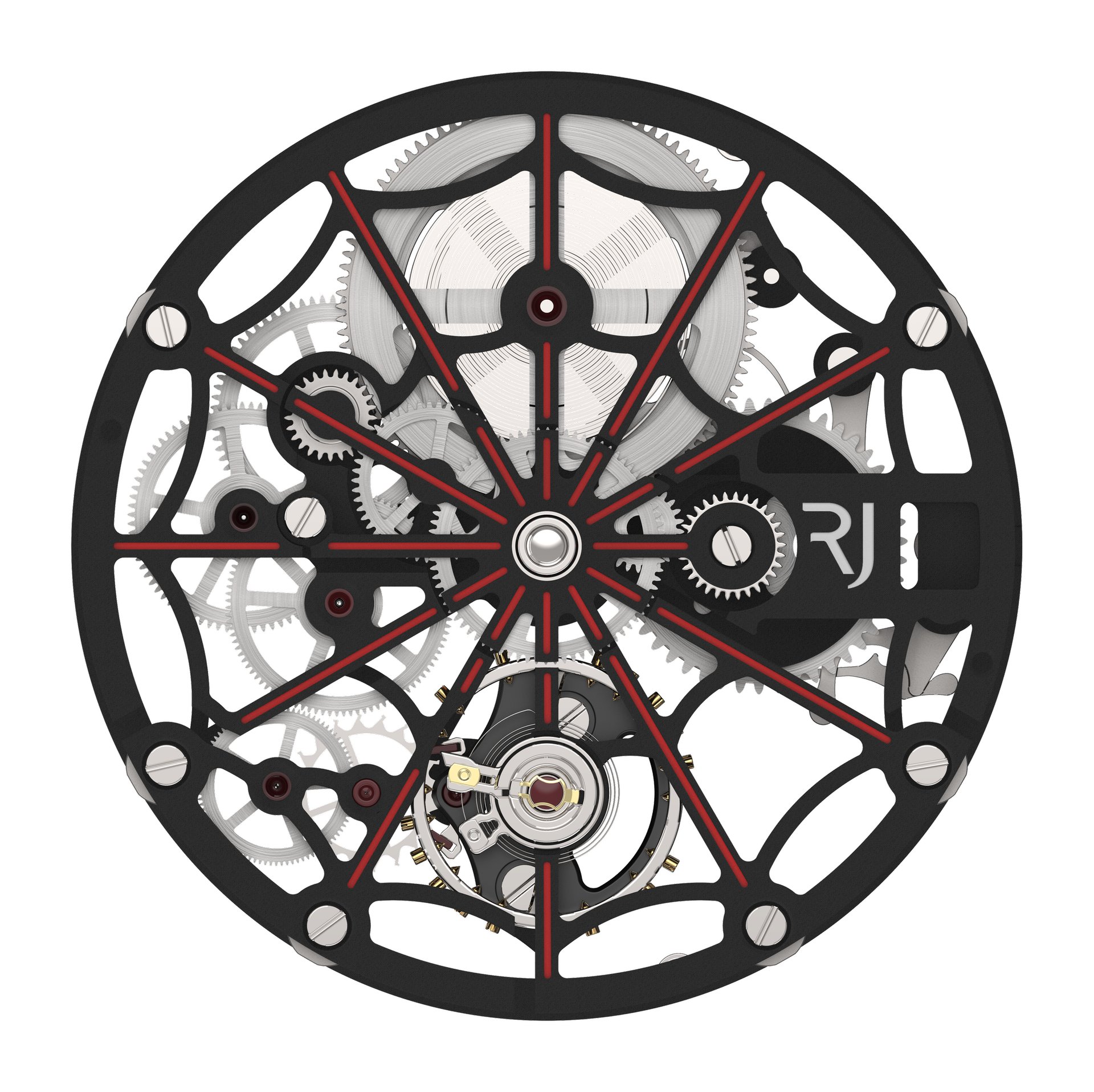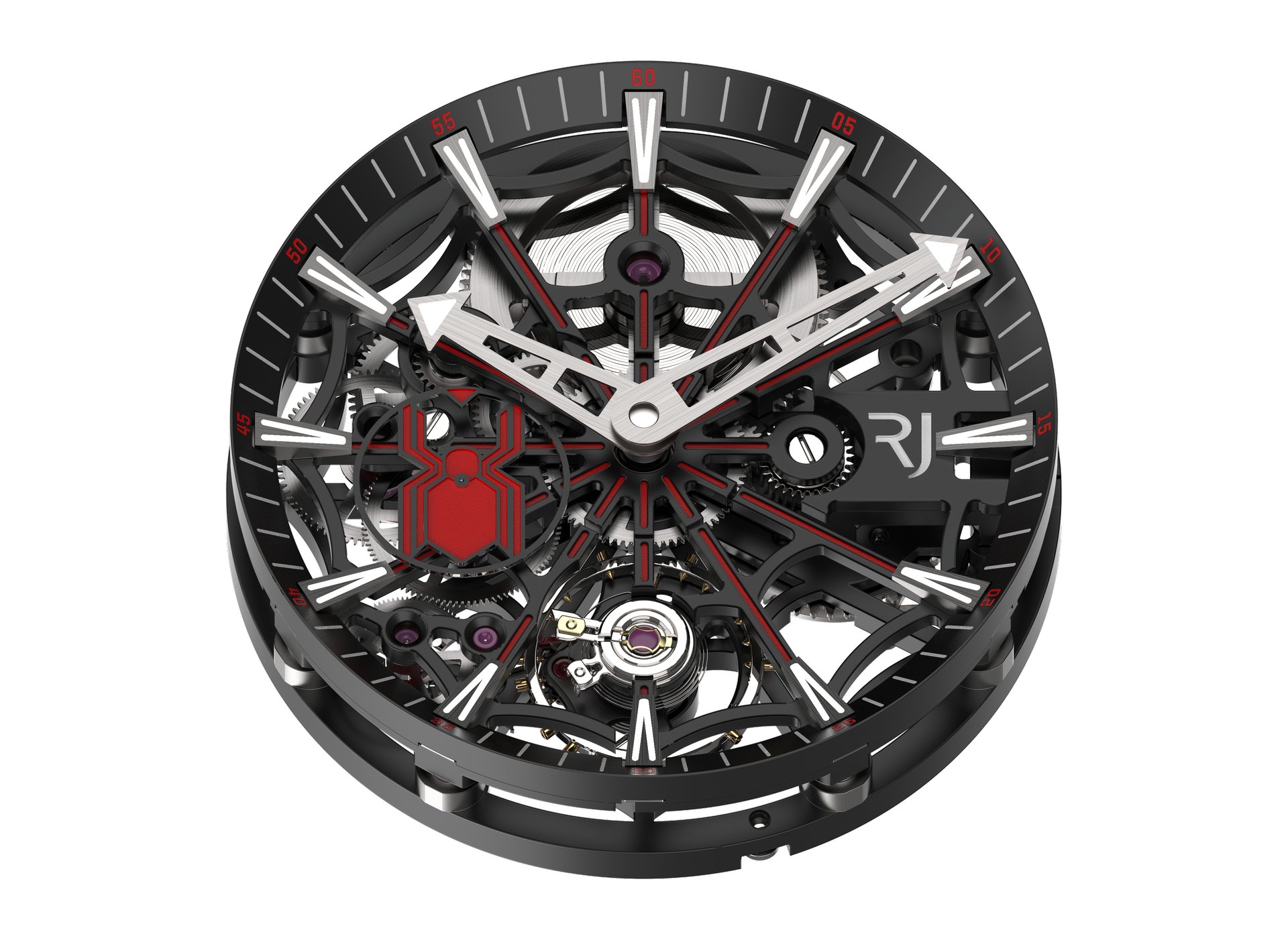 RJ’s first complication produced in-house, the ARRAW Spider-Man Tourbillon features a construction that is entirely coaxial, with a peripheral display of the hours and the minutes. This central tourbillon has been engineered by RJ Studio to increase the power reserve to 150 hours (more than six days).