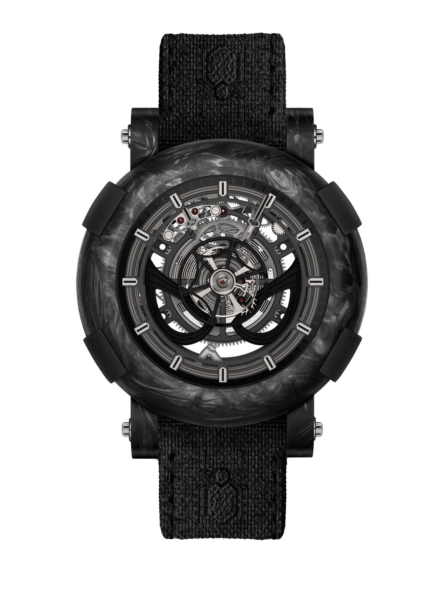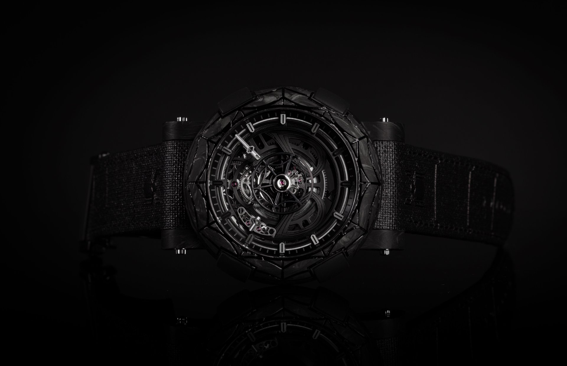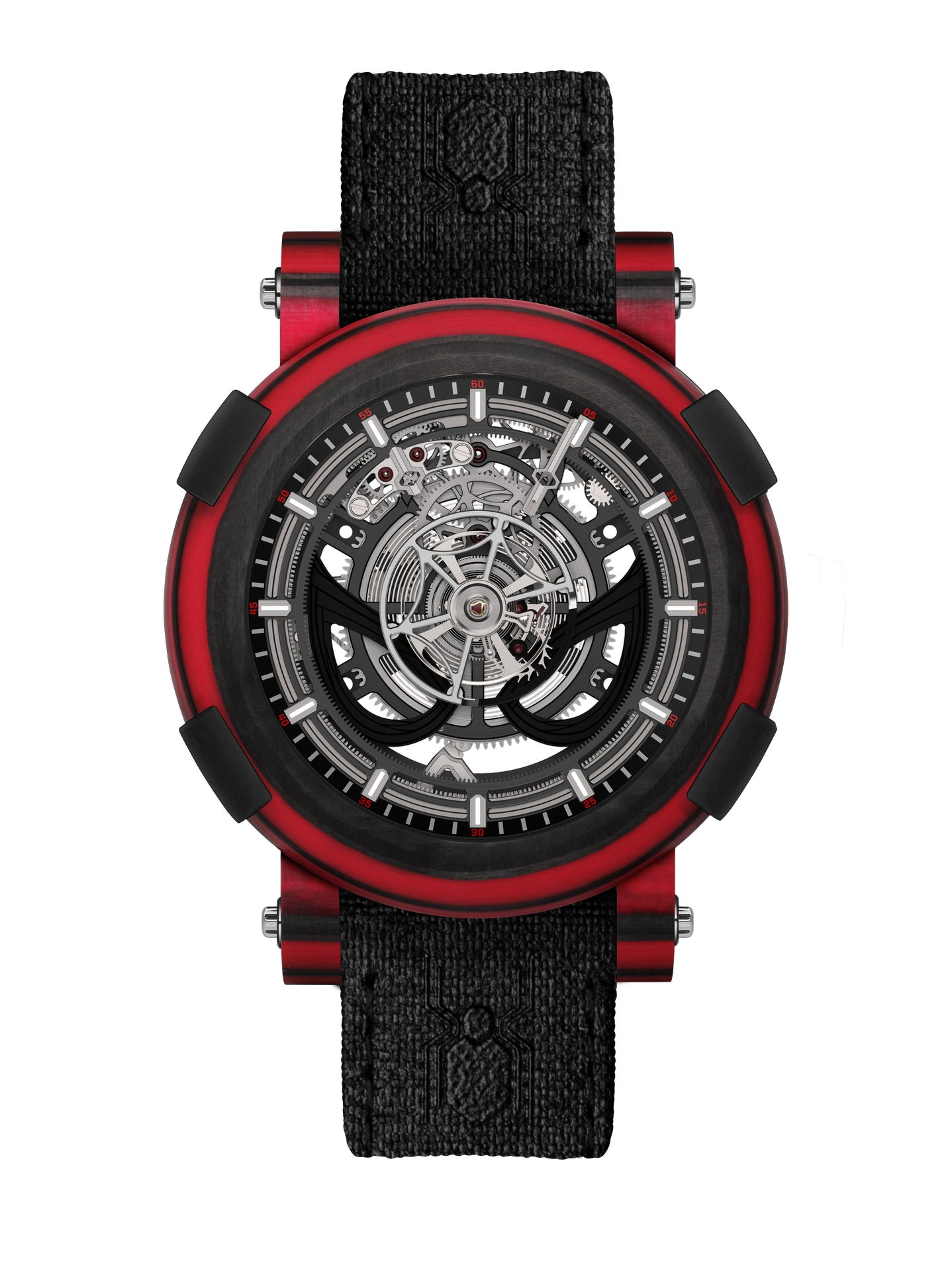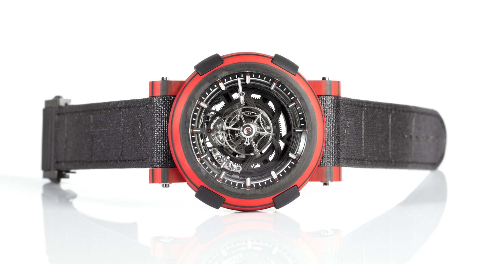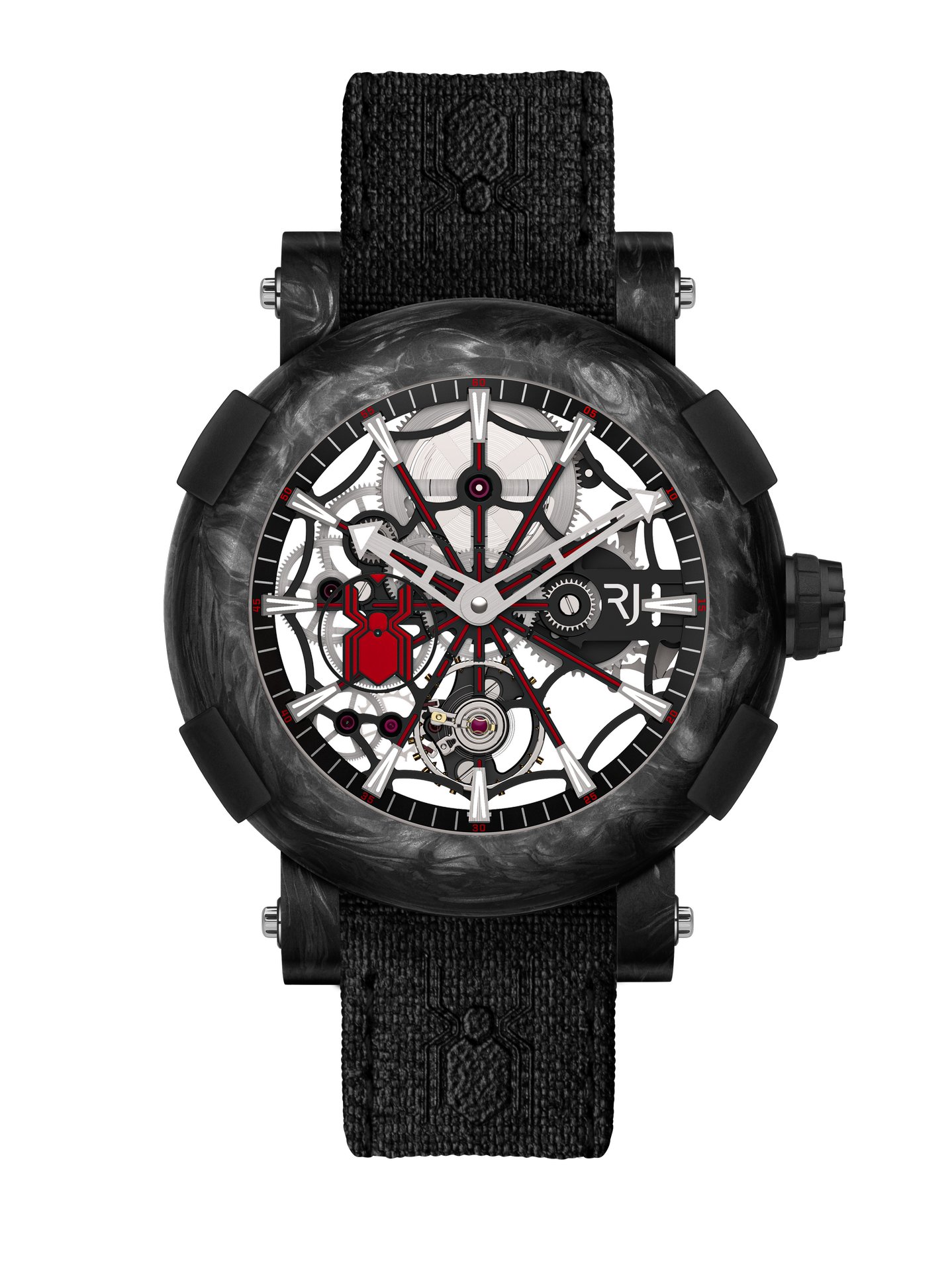 Made in a 45 mm case punctuated by RJ BUMPERS™ in rubber, the ARRAW Spider-Man tourbillon is available in two versions, the first in a black carbon and red fiberglass composite, and the second made entirely of black carbon. Each version is limited only to 10 pieces.