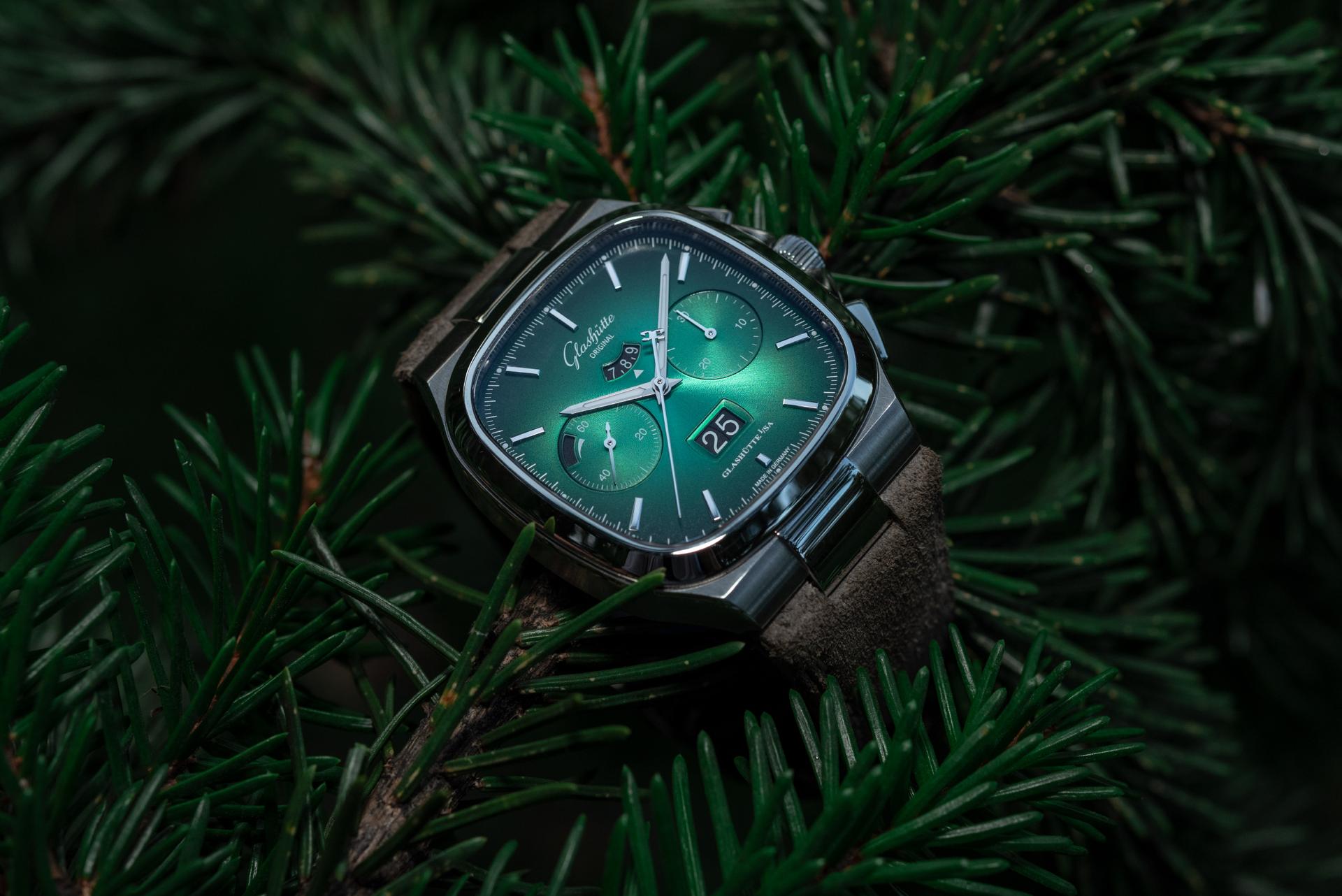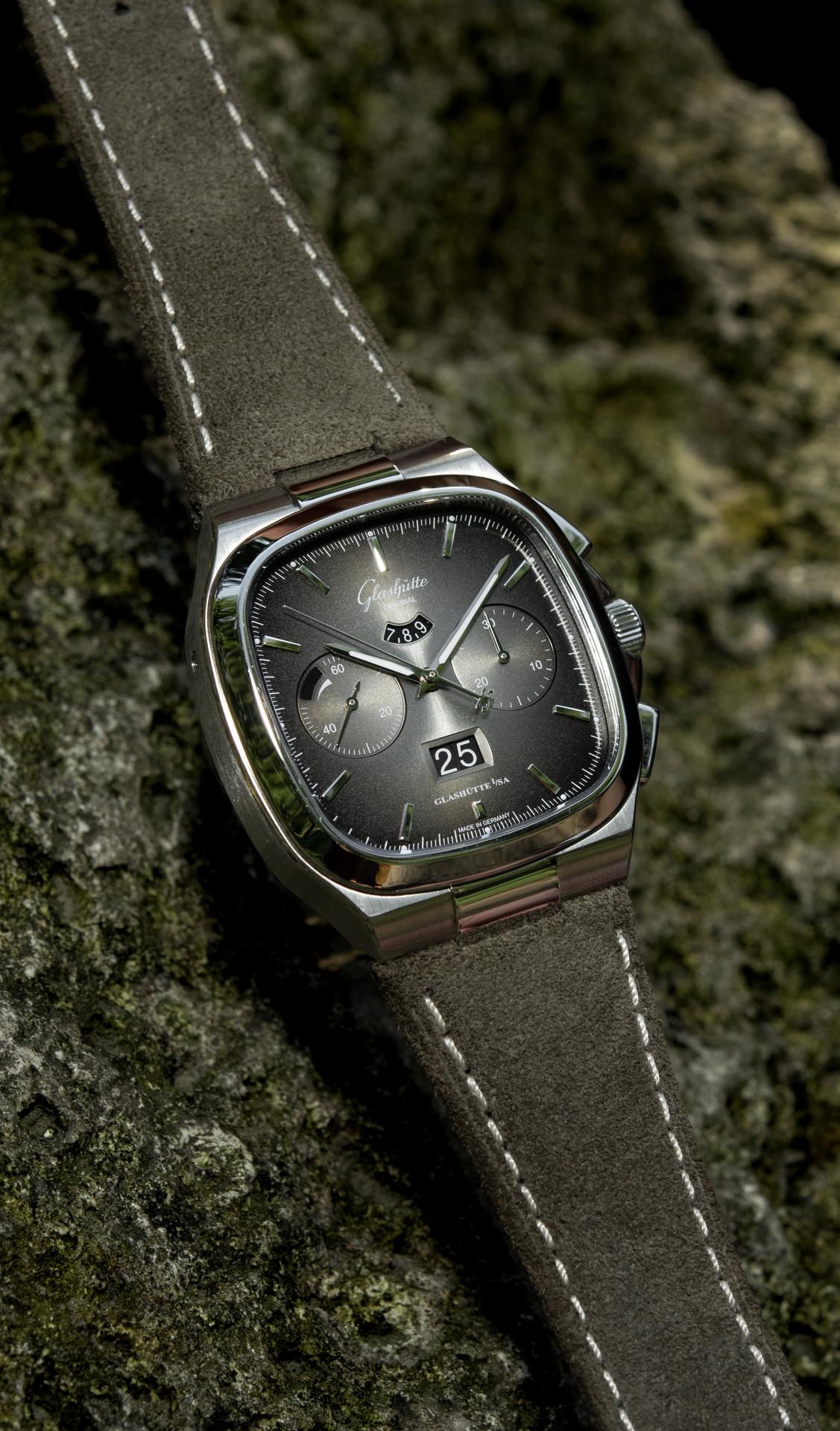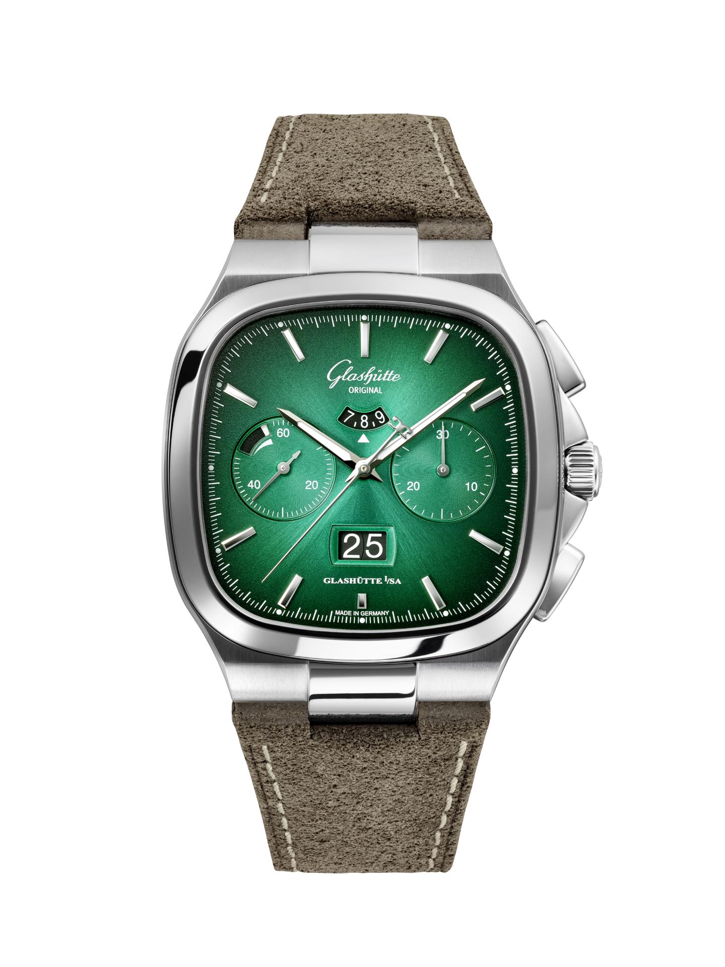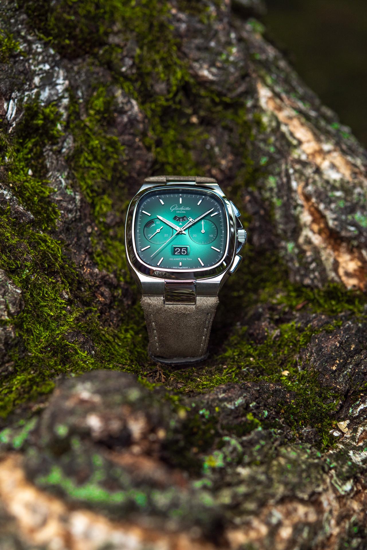 The Seventies Chronograph Panorama Date from Glashütte Original continues to enjoy an enthusiastic reception five years after it was first presented to friends of fine watches around the world. This should come as no surprise, as it combines the perfection of genuine manufactory production with the rich traditions of Glashütte watchmaking. And today the successful chronograph presents another facet, in two limited editions of 100 pieces each: equipped with fascinating dials in green and grey, the new versions pay special tribute to the landscape that has inspired the work of Glashütte’s watchmakers for over 170 years.