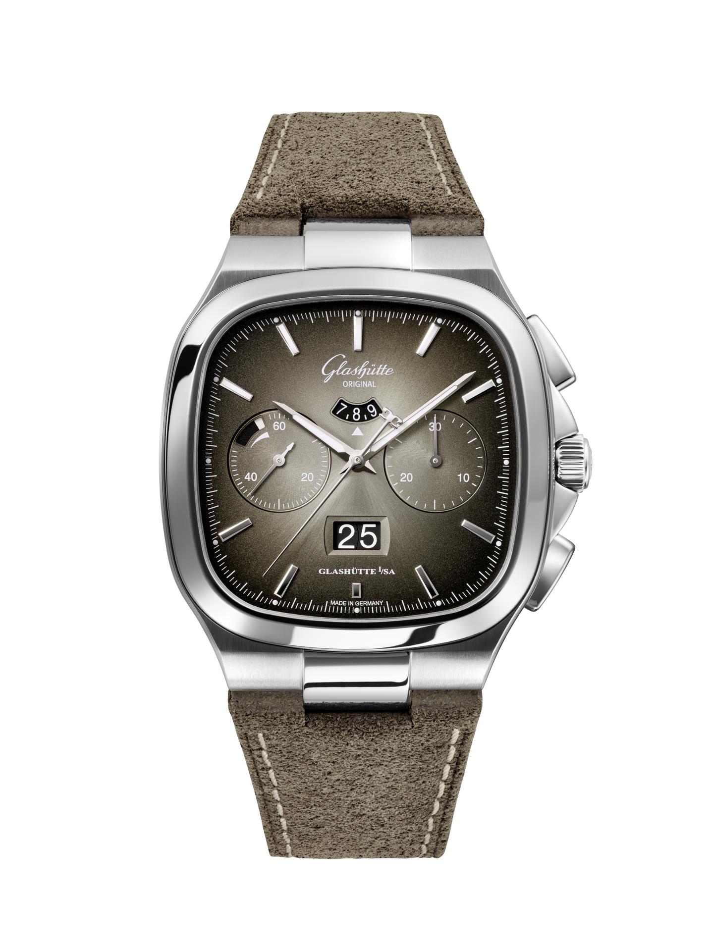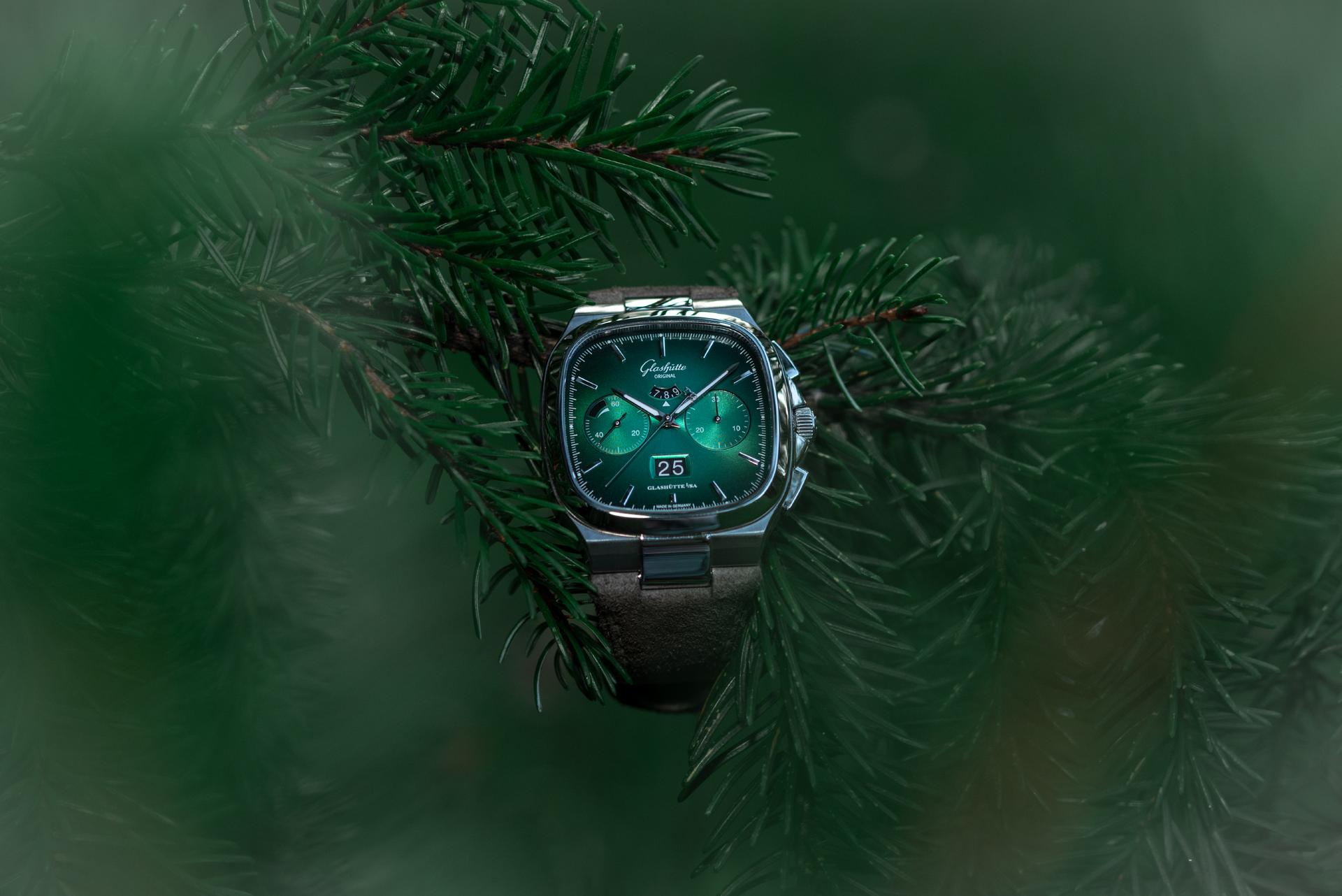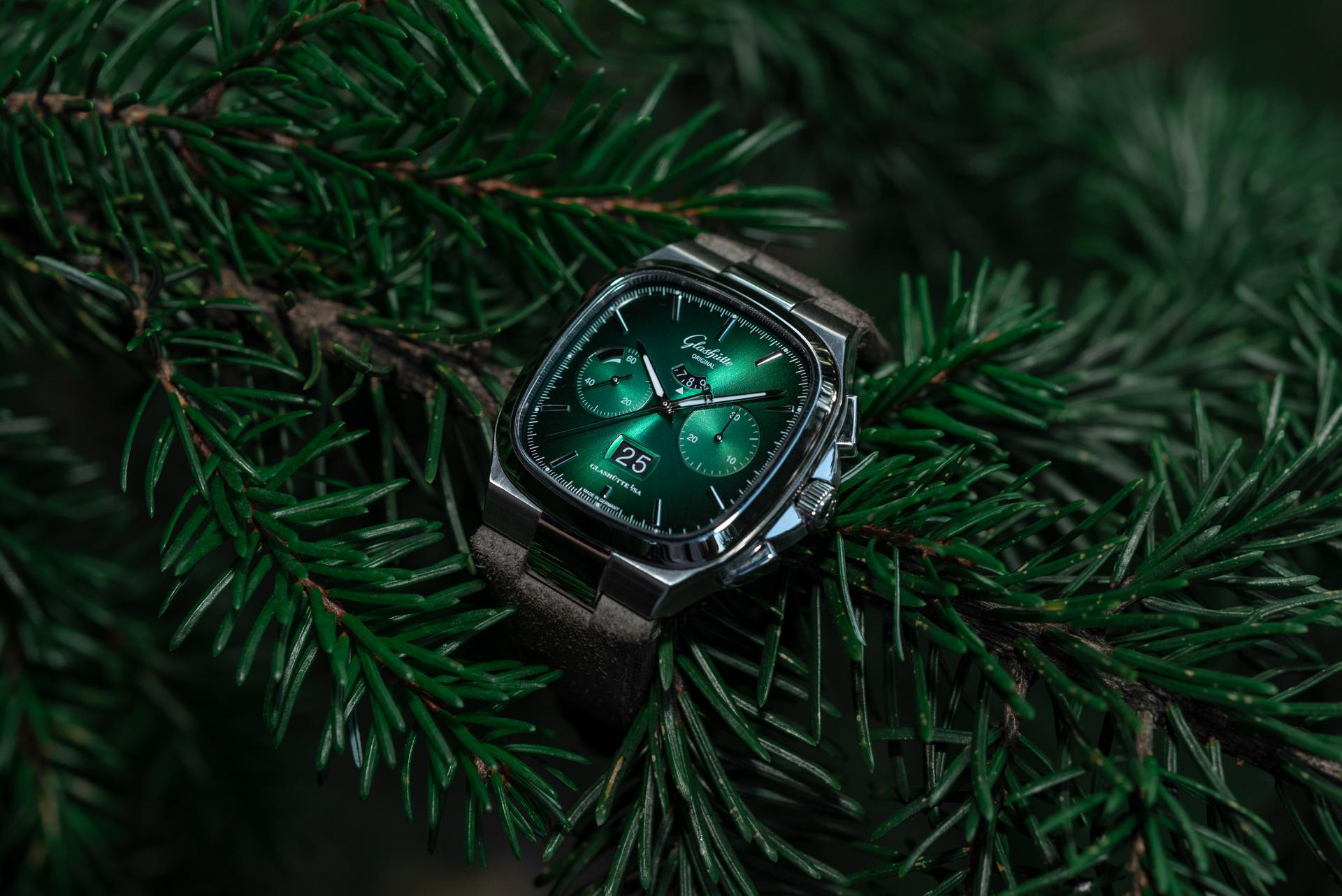 The Seventies Chronograph Panorama Date from Glashütte Original continues to enjoy an enthusiastic reception five years after it was first presented to friends of fine watches around the world. This should come as no surprise, as it combines the perfection of genuine manufactory production with the rich traditions of Glashütte watchmaking. And today the successful chronograph presents another facet, in two limited editions of 100 pieces each: equipped with fascinating dials in green and grey, the new versions pay special tribute to the landscape that has inspired the work of Glashütte’s watchmakers for over 170 years.