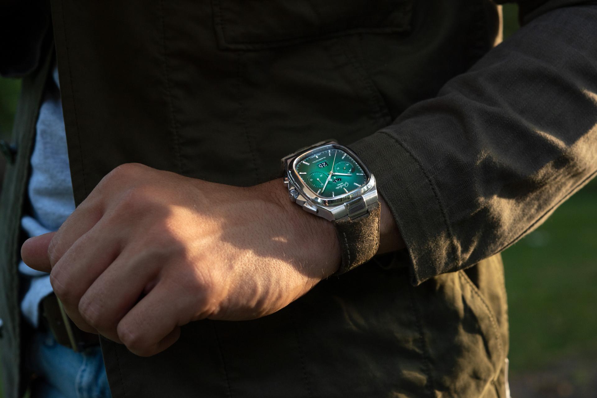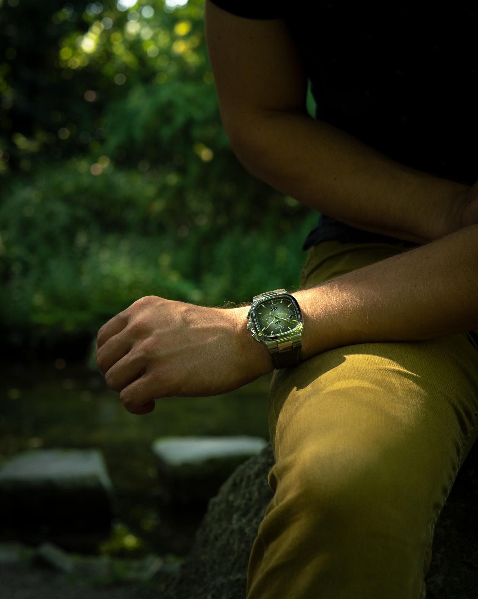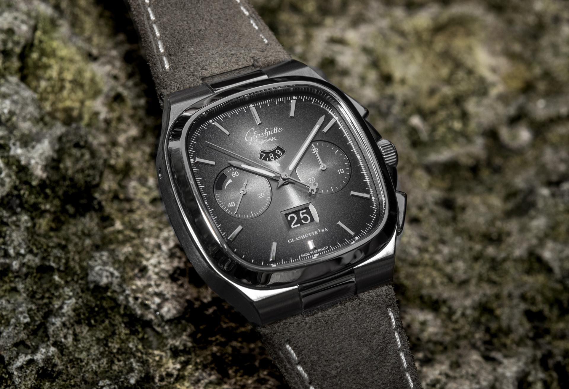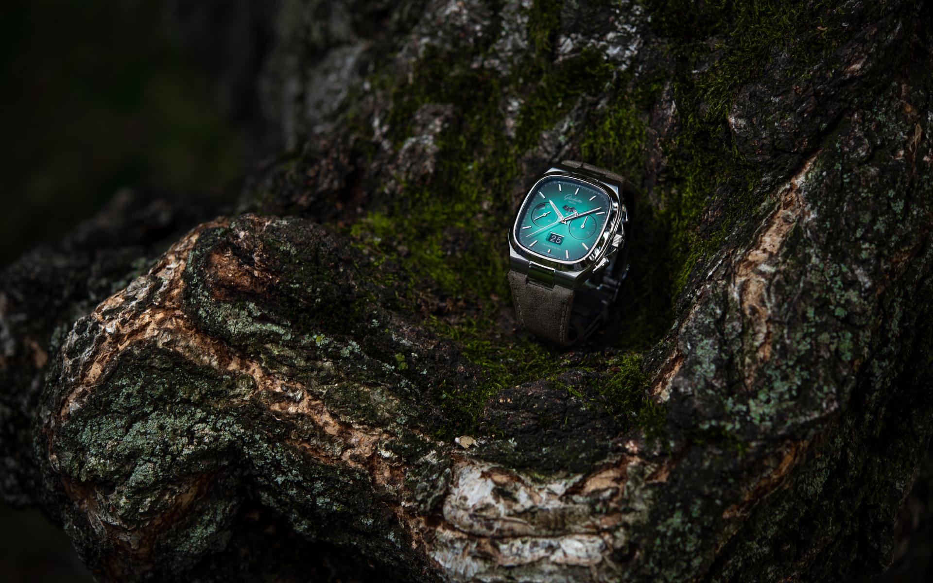The Seventies Chronograph Panorama Date from Glashütte Original continues to enjoy an enthusiastic reception five years after it was first presented to friends of fine watches around the world. This should come as no surprise, as it combines the perfection of genuine manufactory production with the rich traditions of Glashütte watchmaking. And today the successful chronograph presents another facet, in two limited editions of 100 pieces each: equipped with fascinating dials in green and grey, the new versions pay special tribute to the landscape that has inspired the work of Glashütte’s watchmakers for over 170 years.
