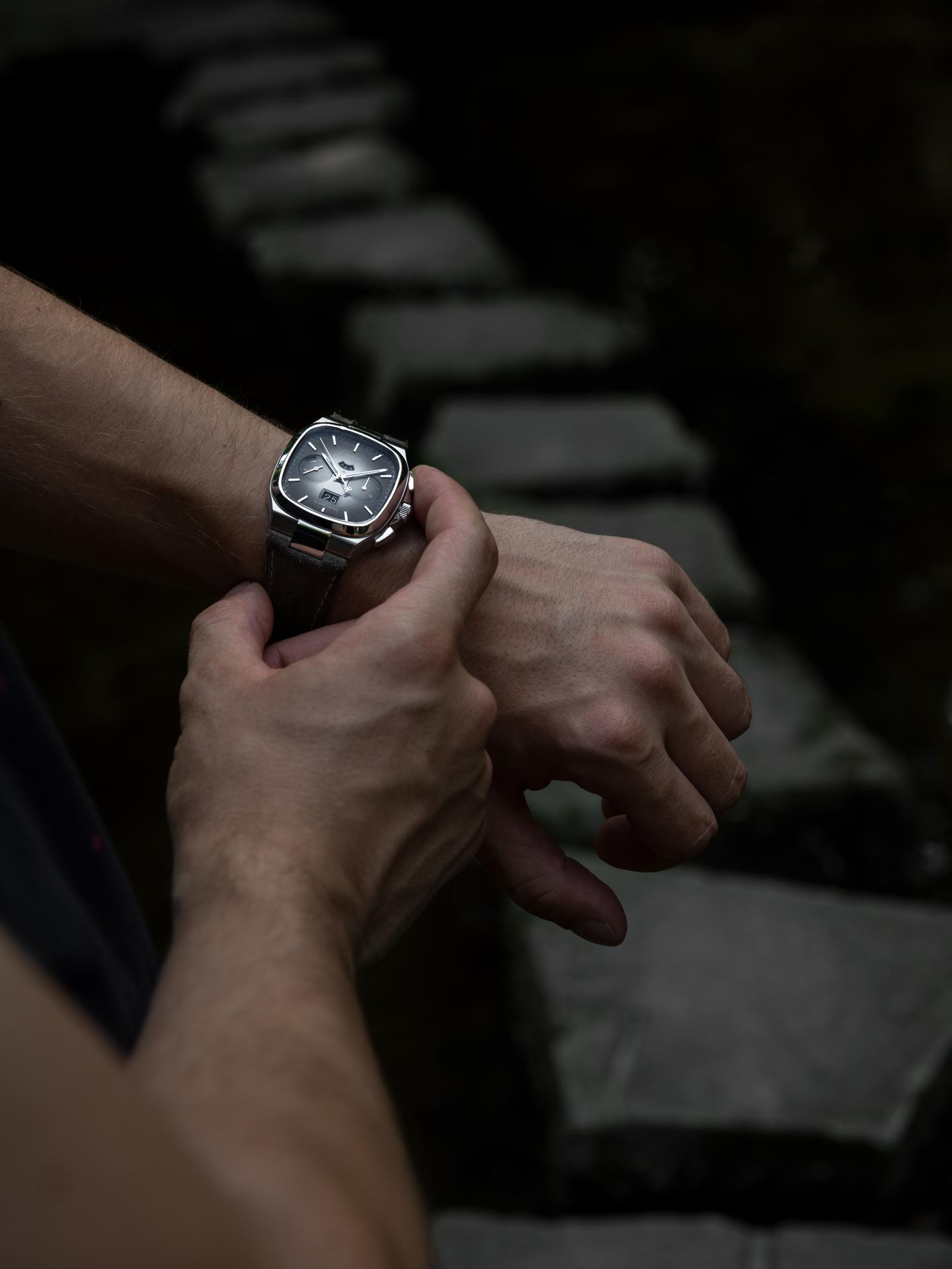 The Seventies Chronograph Panorama Date – Limited Edition features a new, grey-brown calf nubuck leather strap that takes up the shaded colourings of the dial in an elegant fashion, rounding off both models‘ natural play of colours.
