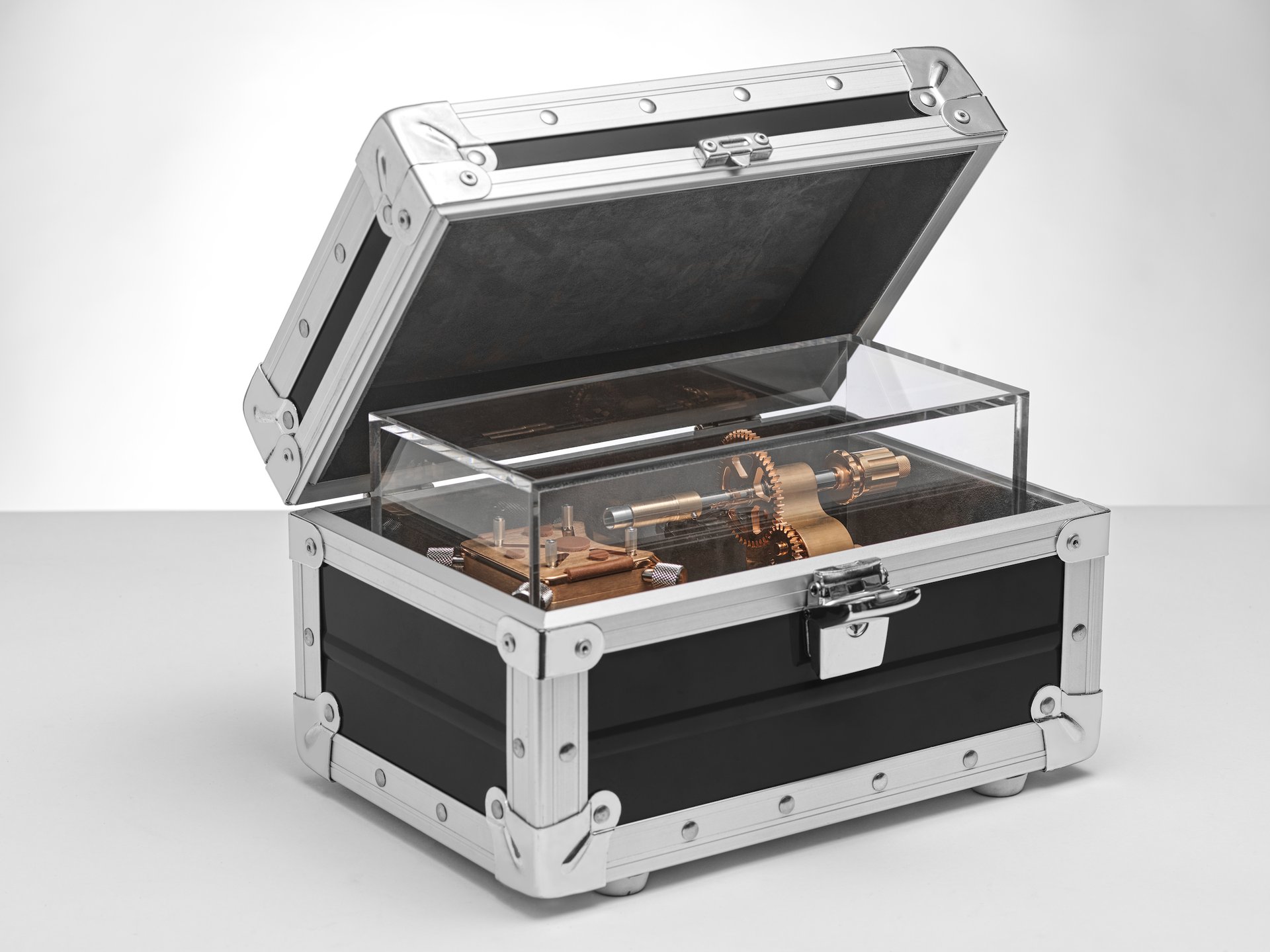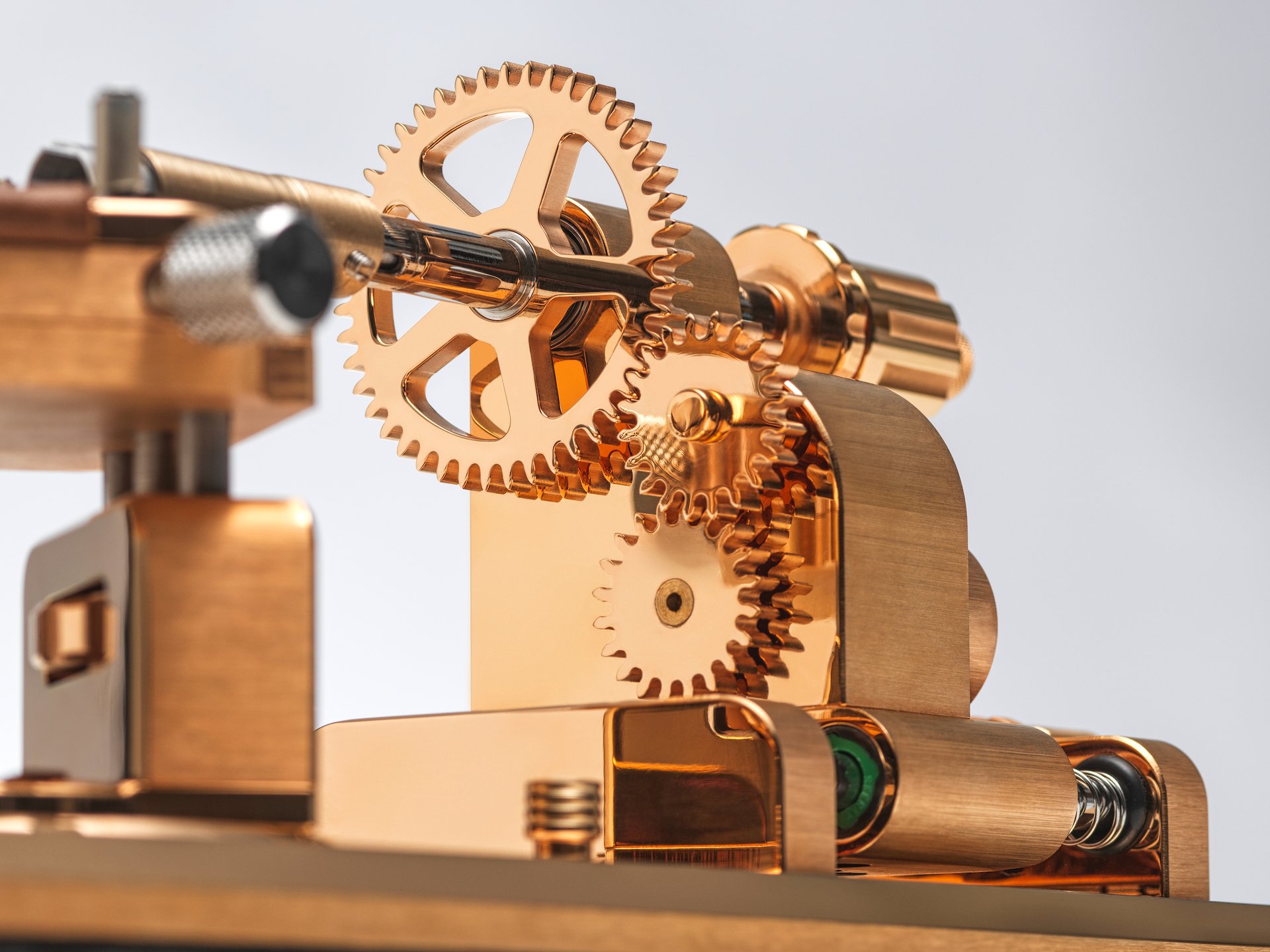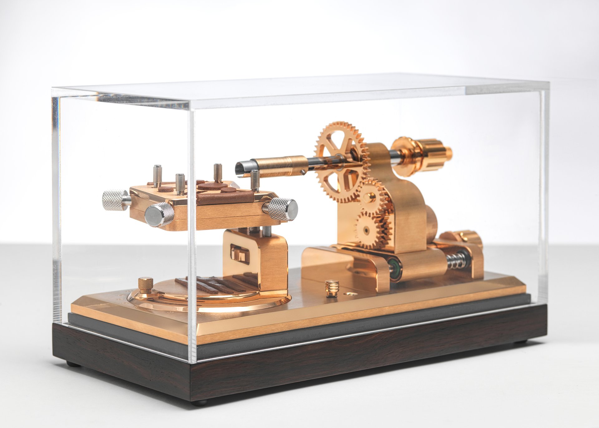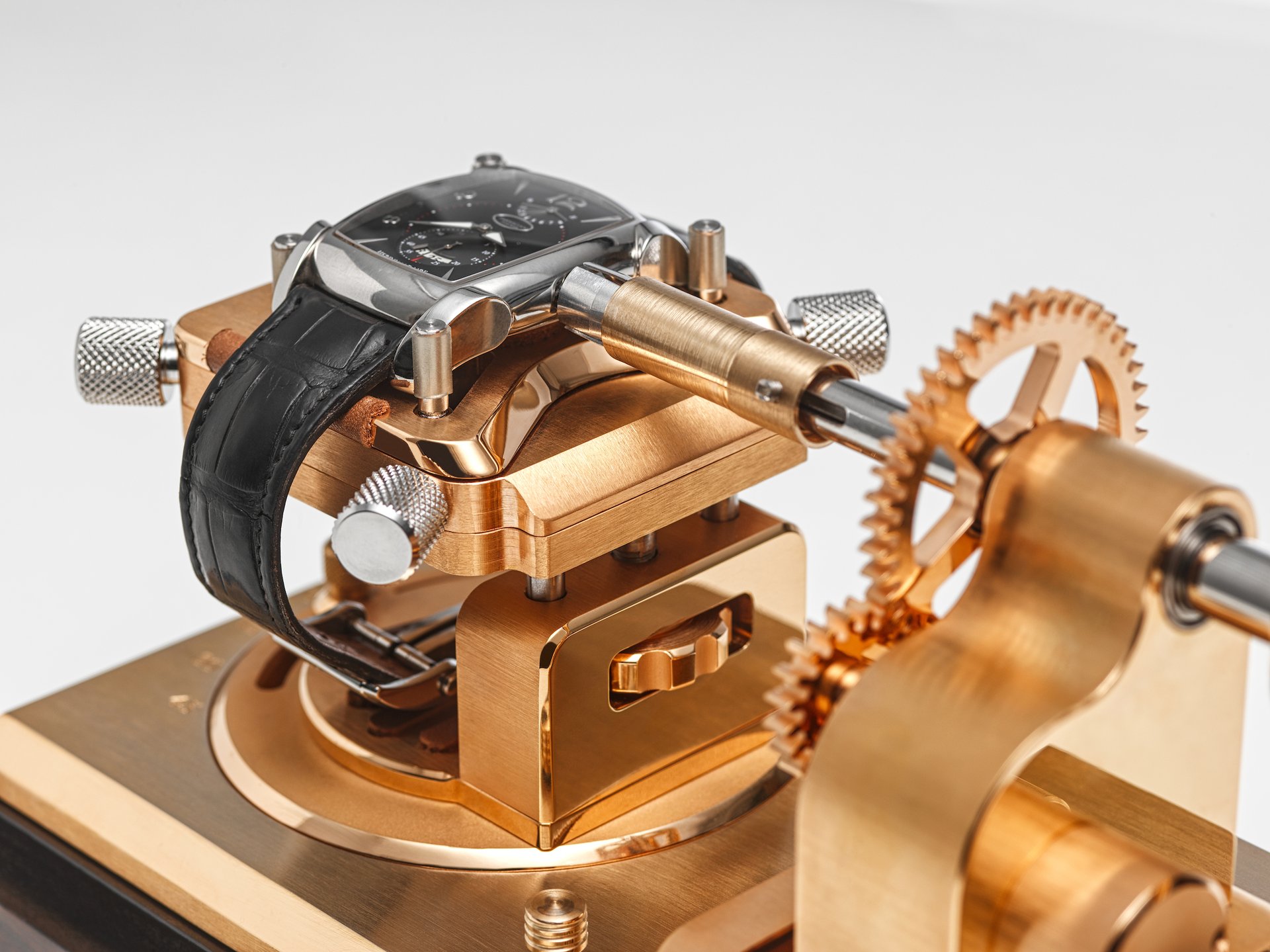 A system of cogs, powered by an extremely quiet and very low-consumption electric motor, drives a clamp fixed on the watch crown. The rotation of this crown winds the barrel spring until it is at full capacity. Once winding is complete, and when the spring is fully tensioned, an electronic command from the motor interrupts the process. Thanks to its rechargeable lithium-ion battery, the device guarantees an operating autonomy of 6 months.