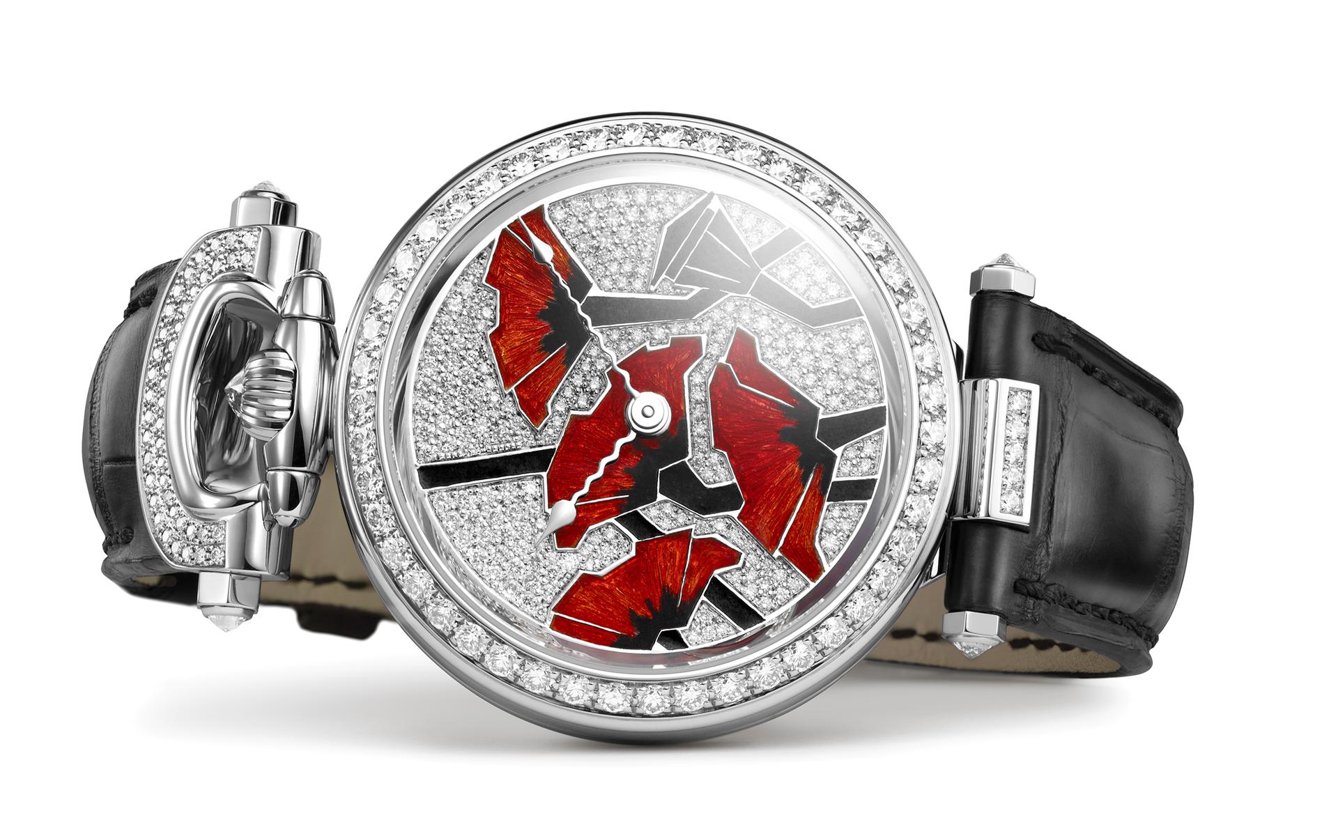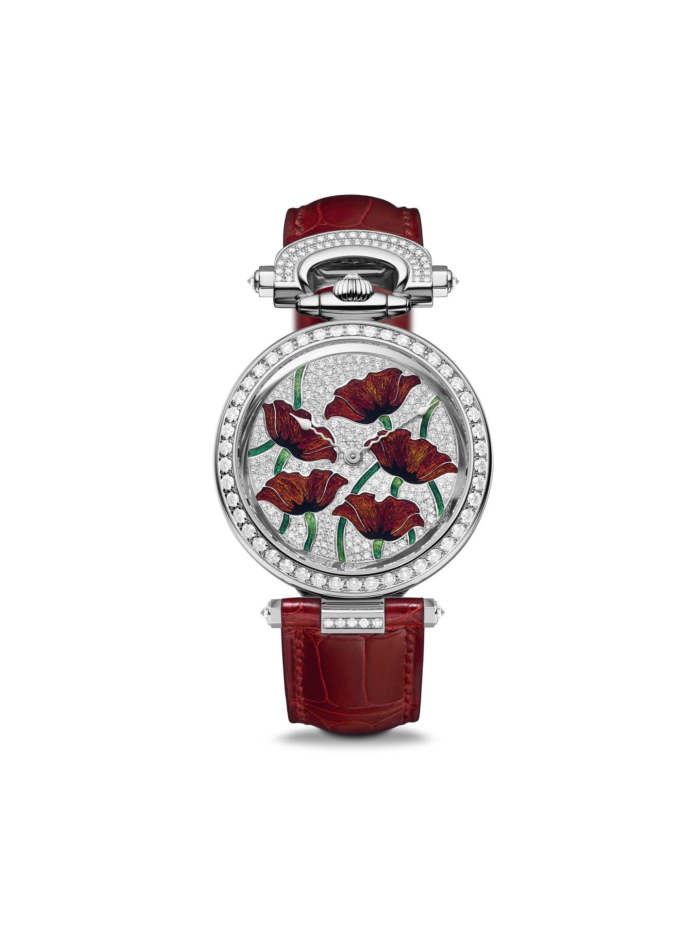 The poppies in this unique composition form a bouquet illuminated by no fewer than 138 diamonds that offer them enchanting reflections and contrasts. This exceptional work is housed in the 39-mm-diameter Fleurier Amadeo case. It took the Maison BOVET seven years to develop this ingenious patented system that allows anyone — in simple steps, without any tools — to convert their timepiece into a table clock or, respectively, a pocket watch for the gentlemen’s designs and a pendant for the women’s models.