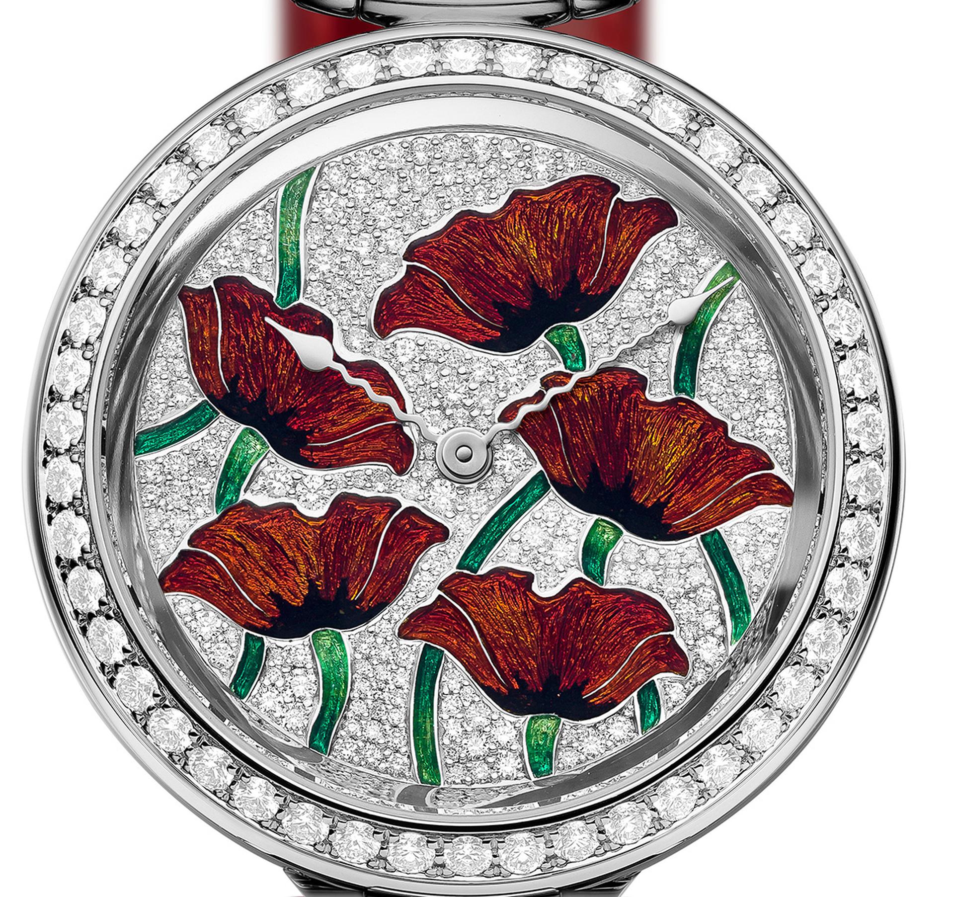 - Grand Feu Enamel, motif “poppies”, set with diamonds