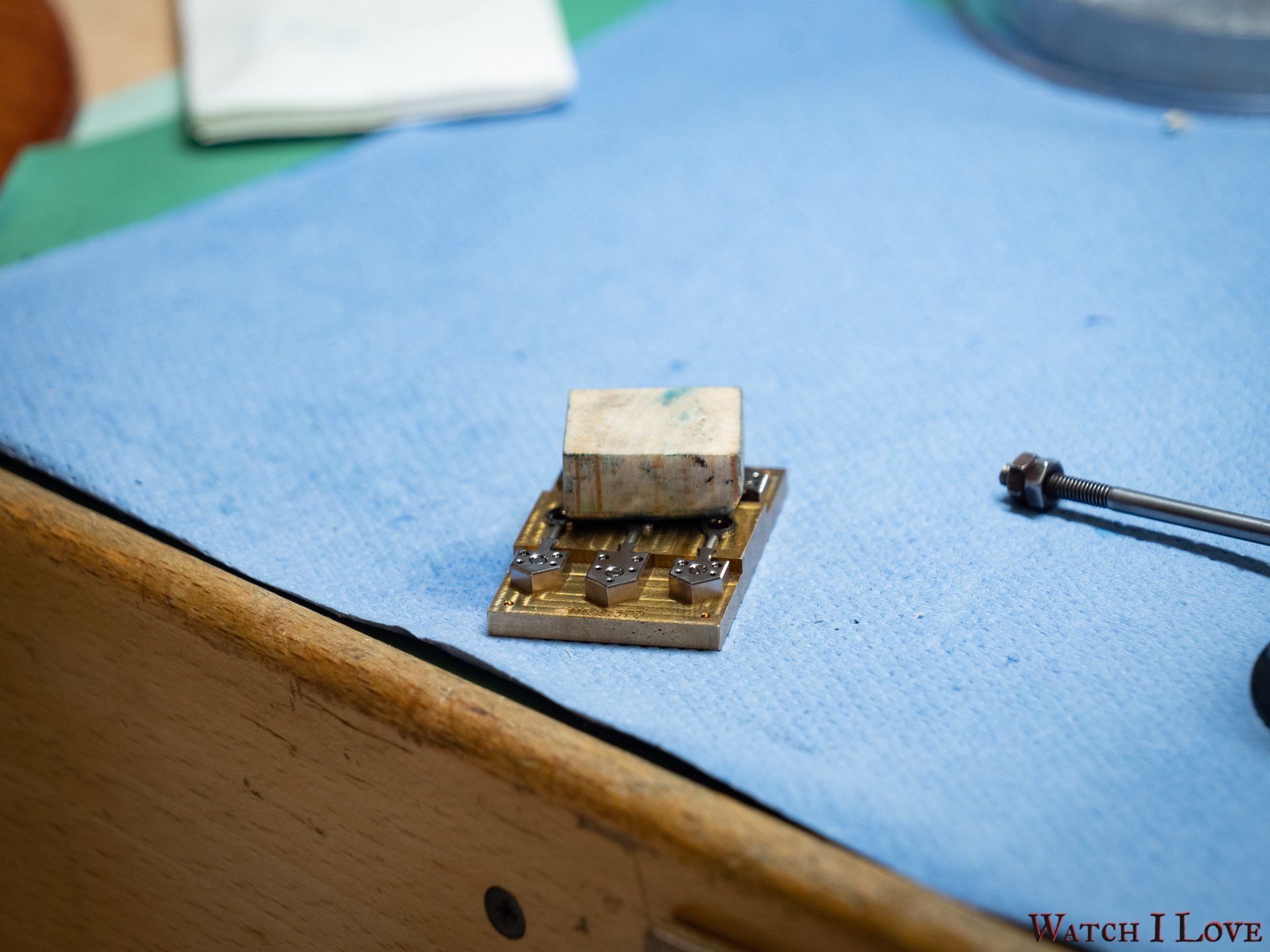 Girard-Perregaux has dedicated technicians and toolmakers to create and maintain the objects and tools that the finishes watchmakers need. Some of the tools are created particularly for a special operation (for instance, the hand-held holder of the bridge polished above and the Girard-Perregaux bridges support). In the premises, some fo the watchmakers use microscopes, some loupes. The final control is alway made under the microscope.