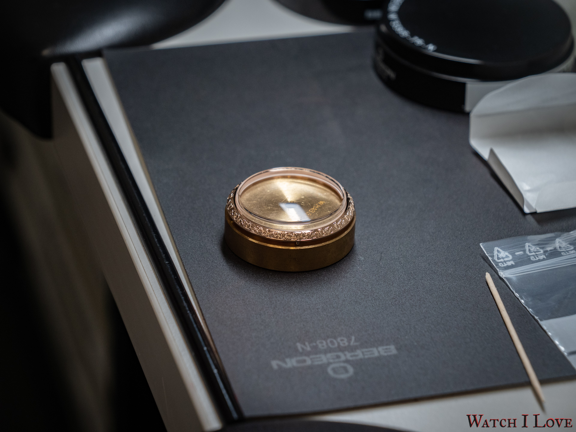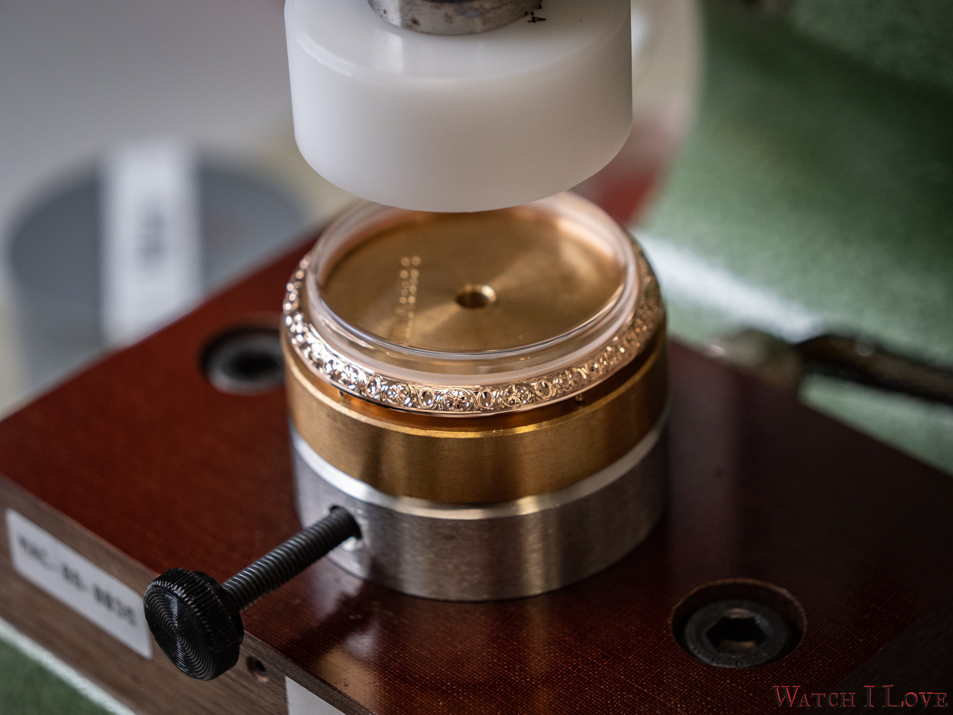 The same room has a dedicated working station for assembly special cases. For instance, this gorgeous case of a hand-engraved watch.