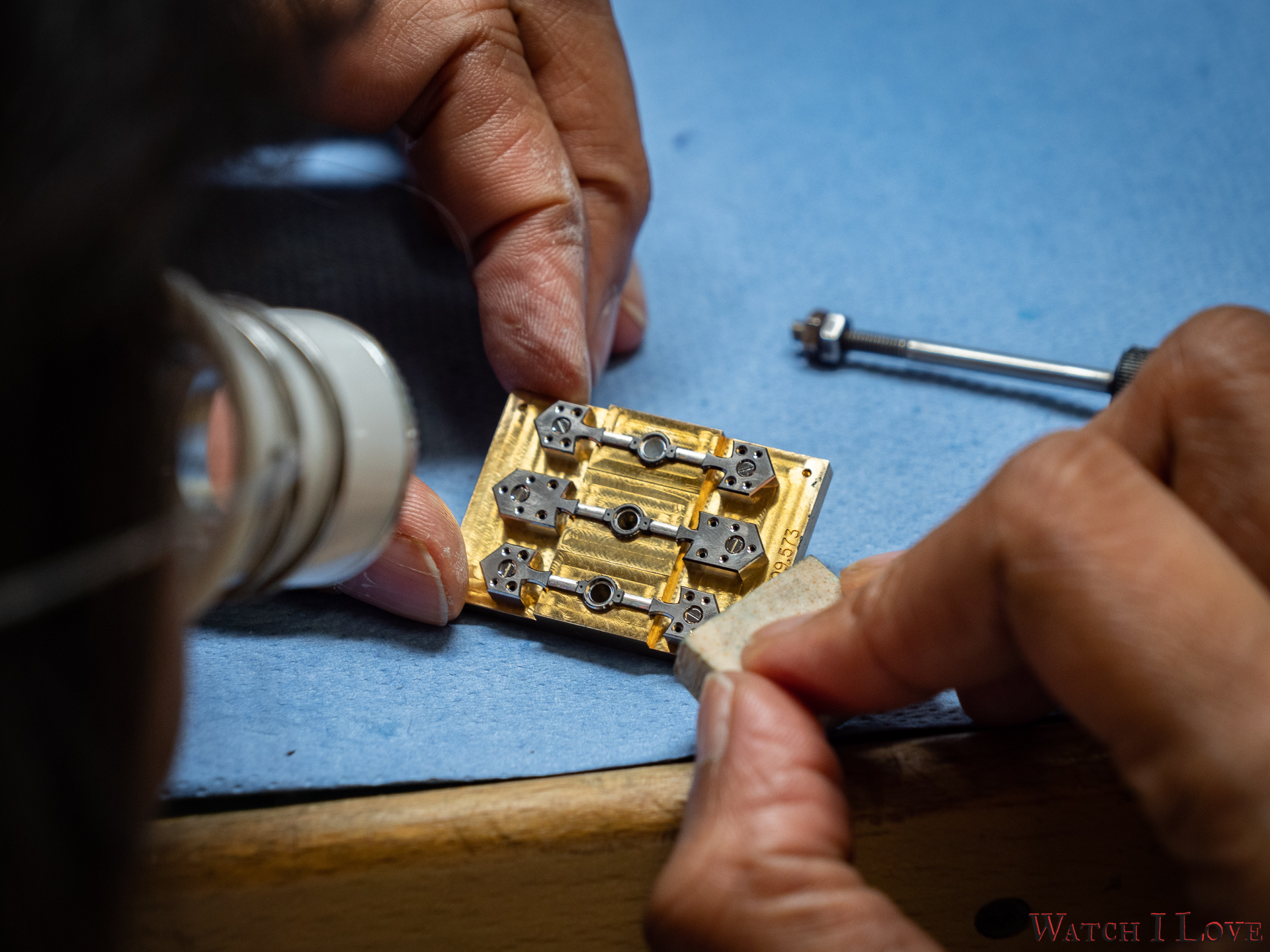 Gildas explained how complex the finishing process is. The Haute-Horlogerie rigours require that any surfaces to be decorated (any surface that has been machined/CNC-ed must be hand decorated).