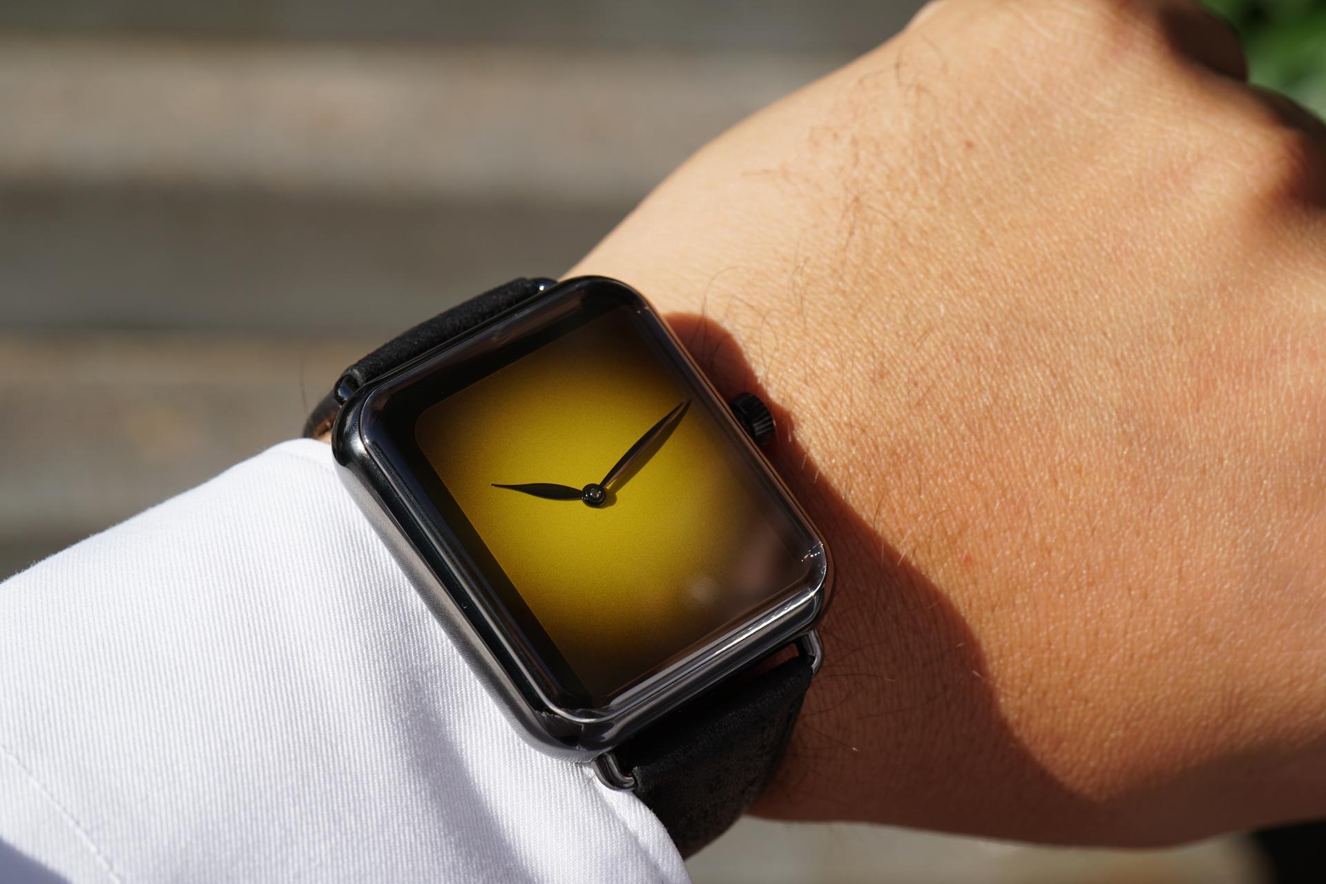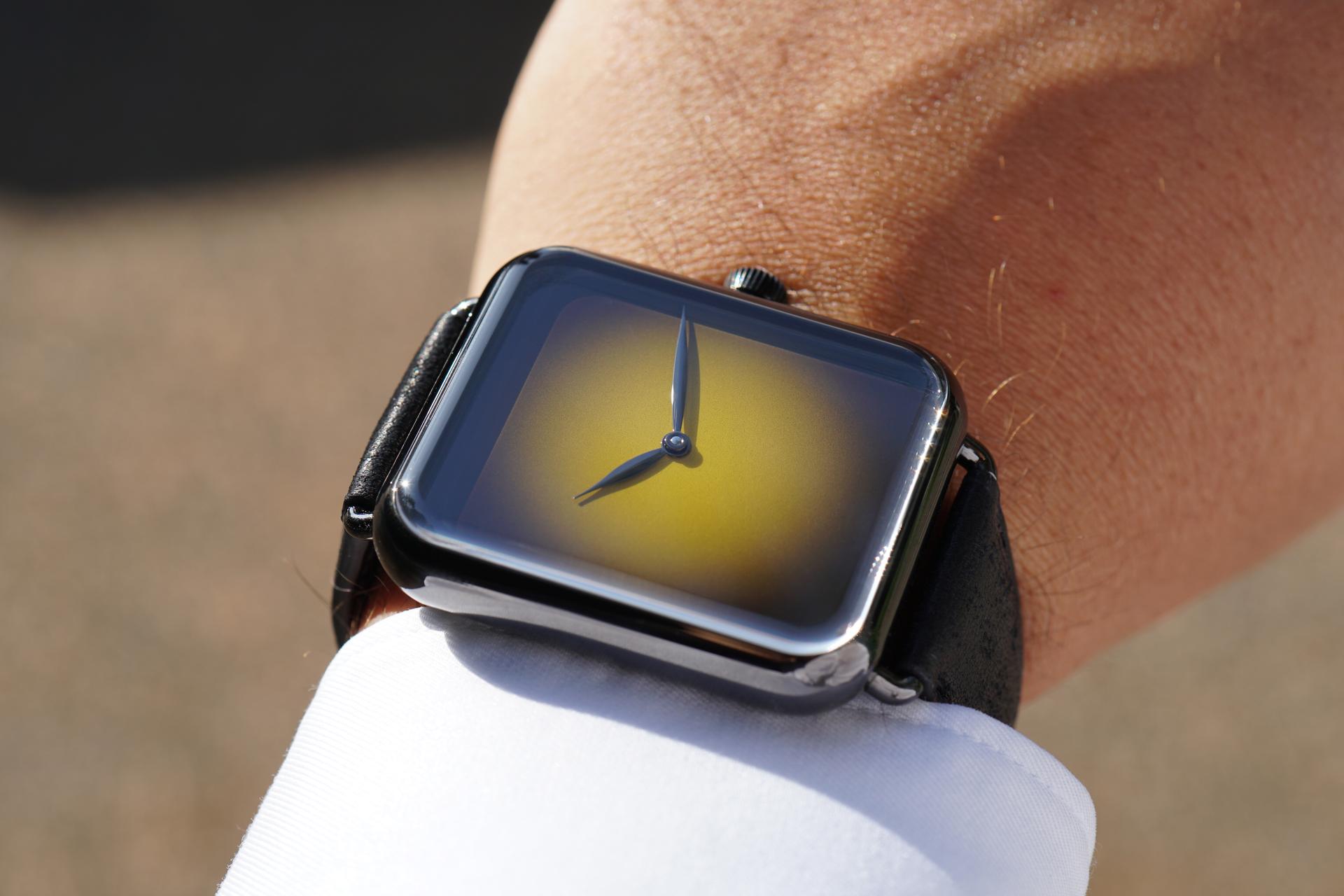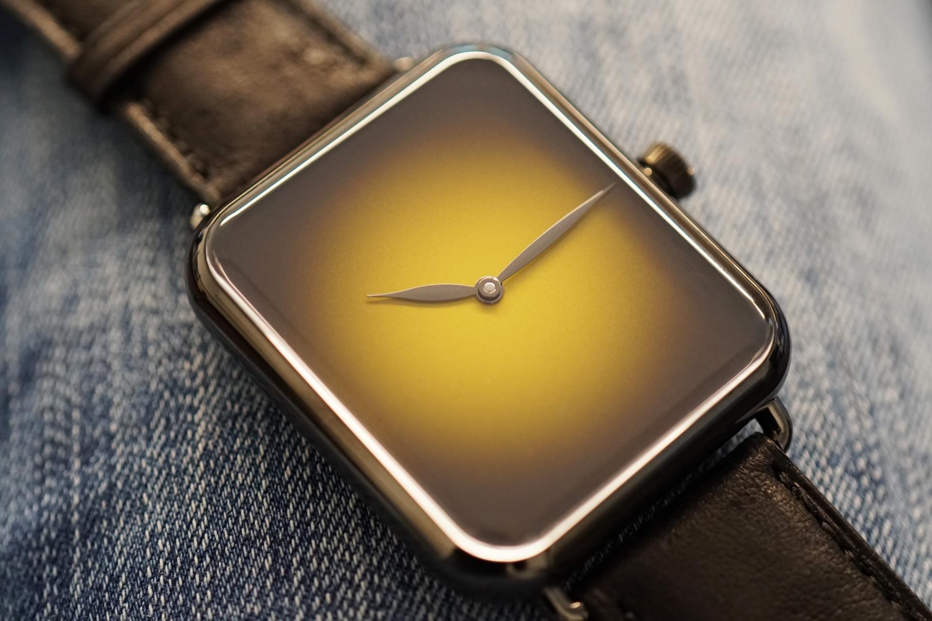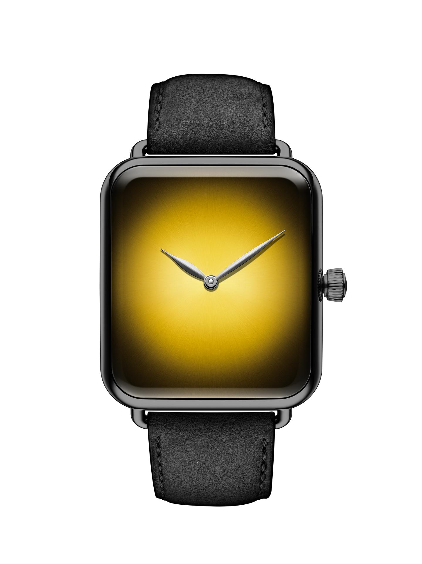 Classic but sensual: the Swiss Alp Watch Concept Dubai Limited Edition fits perfectly with this philosophy. Its rectangular case with soft, rounded corners is made from steel coated with a black DLC treatment, topped by a crystal with curved edges, for a resolutely contemporary look. With its brand new shade of radiant yellow, the pared-down dial is utterly striking. A black kudu leather strap adds to this creation, which is driven by the hand-wound HMC 324 form movement and released in a limited edition of 10 pieces.