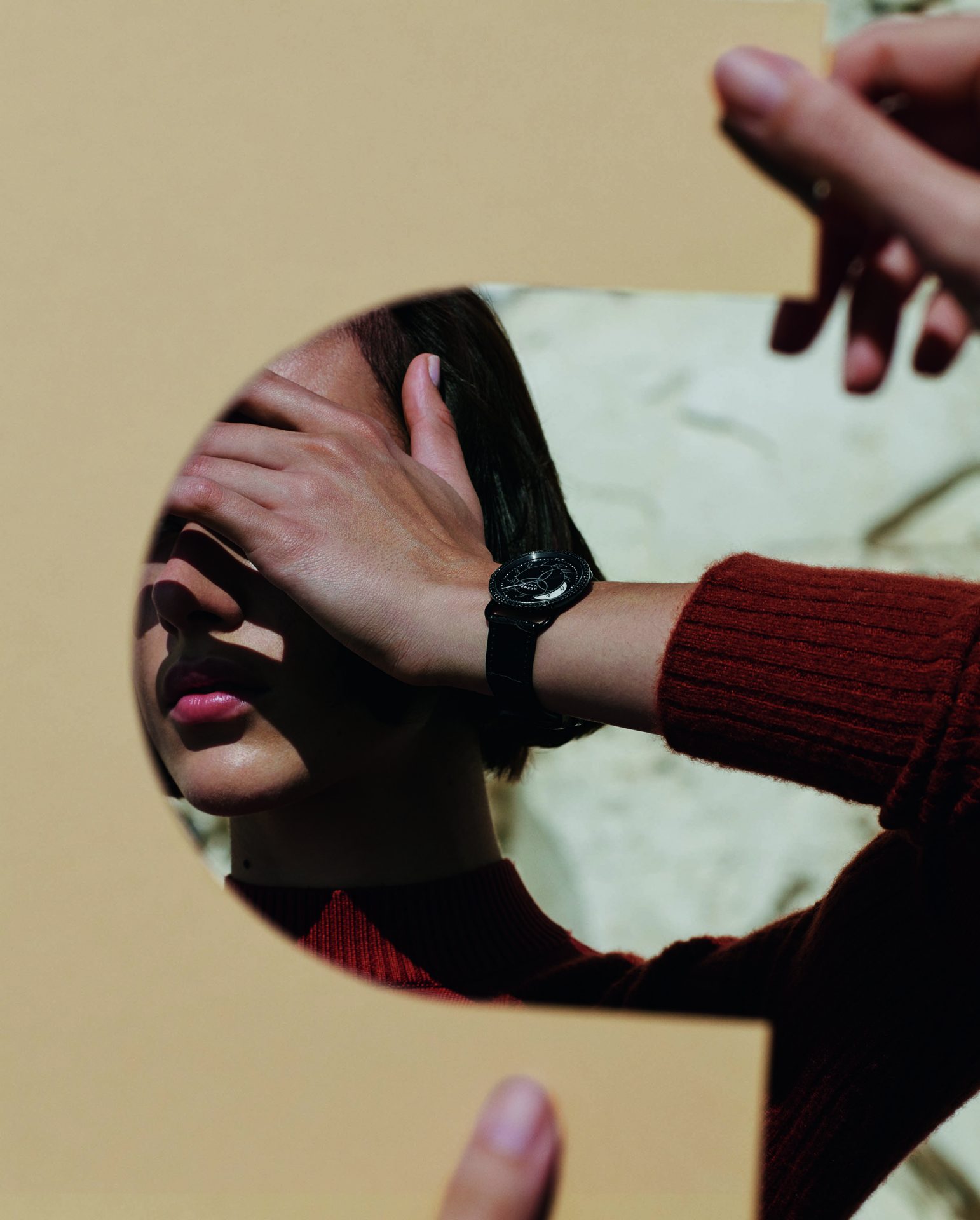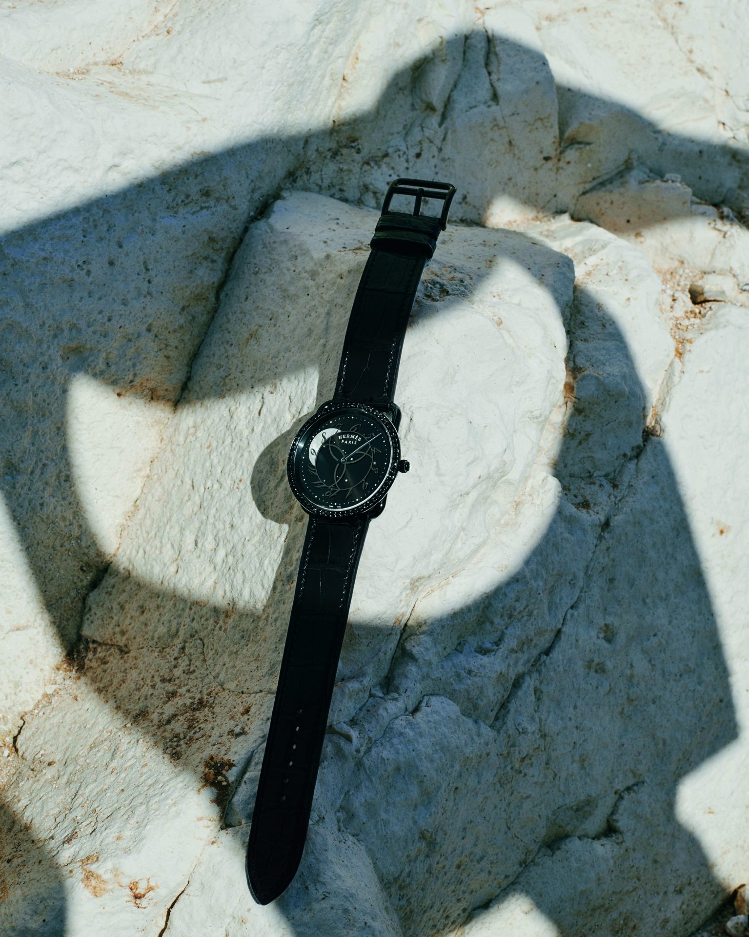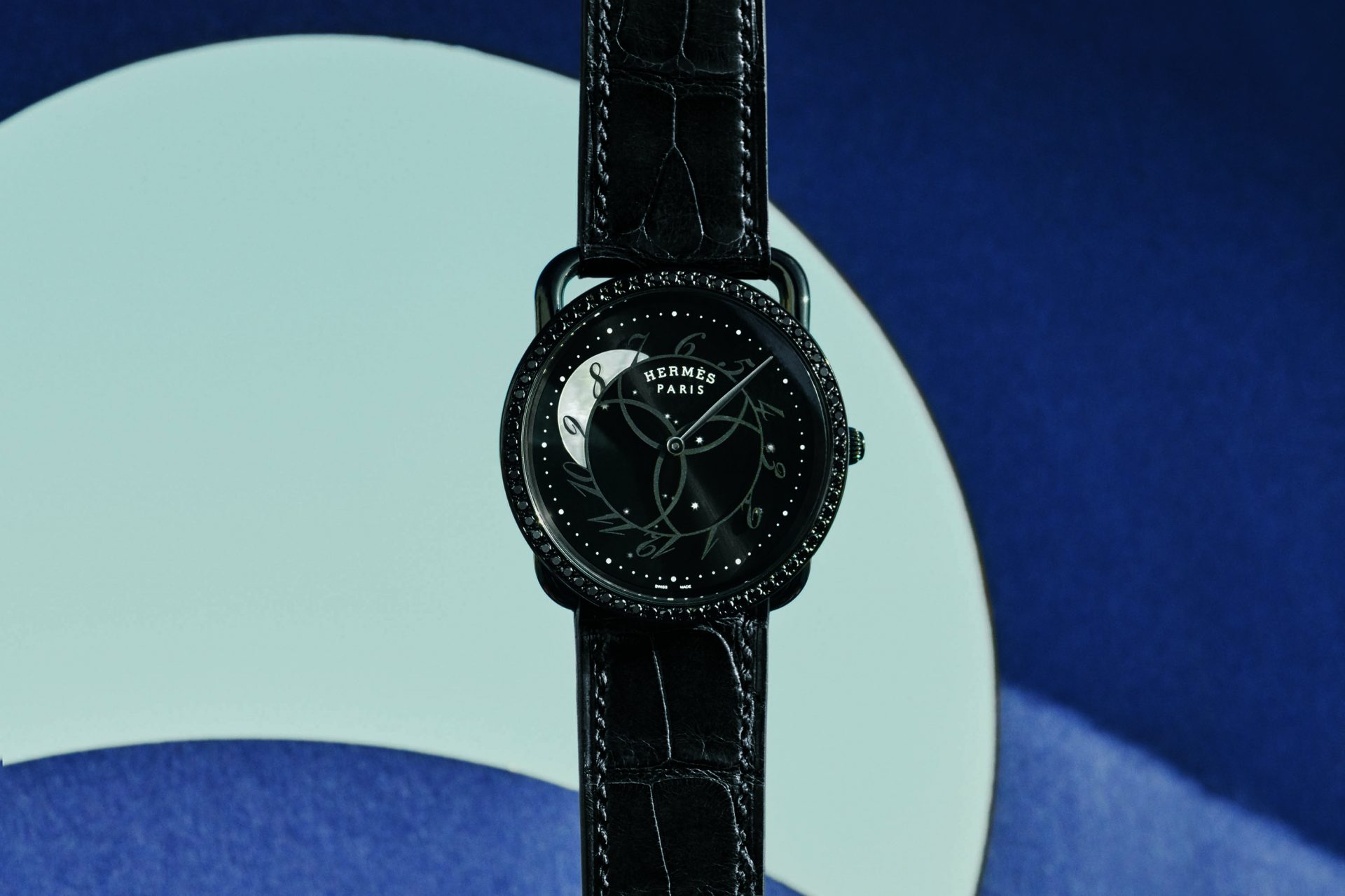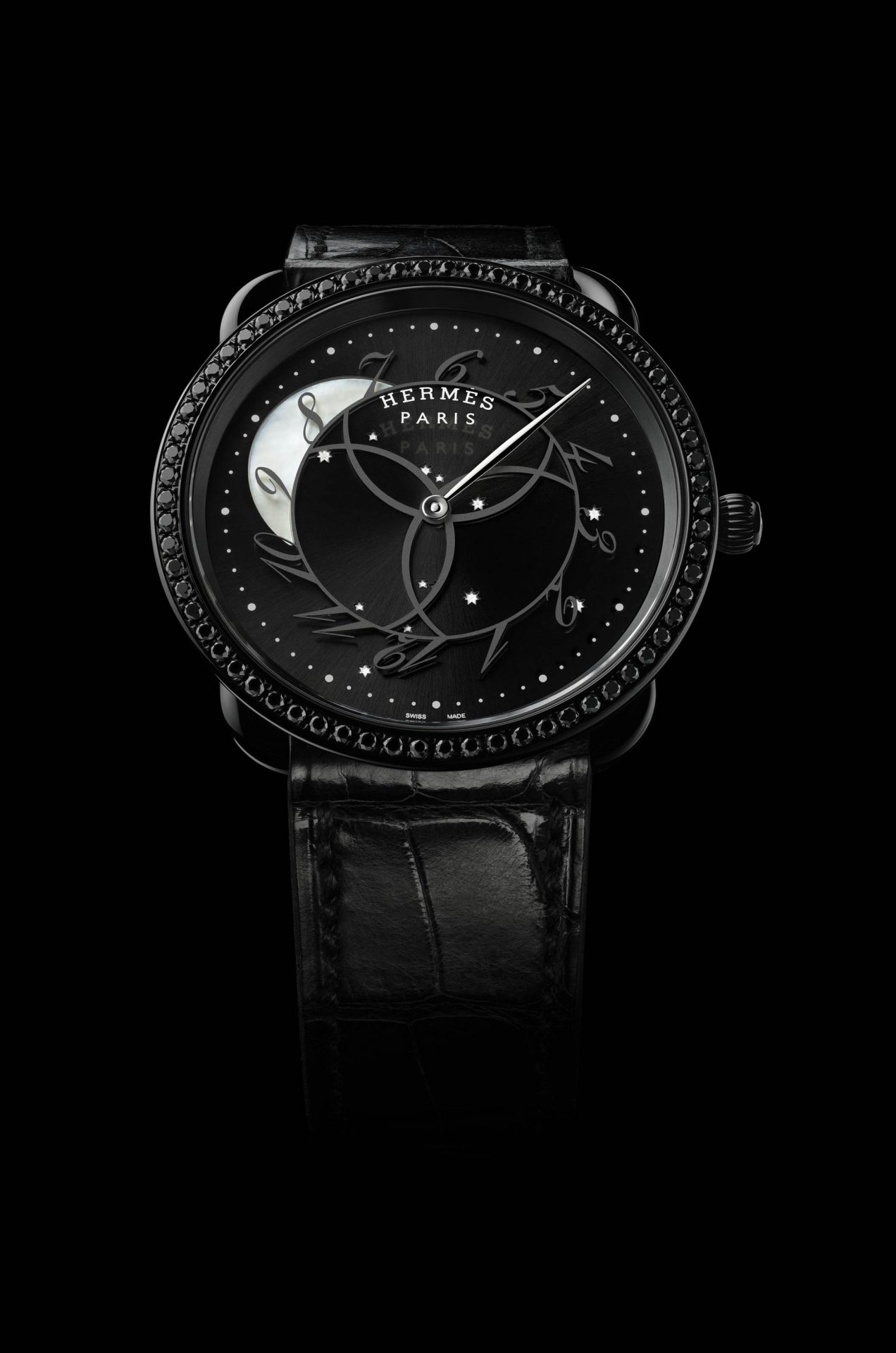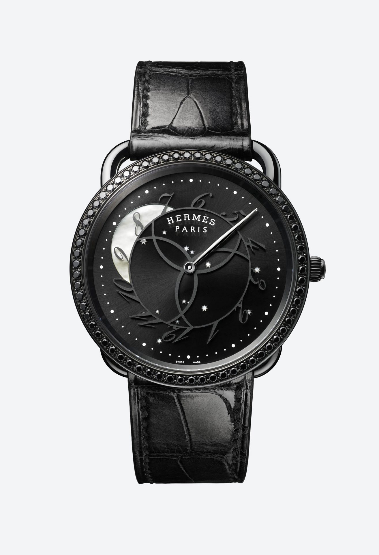Here, the Earth’s satellite itself indicates the time as the numerals whirl in the moonlight, while the minutes hand points to the distant stars of a constellation. Ever since its creation, the round case of the Arceau has rested on a rectangular stirrup, tracing a timeless silhouette. Its black bezel adorned with black spinels radiates an intense nocturnal light. Its sunburst glossy black dial is enlivened by a carousel of sloping numerals sweeping over an iridescent moon. Standing out against this radiant darkness are a moon and stars crafted in mother-of-pearl and revealed by luminescent lacquer. Issued in a limited edition of 300, the Arceau Ronde des heures watch is fastened to the wrist by a strap in black alligator crafted by Hermès artisans.